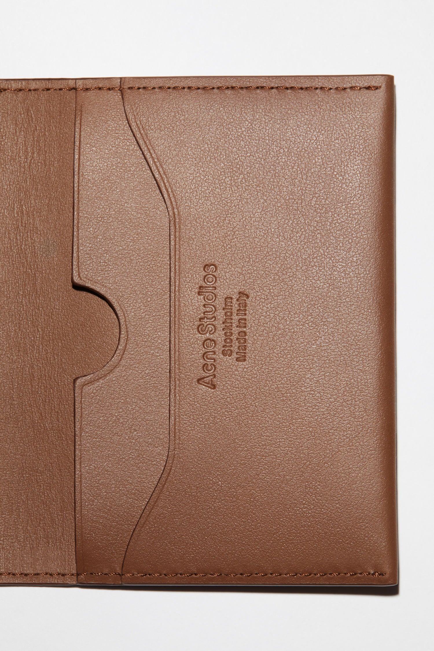 Коричневий футляр для карт Acne Studios має відкидний клапан з отворами і чотирма прорізами для карт. Виготовлений з м'якої шкіри і доповнений тисненням з логотипом Acne Studios.