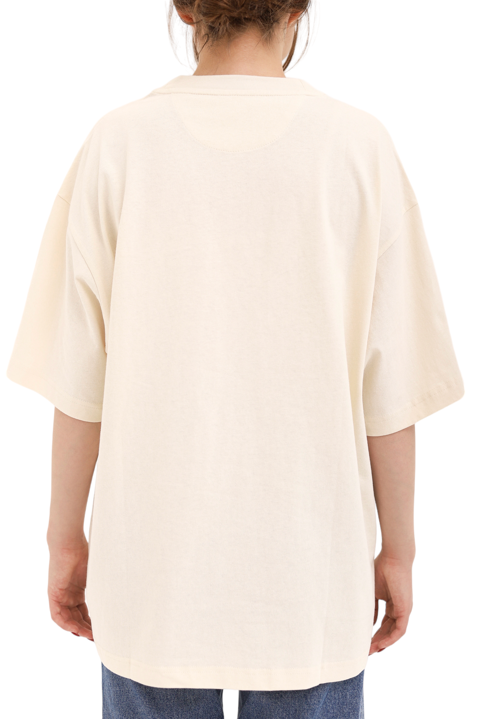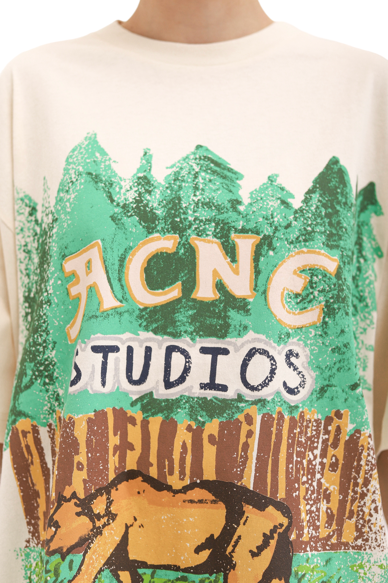 Футболка з бавовняного трикотажу з коротким рукавом бежевого кольору. Трикотажний комір з ребристим коміром. Логотип жовтого та темно-синього кольорів на грудях. Спереду багатобарвний графічний принт. Частина колаборації Acne Studios x Grant Levy Lucero.