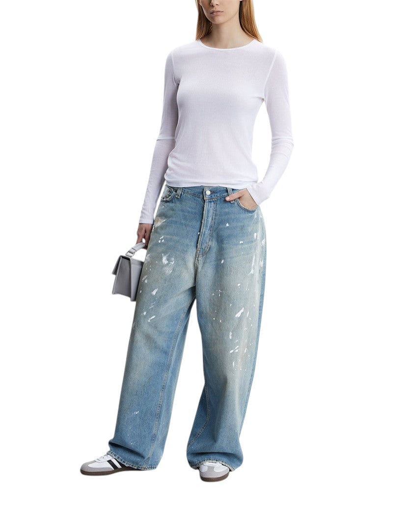 Ці джинси з мішкуватим кроєм і подовженою довжиною створюють елегантний, але розслаблений образ. Виготовлені з еластичного деніму, вони мають середню лінію талію та надширокі штанини, підкреслючи силует, а класична джинсова конструкція з 5 кишенями роблить їх практичними. Джинси виготовлені з органічно вирощеної бавовни, а нашивка на виробі з натуральної шкіри додає розкішного акценту.