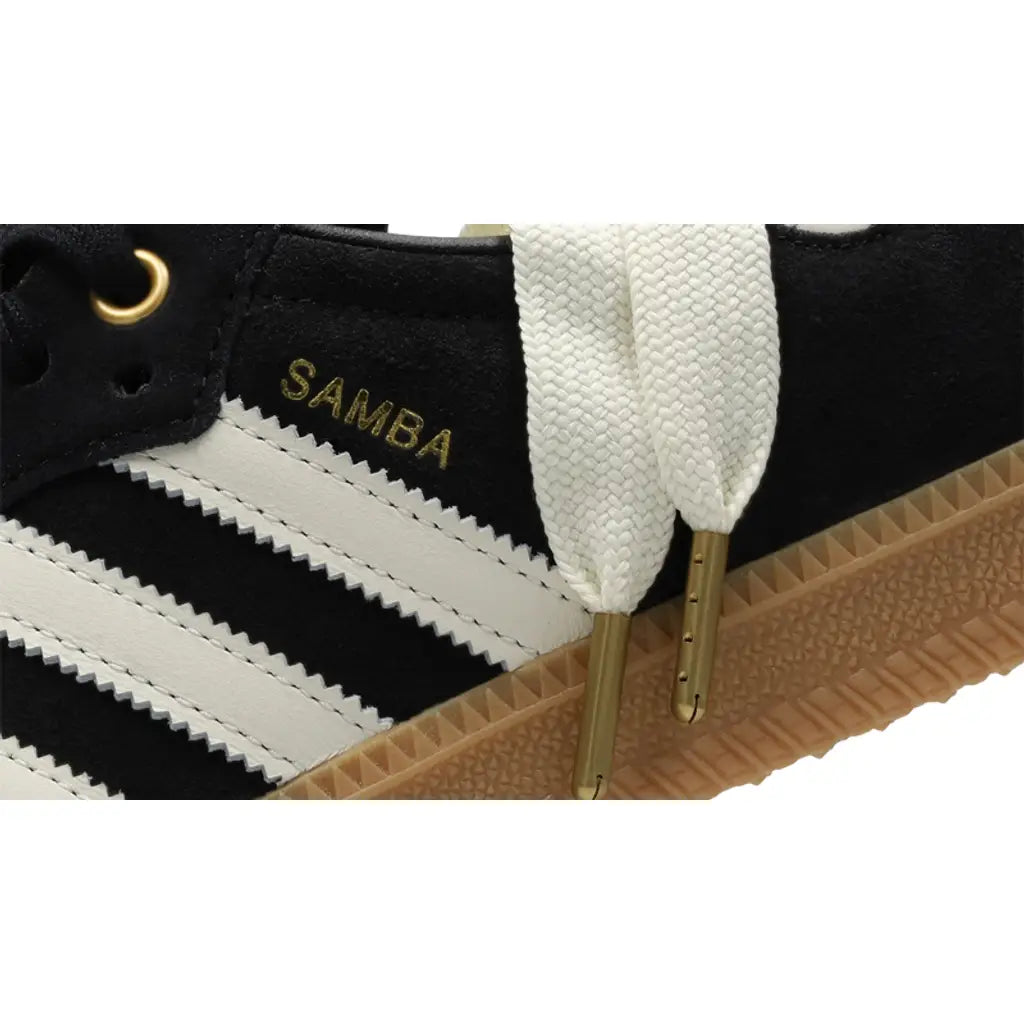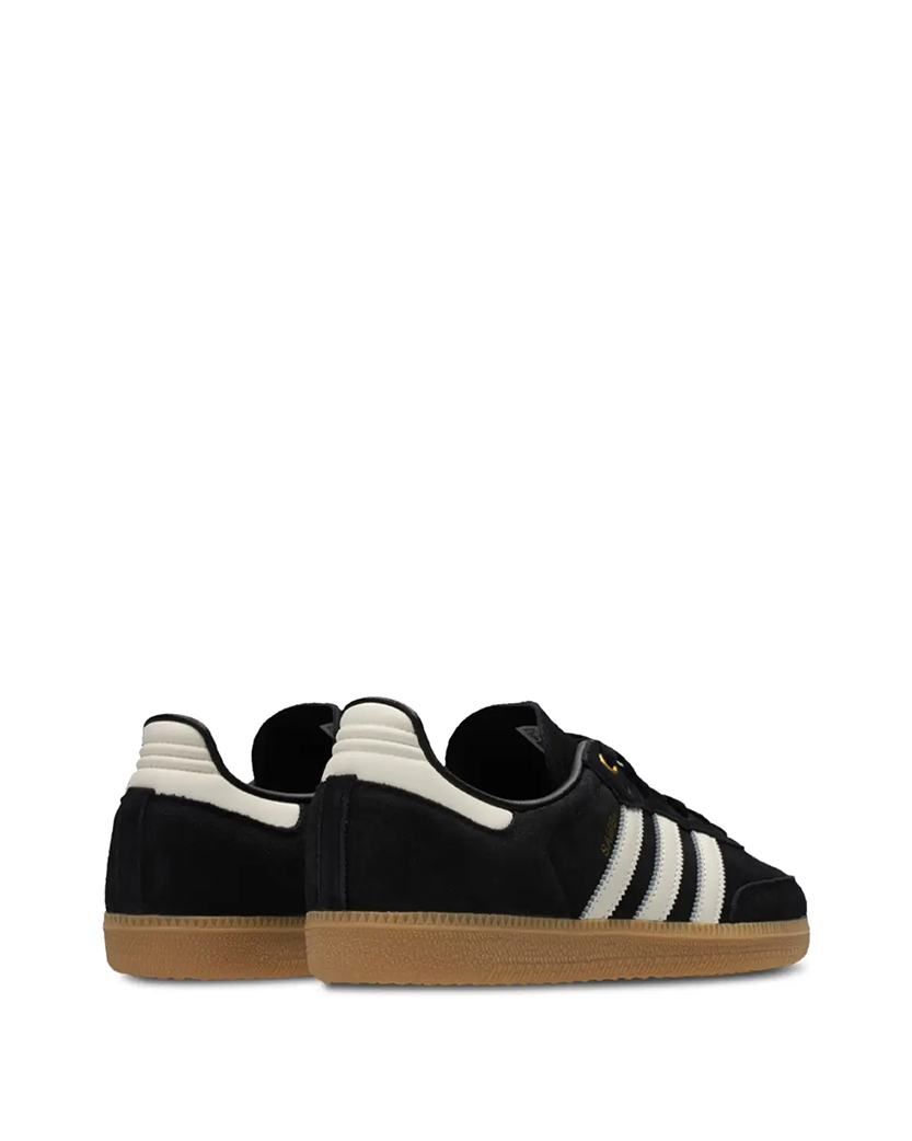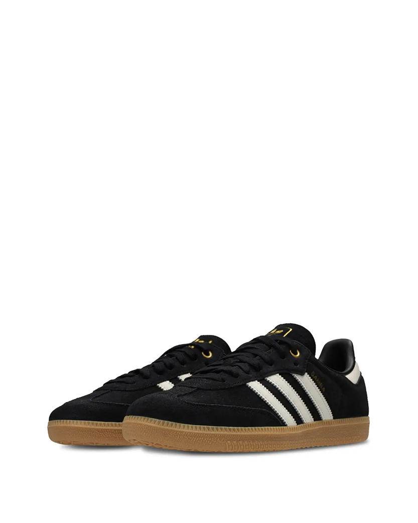 Ці класичні кросівки отримали преміальне оновлення: чорний замшевий верх, посилений Т-подібний носок, білосніжні шкіряні 3 смужки та вставка на п’яті, що додають контрасту. Розкішні золоті акценти на написі "Samba", металевому вушку та логотипі на язичку підкреслюють ювілейний статус пари. Спеціальні етикетки до 50-річчя прикрашають устілки Ortholite, а фірмова гумова підошва завершує дизайн.