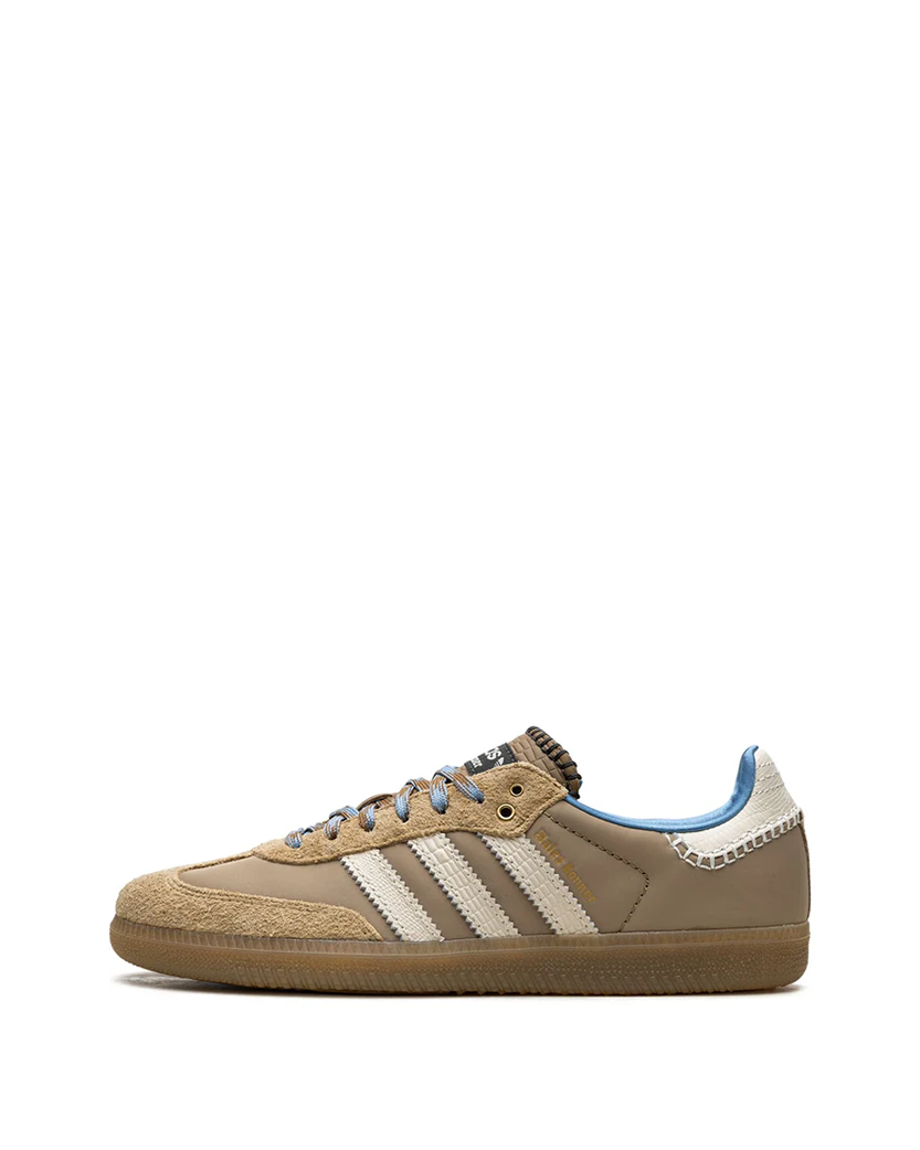 Кросівки Adidas Wales Bonner x Samba Nylon 'Desert White' мають верх з високоякісної коричневої шкіри, що ідеально поєднується з елегантними замшевими панелями тон в тон, які додають моделі глибини та текстури. Характерні деталі, такі як знакові три смужки та престижний логотип Wales Bonner, додають нотку вишуканості та свідчать про увагу до деталей, характерну для цієї висококласної колаборації.