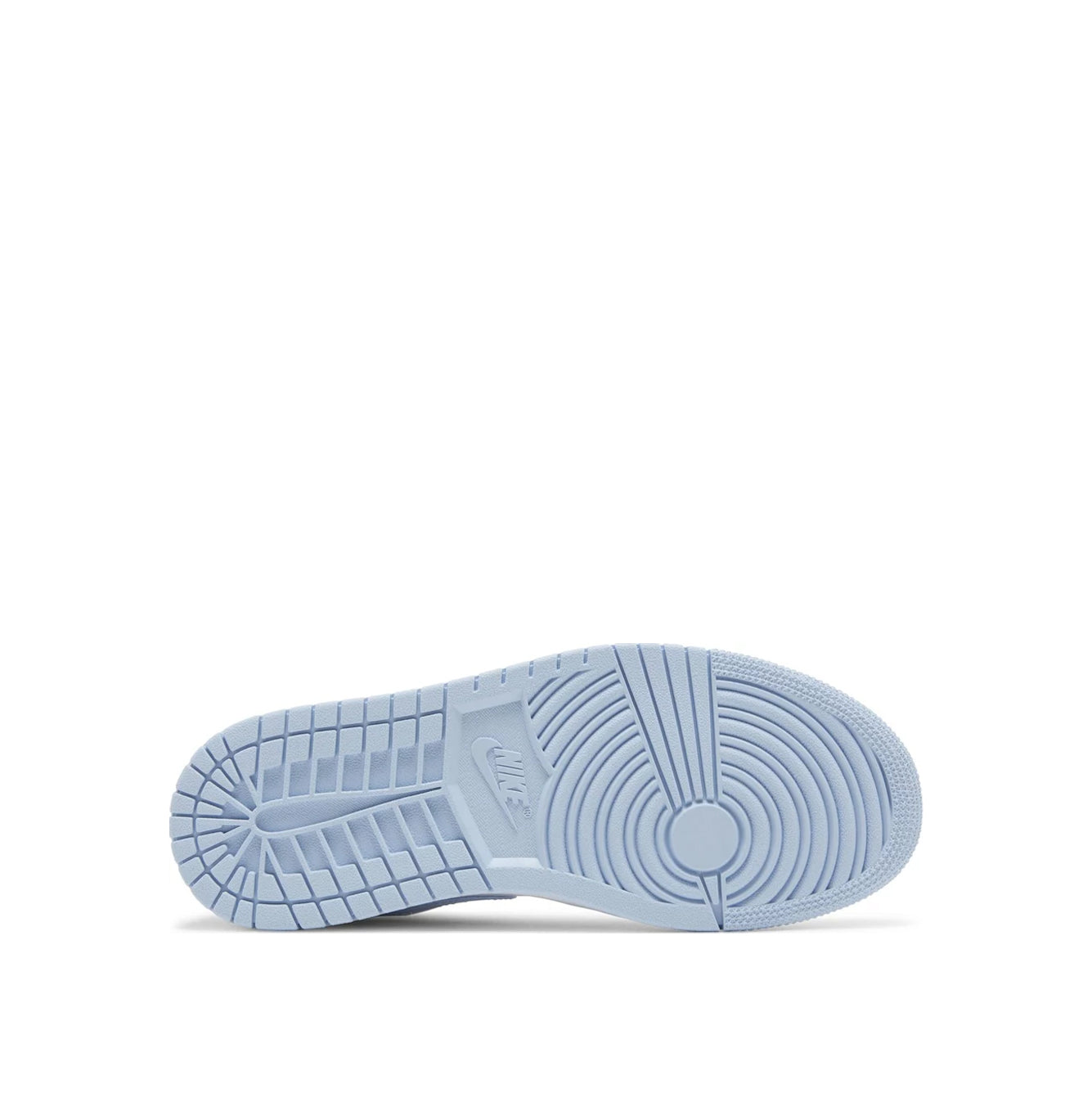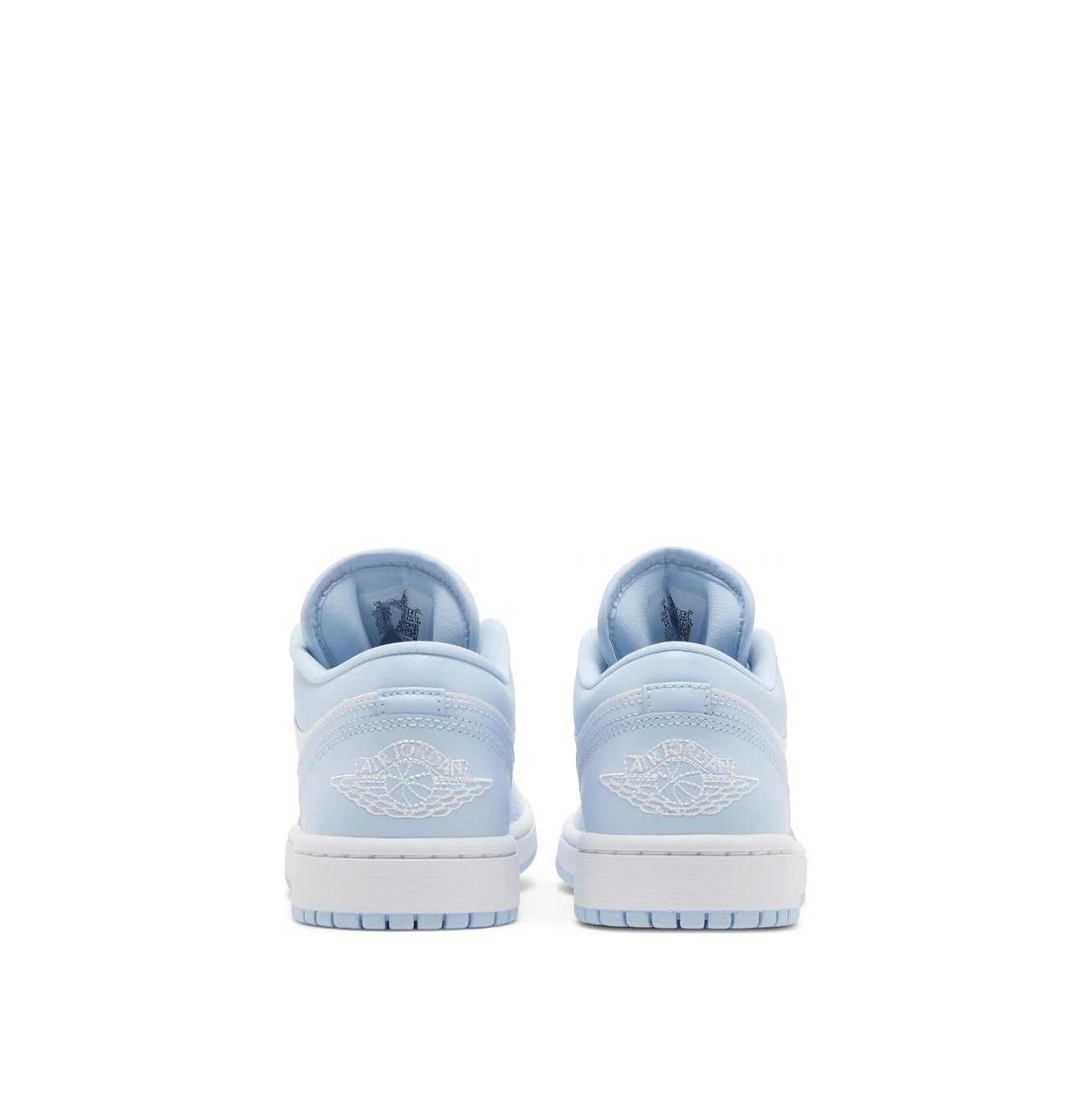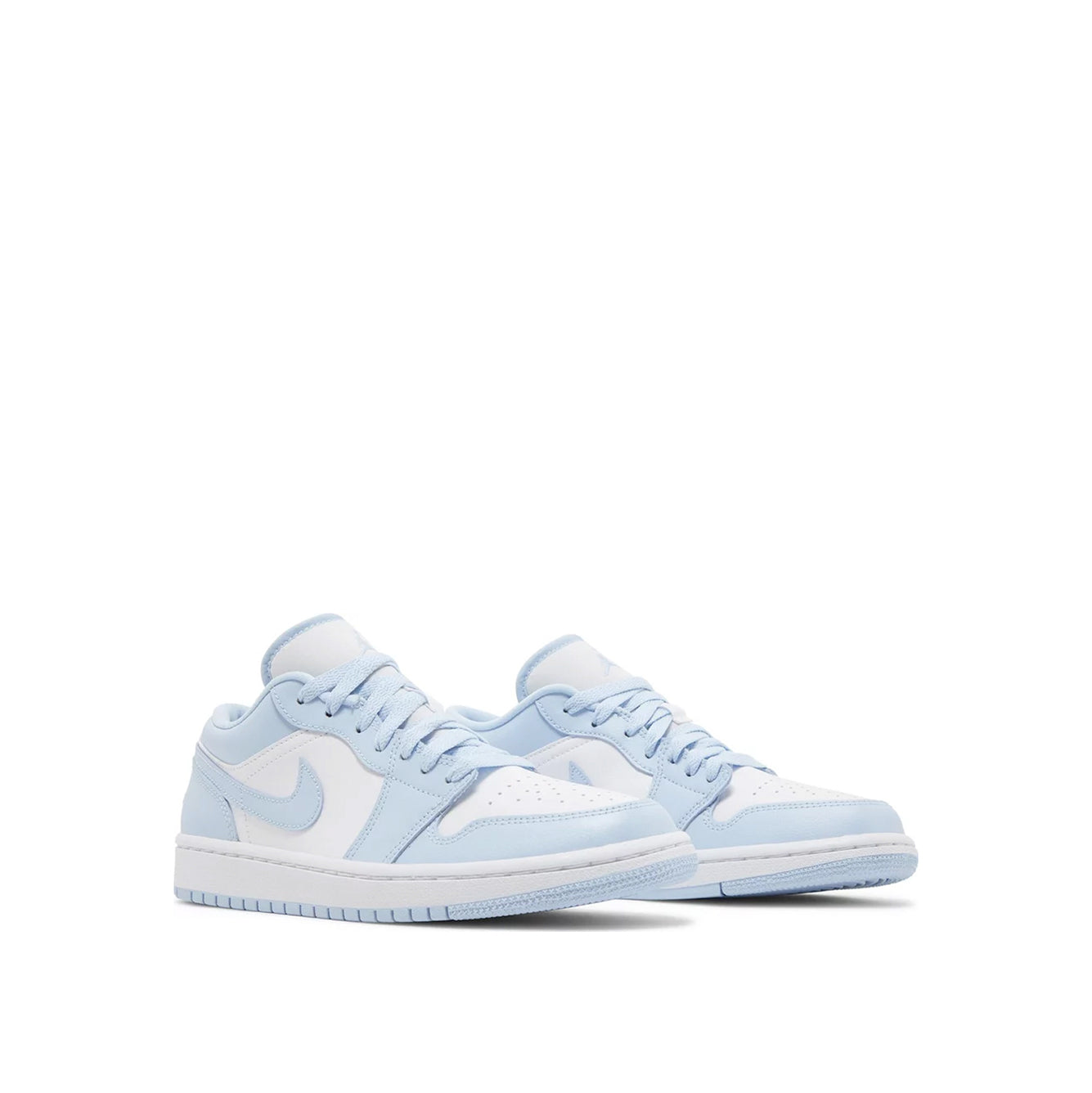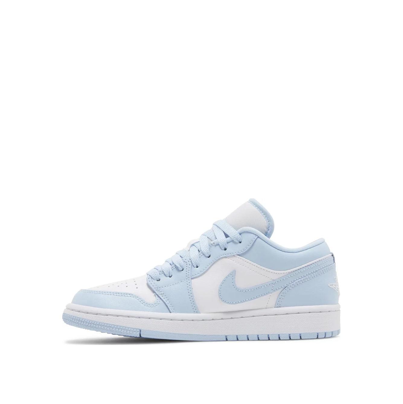 Жіночі кросівки Air Jordan 1 Low 'Ice Blue' вдягають в себе вічний силует в простий двокольоровий дизайн. Гладка шкіряна конструкція використовується на верхі, зі сніжно-білою основою, яка прикрашена яскраво-синіми накладками і Swoosh у відповідному кольорі. Зшитий логотип Wings прикрашає п'яту, тоді як вишитий іконка Jumpman прикрашає язик. Кросівки розташовані на міцній гумовій підошві з подушкою Air-sole, закапсульованою в п'ятці.