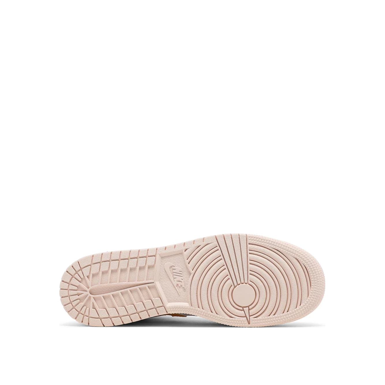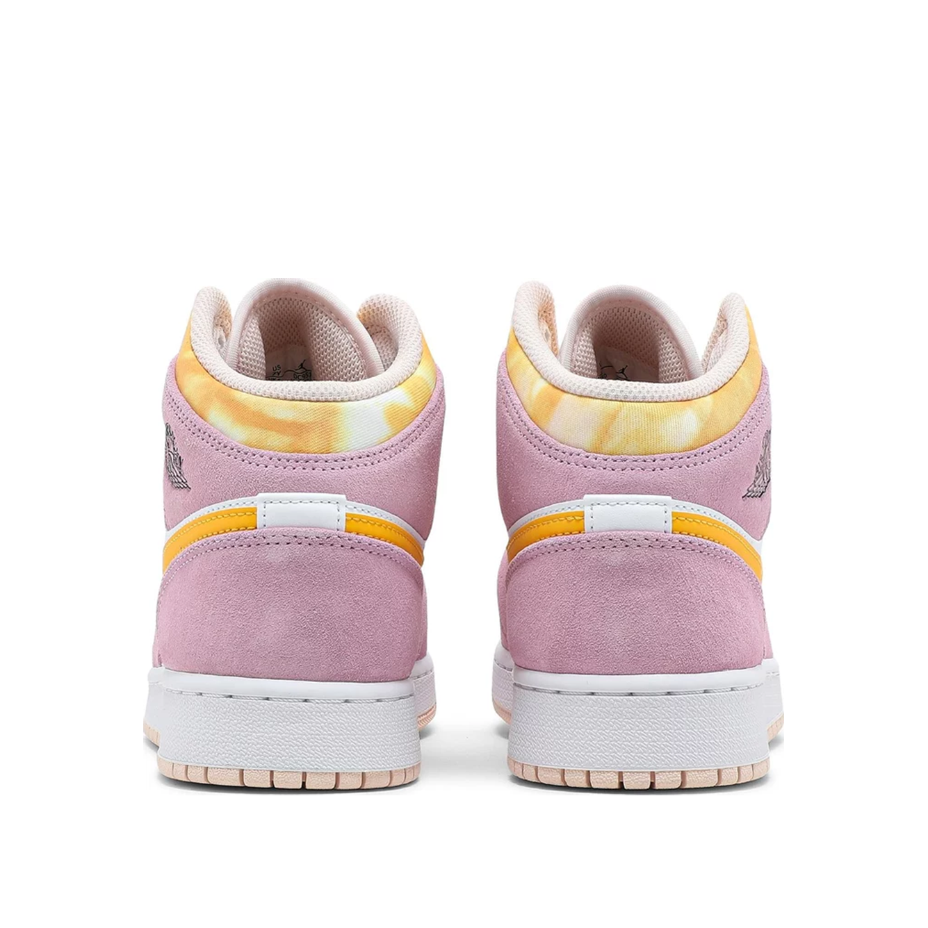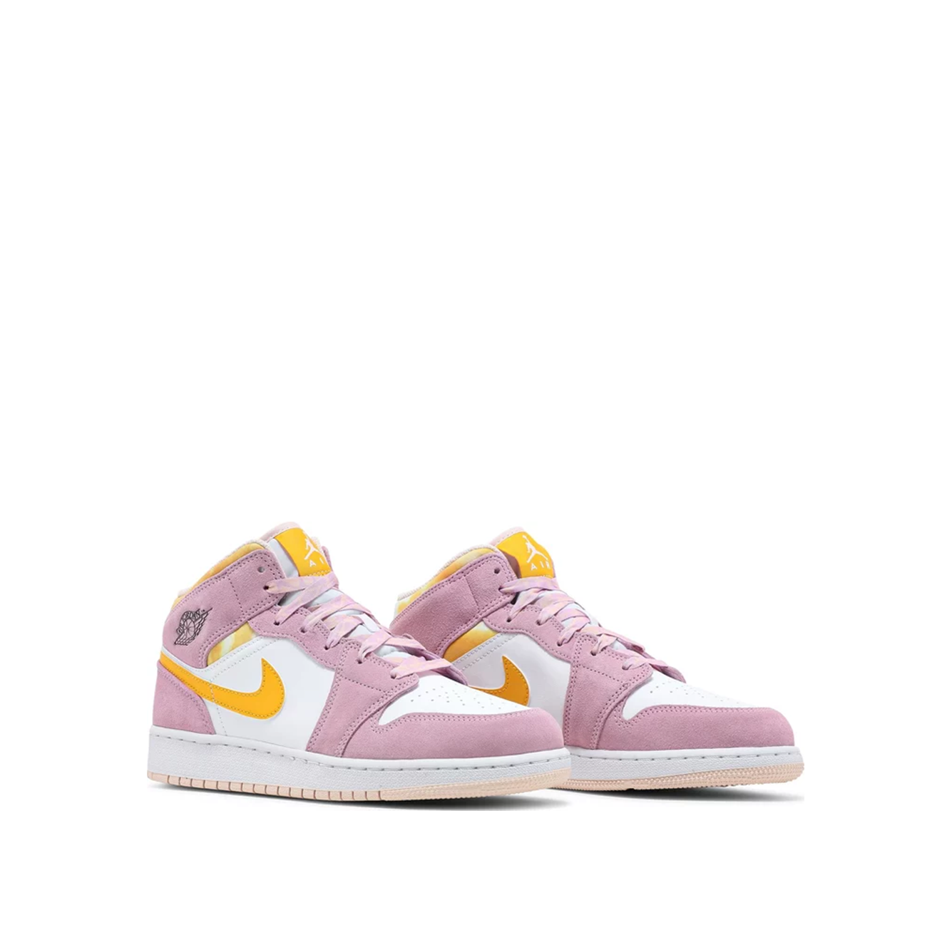 Верх кросівок виготовлений з білої шкіряної основи та замшевих накладок рожевого кольору. З боків з'являється напис Swoosh у відтінку University Gold. Відтінки університетського золота також помітні на нейлоновому комірі та язичковому ярлику з брендингом Jumpman. Особливі деталі включають логотип "Wings", прикрашений на комірі чорним кольором, перфоровану носкову частину та шнурки арктичного рожевого та жовтого кольорів з барвником для краваток. Взуття стоїть на білій проміжній підошві та пастельно-рожевій підошві.