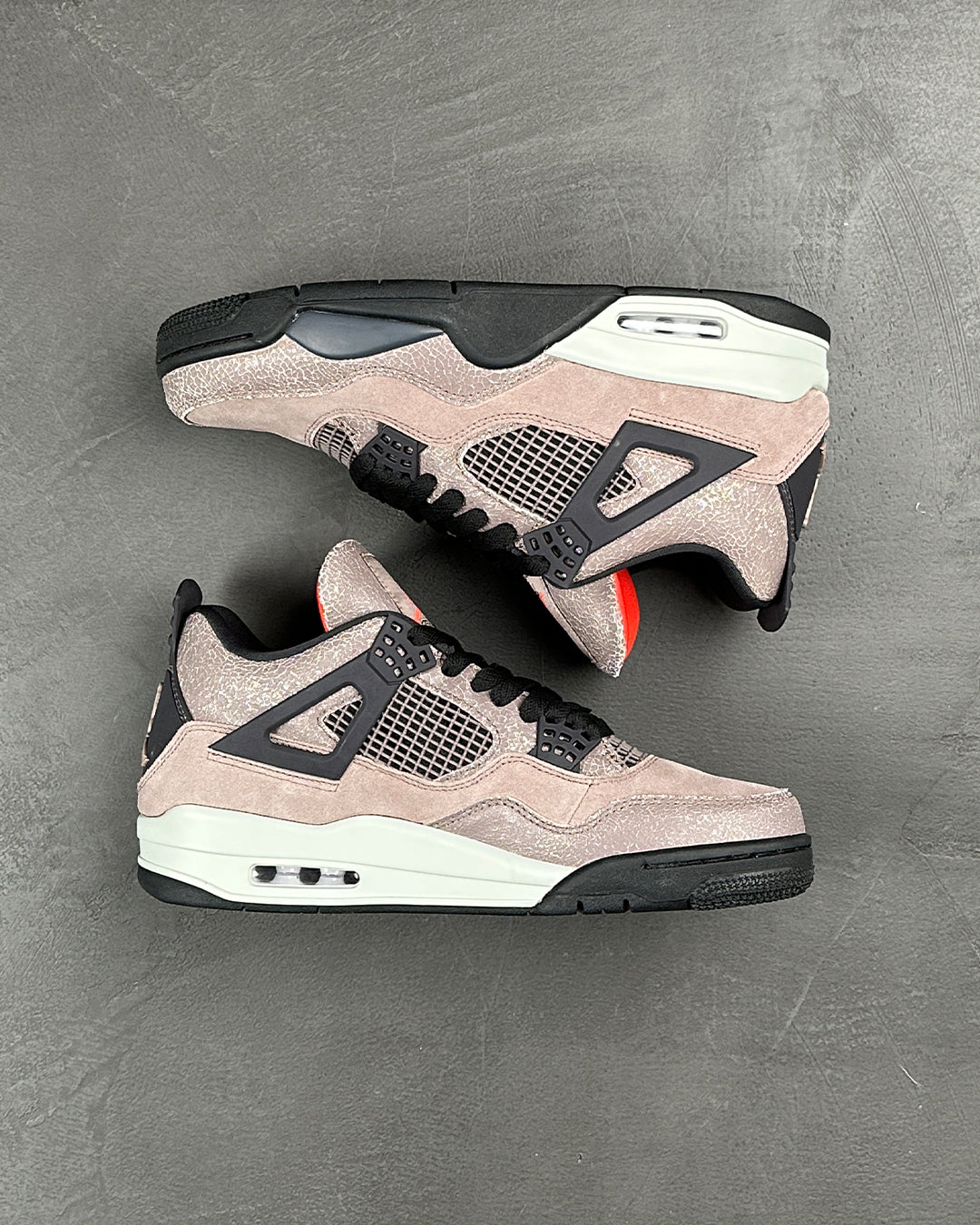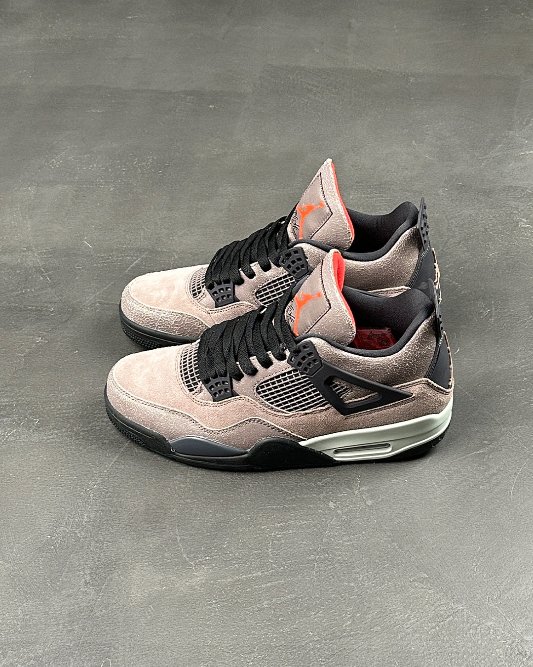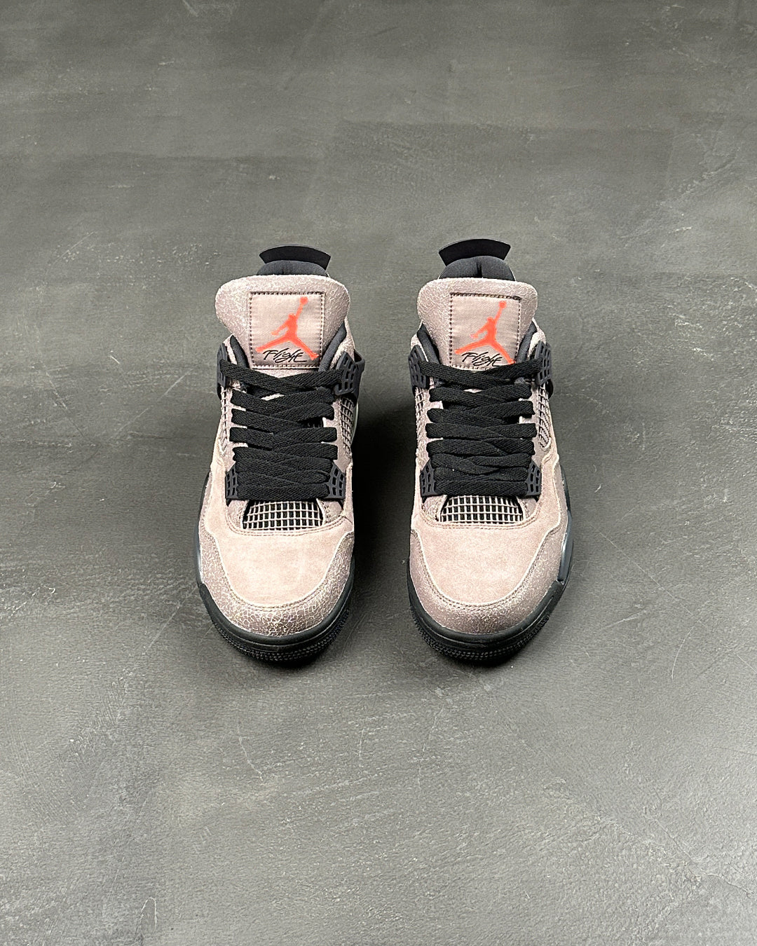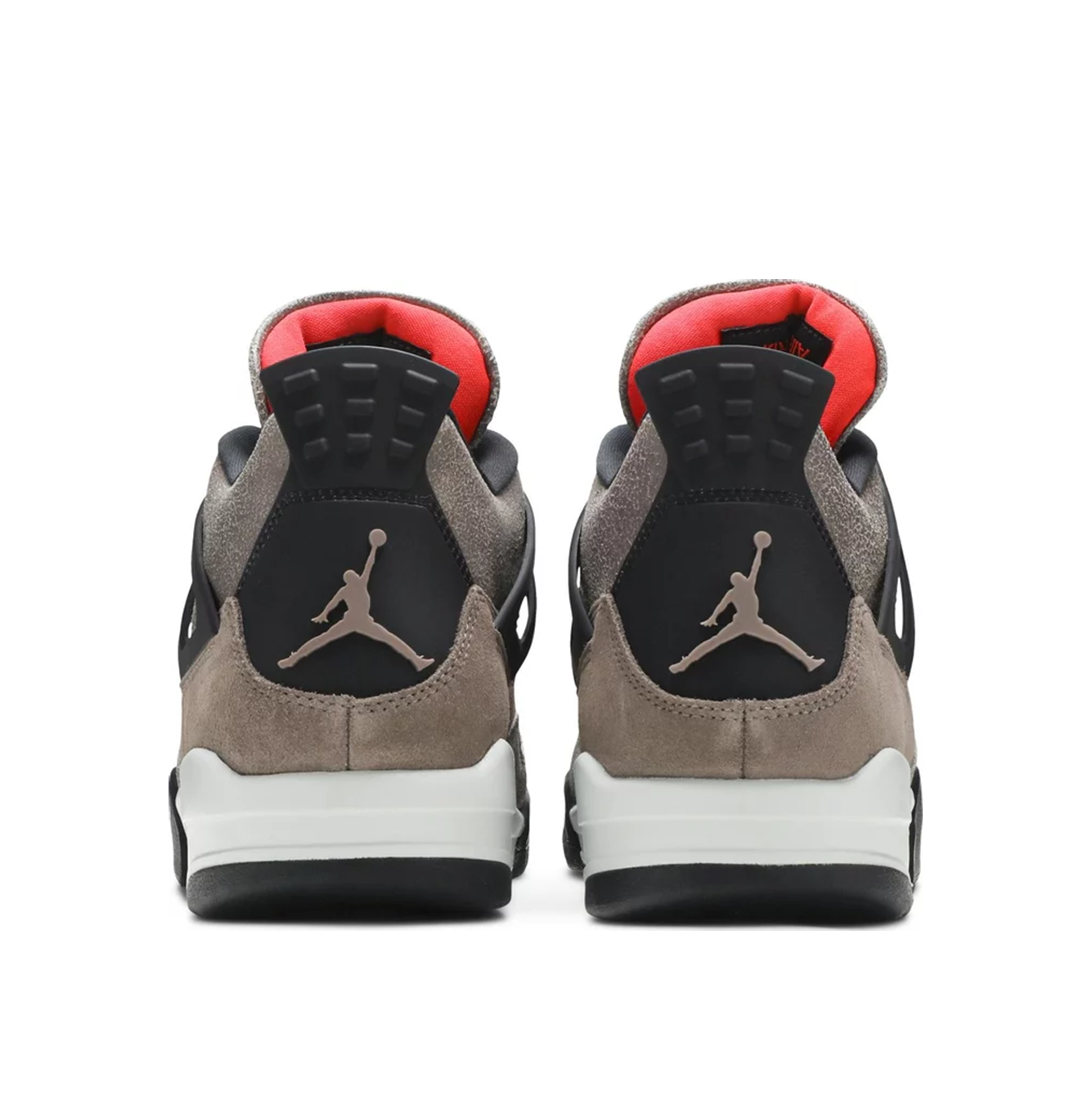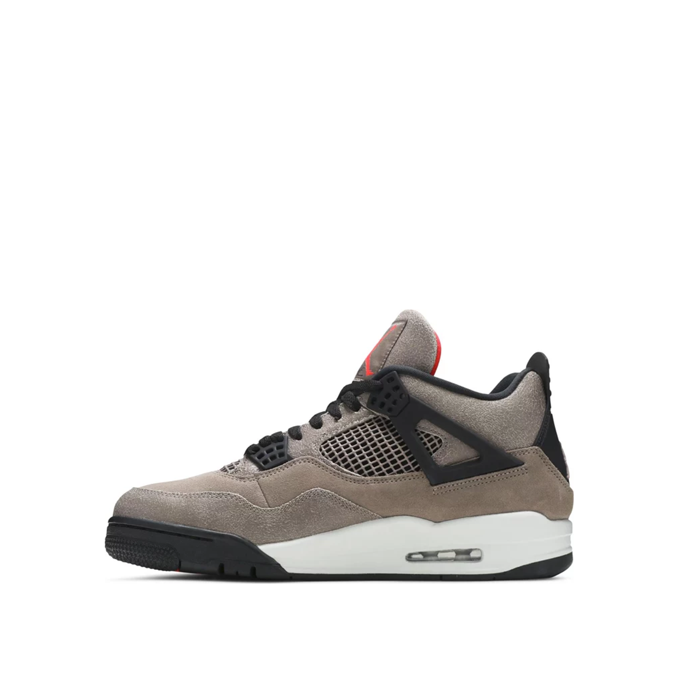 Air Jordan 4 Retro 'Taupe Haze' представляє стриману кольорову гаму дизайну Тінкера Хетфілда 1989 року. Темно-сірий колір нанесений на верхню частину кросівок, виготовлену із суміші текстурованої замші та потрісканої шкіри на комірі, язичку та бризковику. Контрастні чорні вставки приземляються на шнурки, пластикові крила та п'ятку, на якій розміщено рельєфний логотип Jumpman. Другий значок Jumpman відображається в інфрачервоному діапазоні на бирці язичка, що відповідає внутрішній підкладці язичка. Легку амортизацію забезпечує двоколірна підошва з поліуретану, що містить видиму повітряну вставку в п'яті та інкапсульовану повітряну вставку в передній частині стопи.
