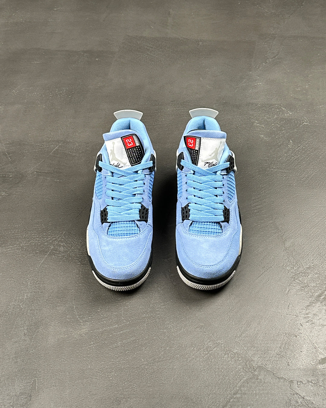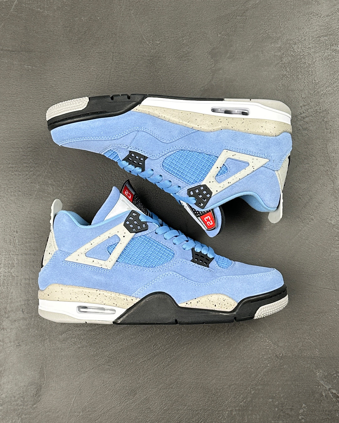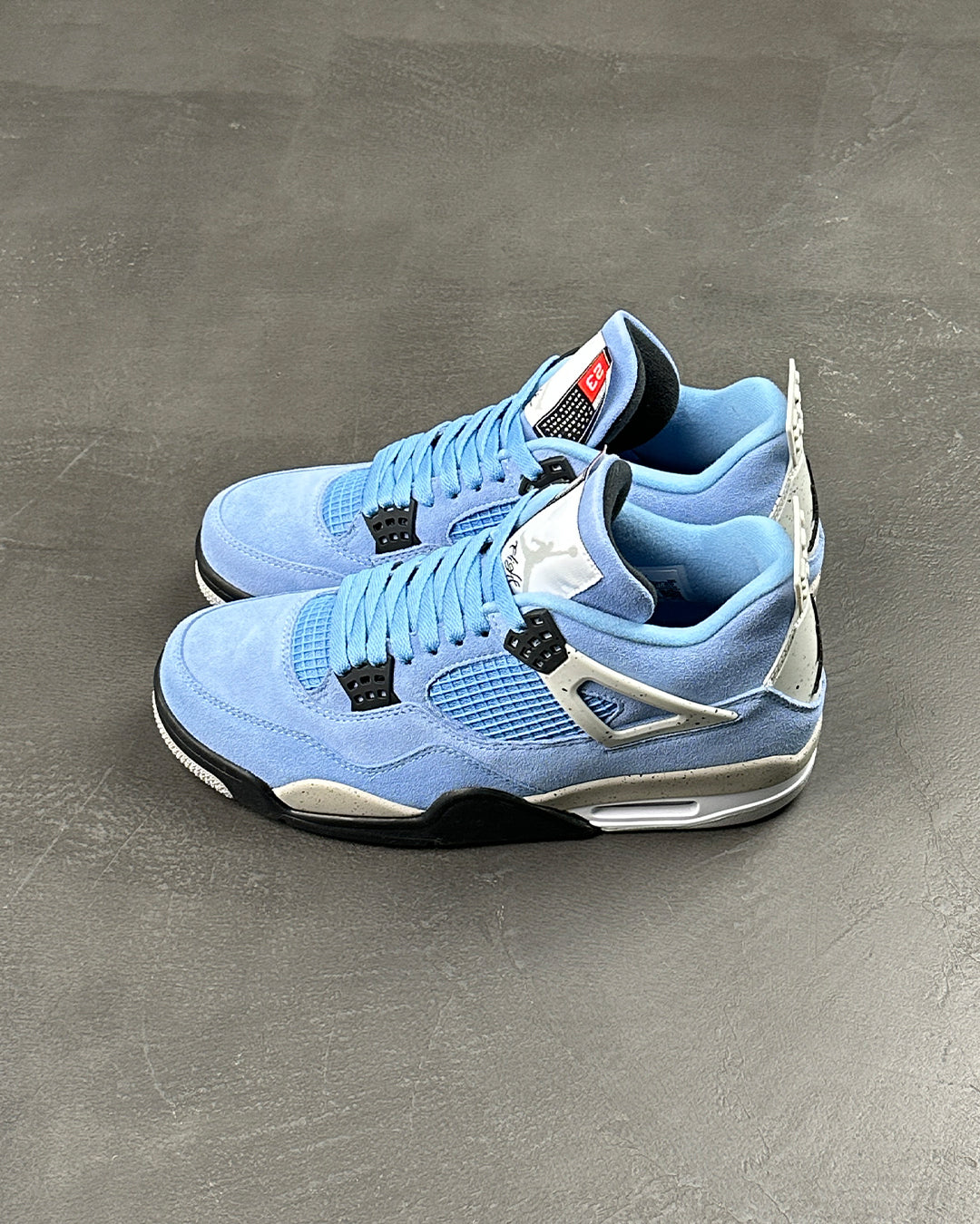 Air Jordan 4 Retro 'University Blue' оновлює класичний силует завдяки замшевому верху знайомого відтінку, натхненного альма-матер Майкла Джордана в Університеті Каліфорнії. Яскраво-синя палітра контрастує з сірим крапчастим покриттям на крилах і задній частині п'яти, де розміщено рельєфну іконку Jumpman чорного кольору. Вторинний брендинг Jumpman прикрашає плетений язичок, що імітує бірку спортсмена, яка зазвичай з'являється на нижньому подолі футболок Jordan.