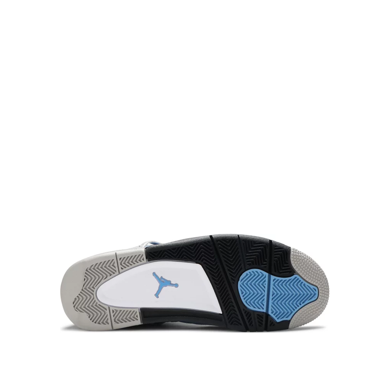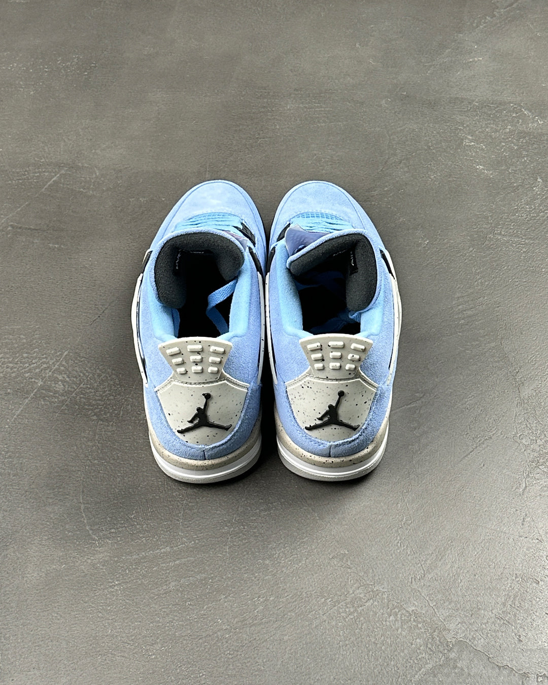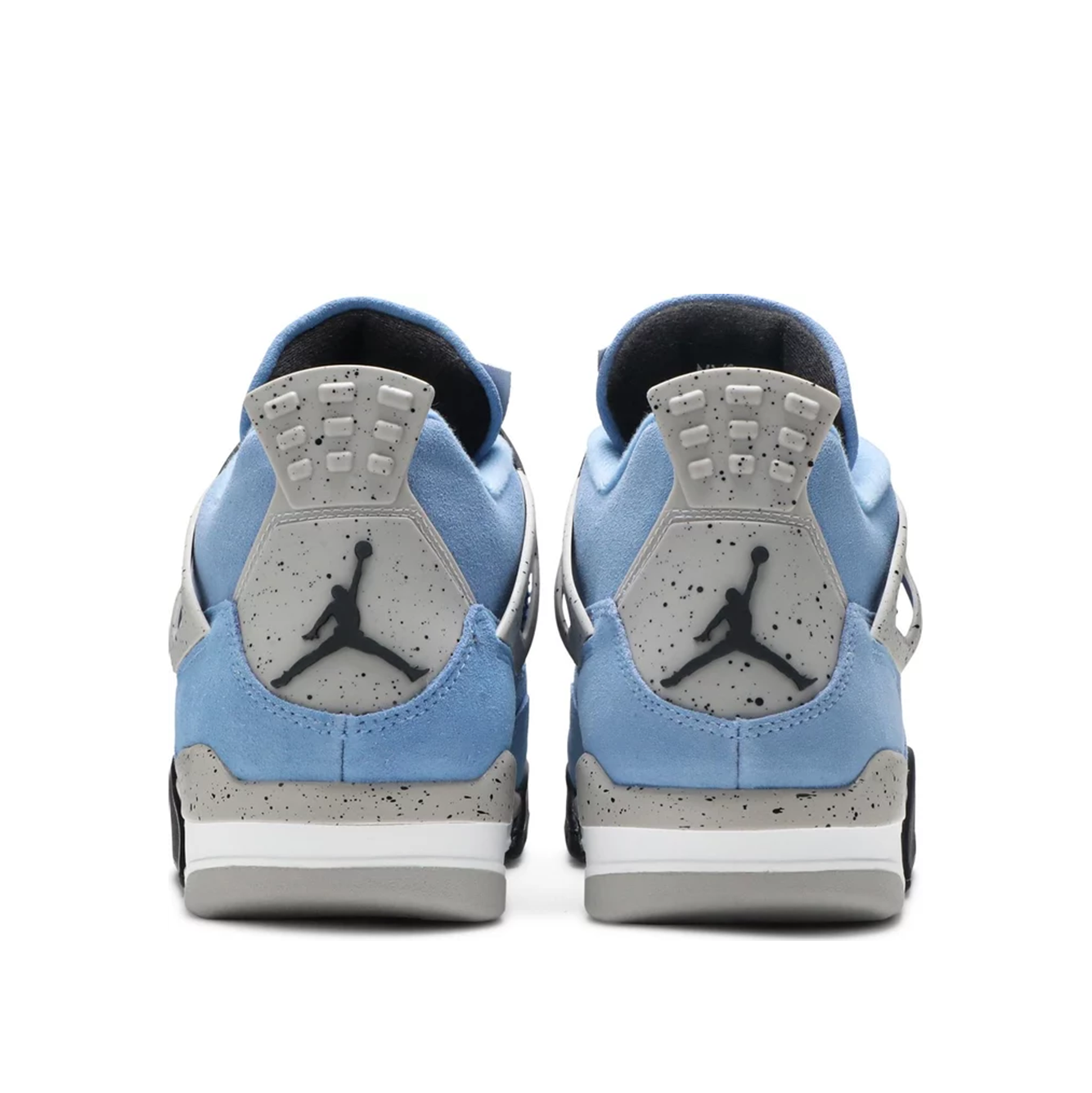 Air Jordan 4 Retro 'University Blue' оновлює класичний силует завдяки замшевому верху знайомого відтінку, натхненного альма-матер Майкла Джордана в Університеті Каліфорнії. Яскраво-синя палітра контрастує з сірим крапчастим покриттям на крилах і задній частині п'яти, де розміщено рельєфну іконку Jumpman чорного кольору. Вторинний брендинг Jumpman прикрашає плетений язичок, що імітує бірку спортсмена, яка зазвичай з'являється на нижньому подолі футболок Jordan.
