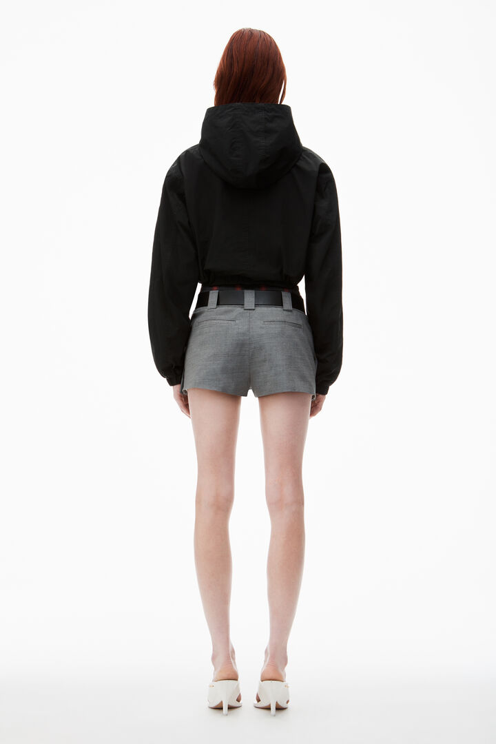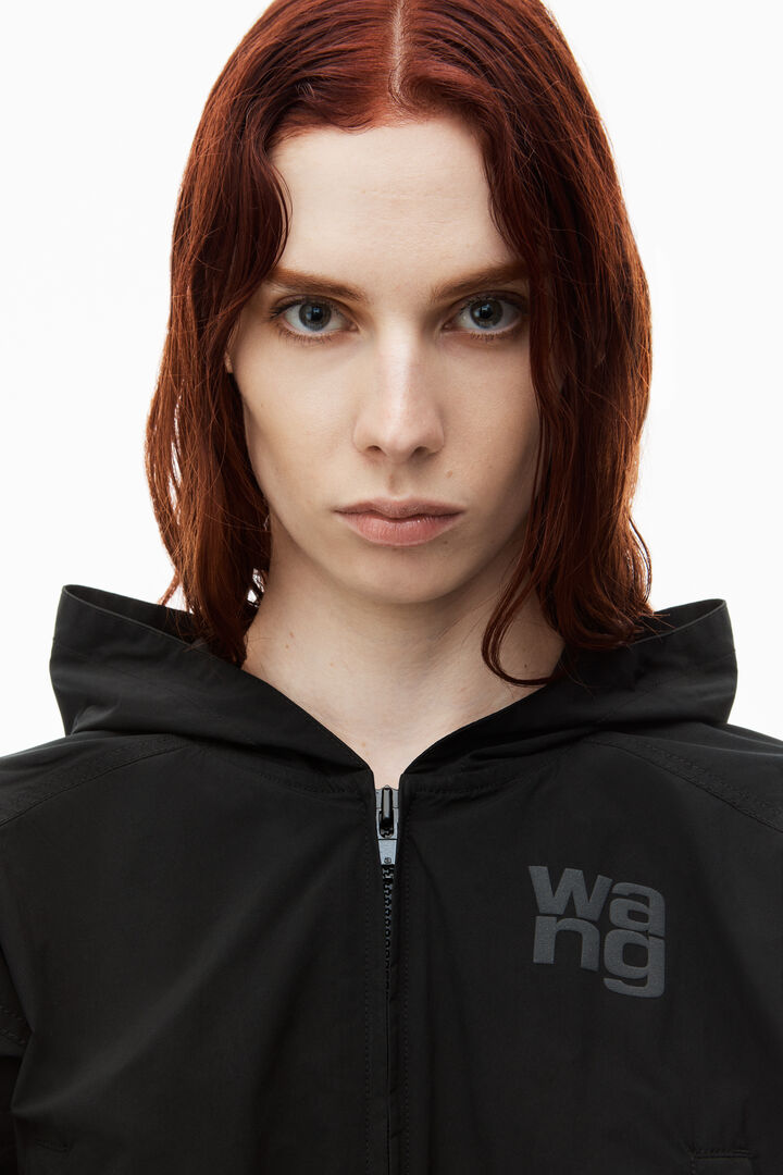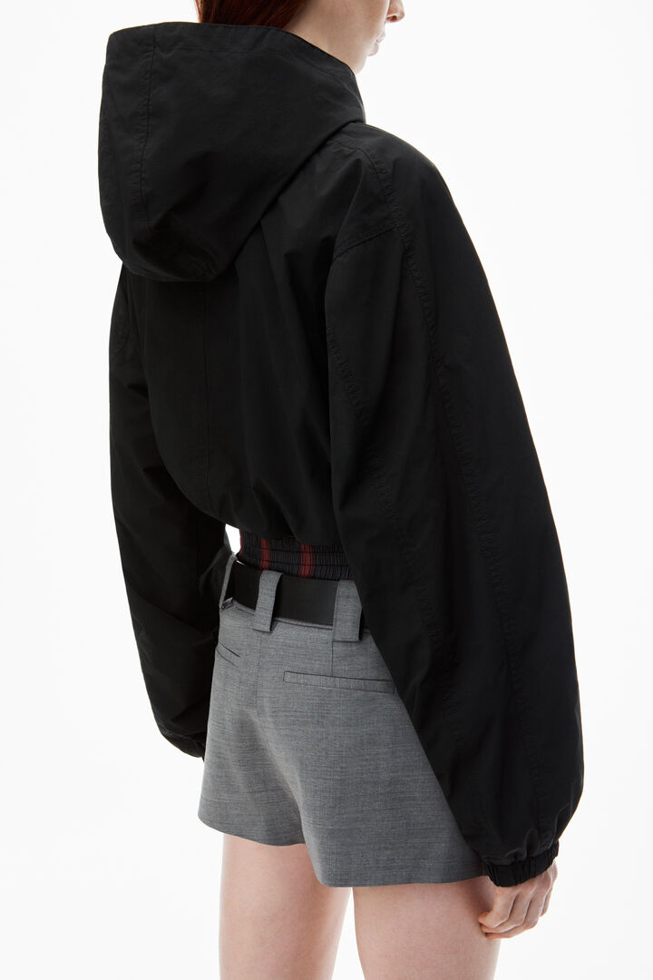 Ця укорочена куртка-бомбер з чорного нейлону має капюшон і бічні кишені, що надають їй стильного вигляду. Застібається на застібку-блискавку, має підкладку зі спортивної сітки, посилену верхню строчку, еластичні манжети та поділ. Вільний крій забезпечує комфорт і зручність у носінні.