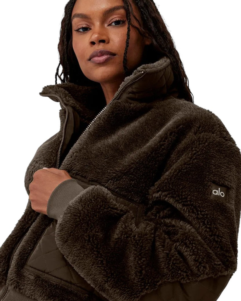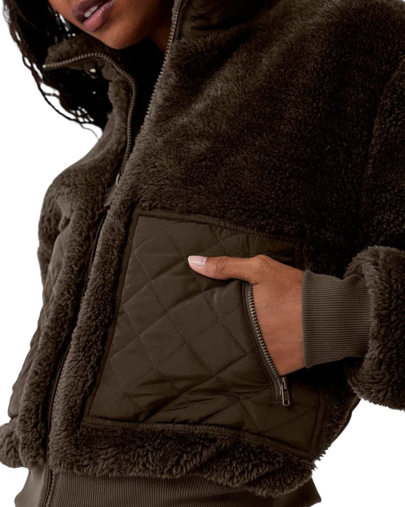 Ця куртка-бомбер — стильна та зручна річ, яка чудово підходить для створення модних образів у прохолодну погоду. Вона має стьобані накладки на кишенях, ліктях і спині, що додає текстурного контрасту та підкреслює її спортивний характер. Класичний силует, ребристий поділ і манжети забезпечують комфортну посадку. Куртка ідеально підходить для активного способу життя. Кишені на блискавці додають функціональності, а матеріал — пухнаста шерсть шерпа (100% поліестер) — забезпечує тепло та комфорт.