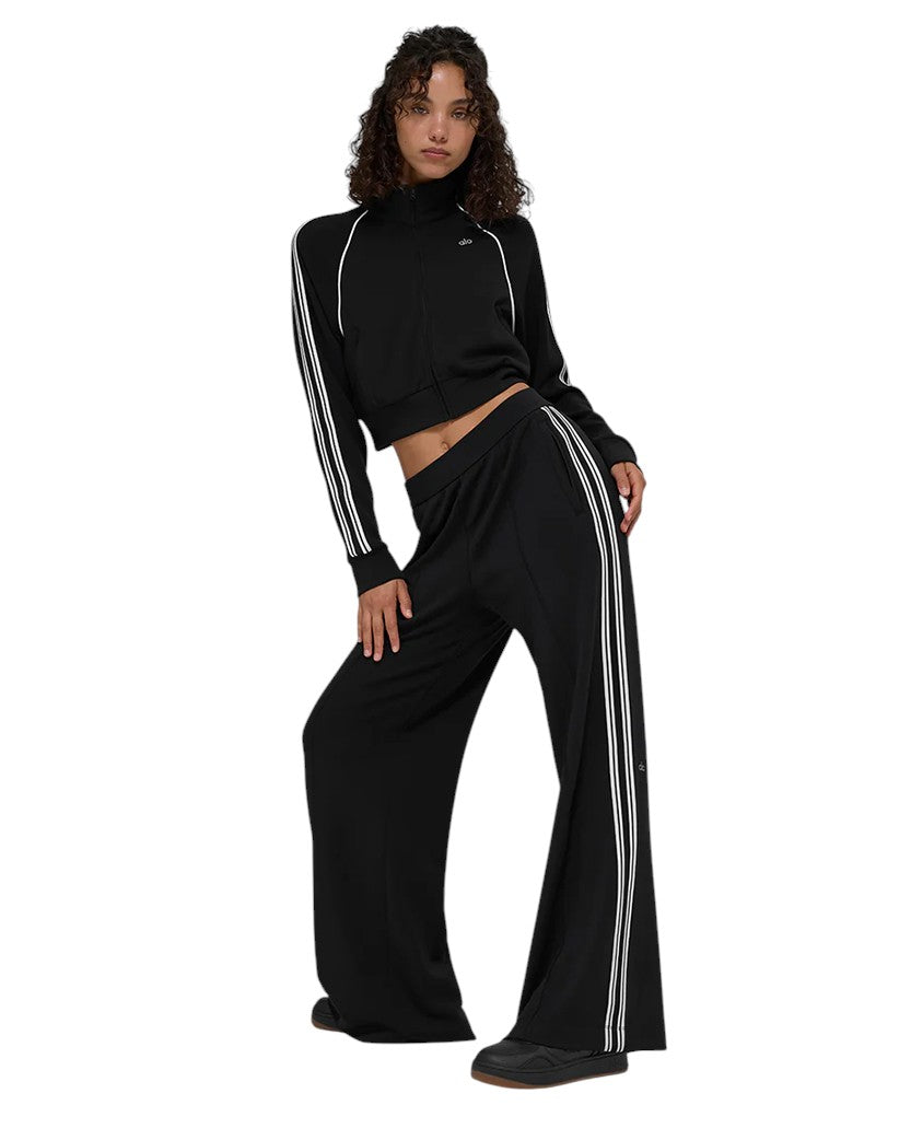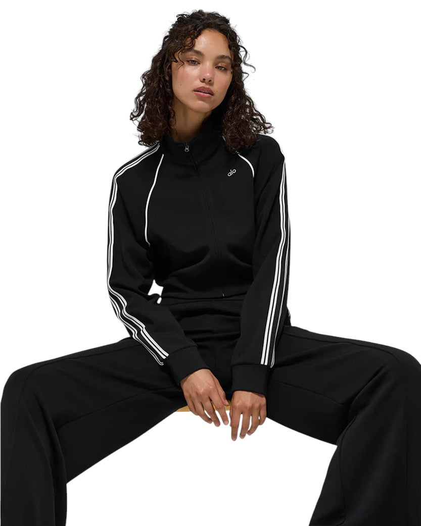 Alo Yoga Track Star Full-Zip Jacket — це стильна укорочена куртка, яка миттєво додає образу виразності та структури. Модель із високим коміром і повною застібкою-блискавкою підкреслює талію та візуально подовжує силует. Контрастні бокові смуги створюють динамічний акцент, надаючи спортивного шарму.
