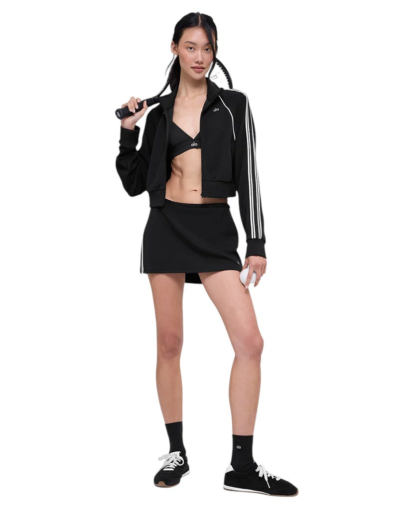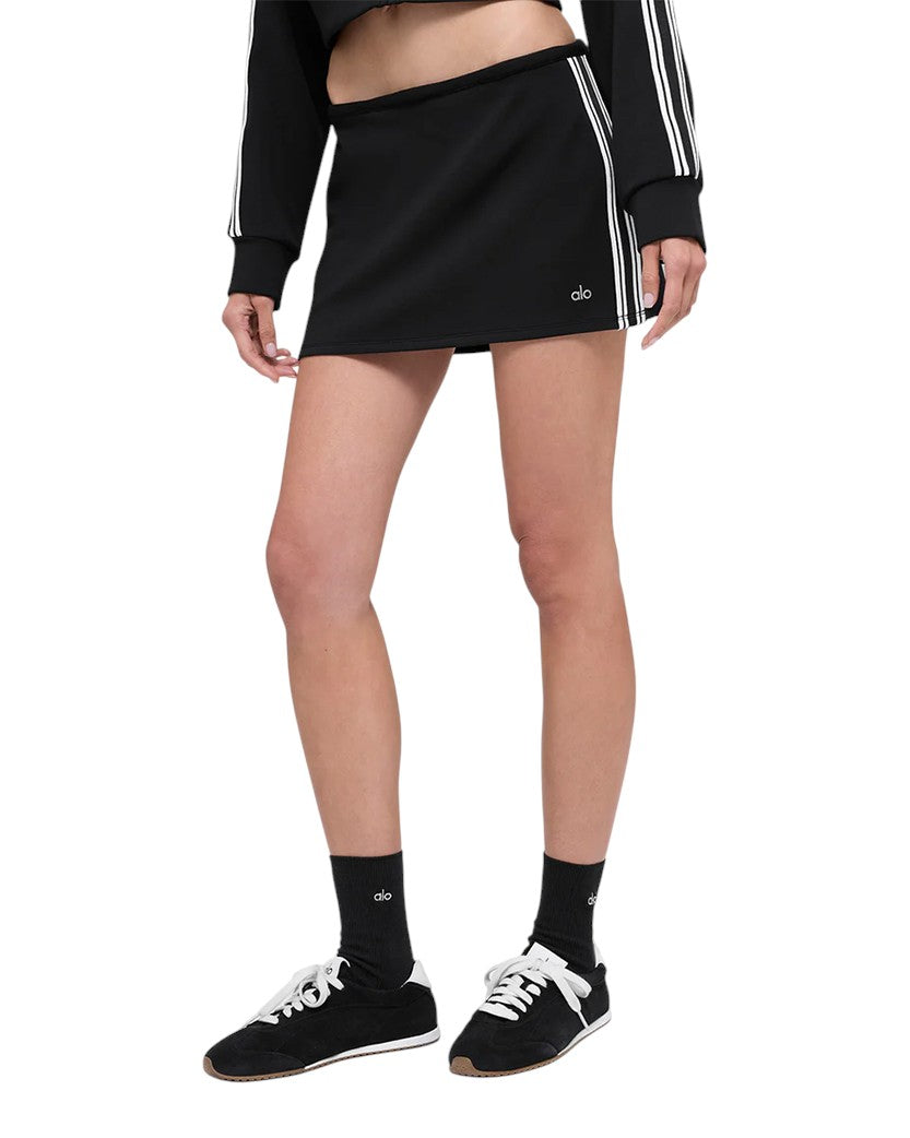 Alo Yoga Track Star Mini Skirt — це стильна мініспідниця у спортивному стилі, яка поєднує динамічний дизайн і комфорт. Модель має чистий, лаконічний силует із контрастними боковими смугами, що візуально подовжують ноги та додають образу виразності. Посадка середньої висоти плавно переходить у злегка занижену, що робить спідницю універсальною для поєднання з кроп-топами або укороченими худі.