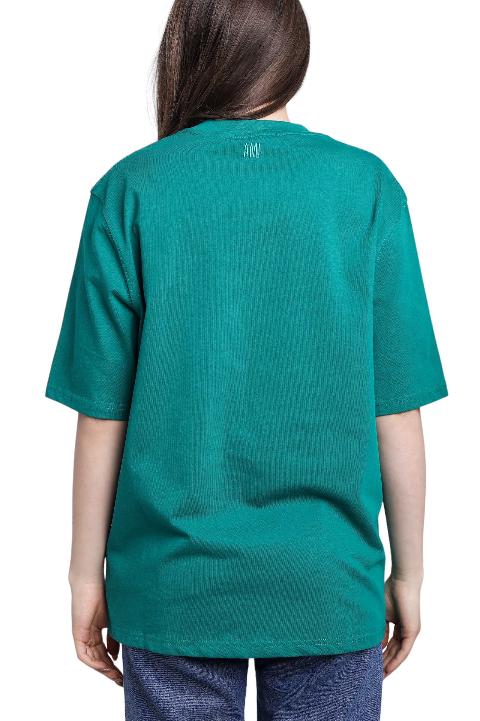 Футболка від AMI Paris з органічного бавовняного трикотажу з коротким рукавом. Вільний крій, спущені плечі та ребристий виріз горловини. На грудях вишитий логотипом бренду люрексовими нитками. Вишитий логотип у тон на задньому комірі.