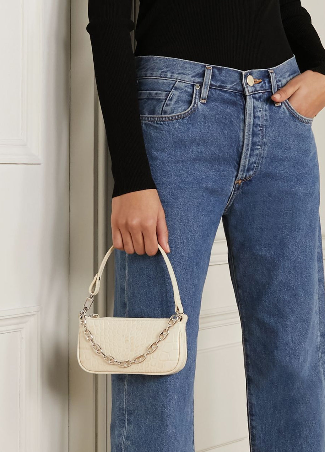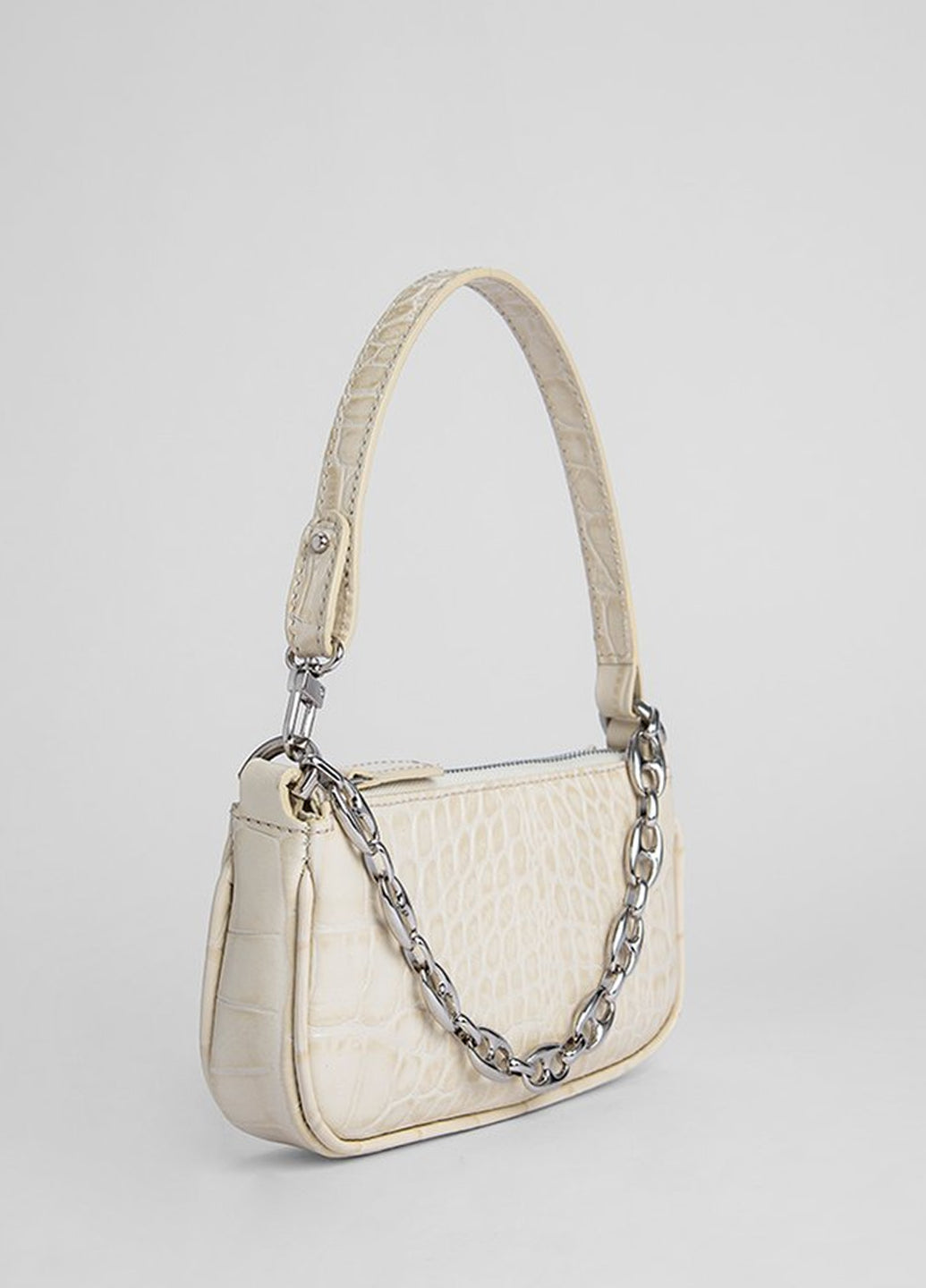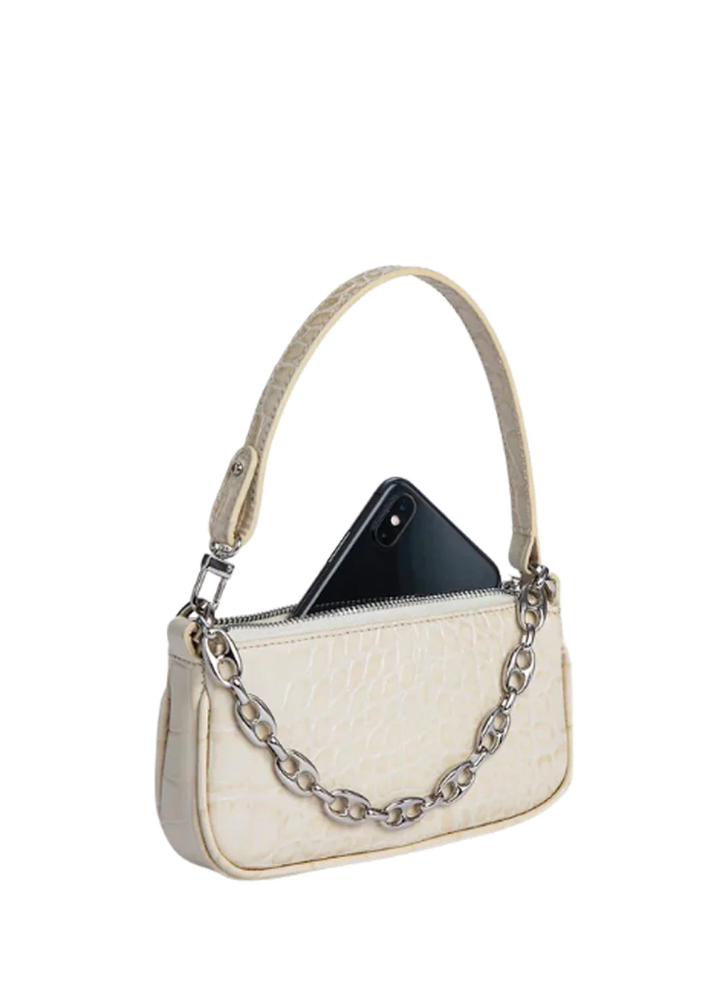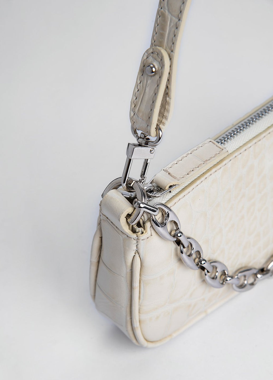 Міні-варіант плечової сумки від BY FAR вражає своєю елегантністю та функціональністю. Гладкі лінії і вишукана срібляста ланцюжкова деталь спереду створюють вишуканий вигляд, який натхненний вінтажними ювелірними виробами. Тиснена шкіра крокодила, яка є характерною для бренду, надає сумці розкішний вигляд і підкреслює її жіночу привабливість.