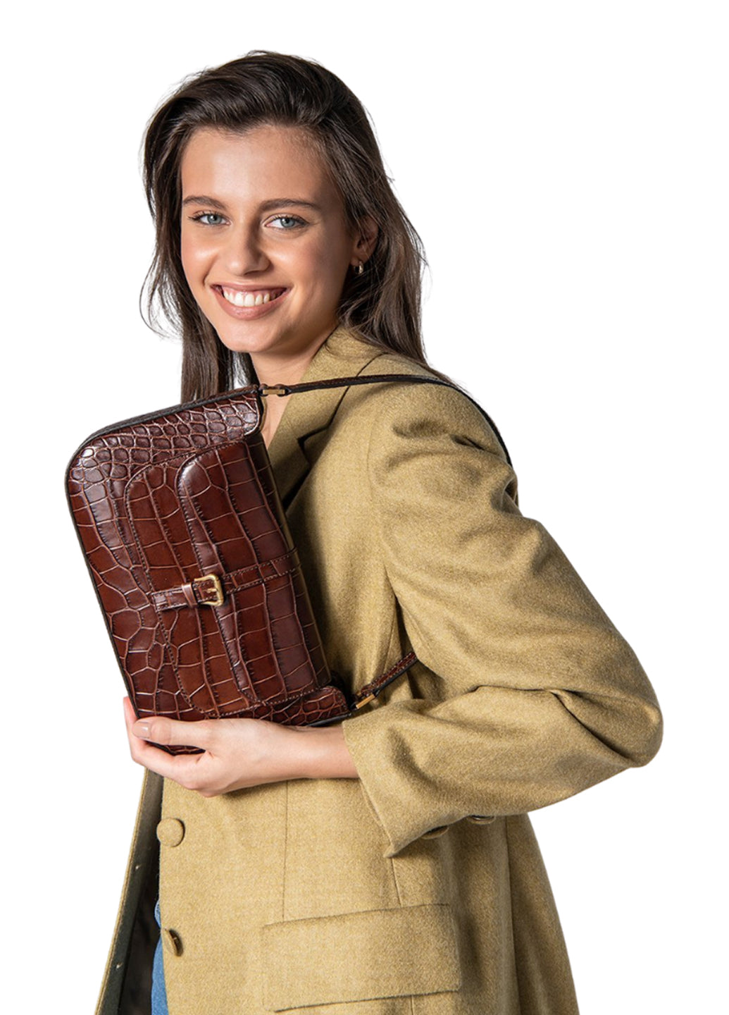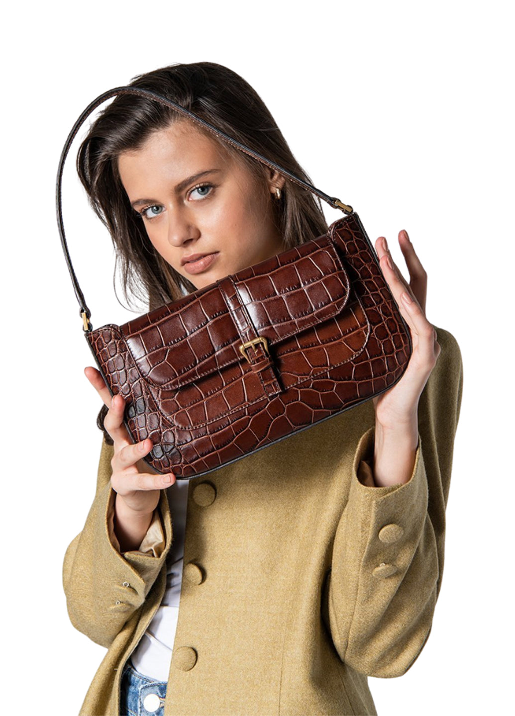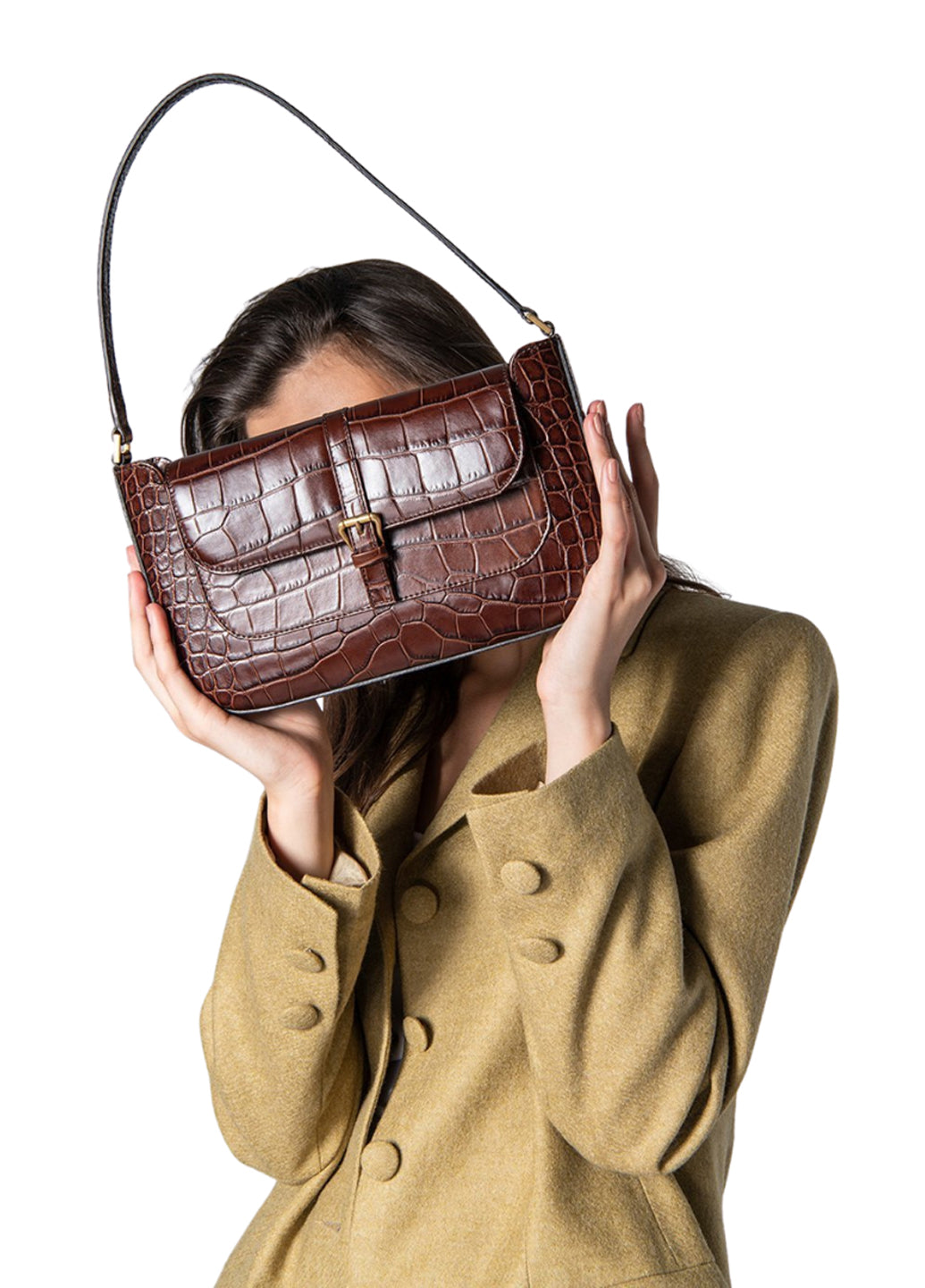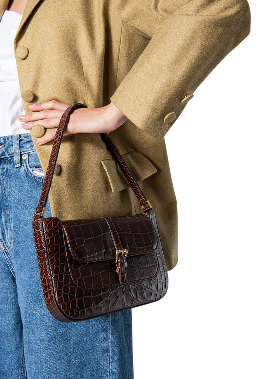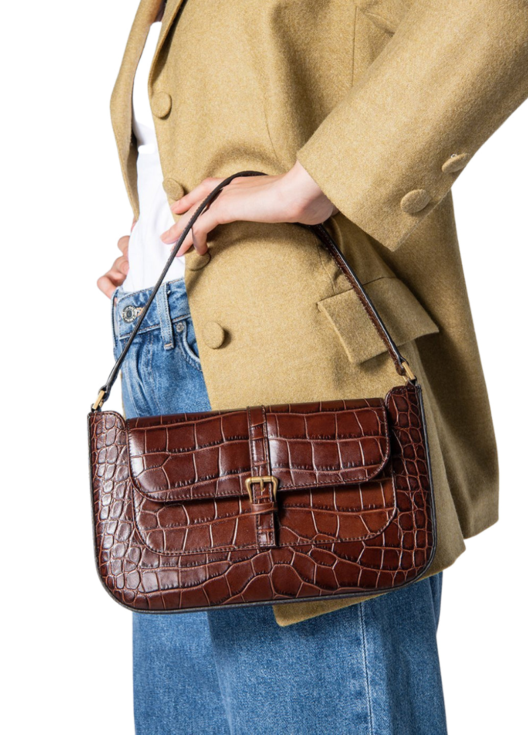 Сумка через плече Miranda від BY FAR відтіняє ностальгію за 90-ми роками, особливо яскраво виражаючи це у своєму багетному силуеті. Виготовлена зі шкіри з тисненням, що нагадує рептилію, вона має вишуканий вигляд, який доповнюється фурнітурою у вигляді пряжки. Ця модель має одне внутрішнє відділення з відкидним клапаном, що робить її практичною і зручною для зберігання різних речей. Короткий шкіряний ремінець додає елегантності і робить цю сумку ідеальним вибором для повсякденного використання або для особливих випадків.