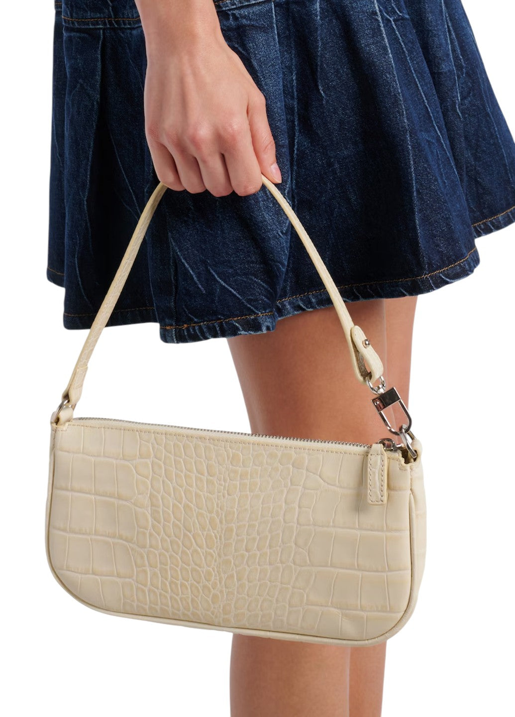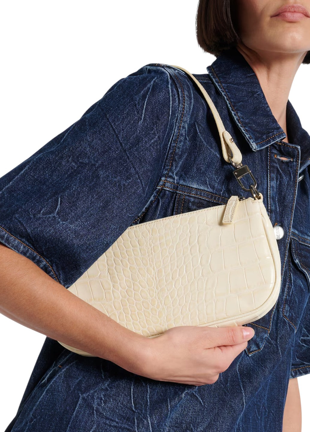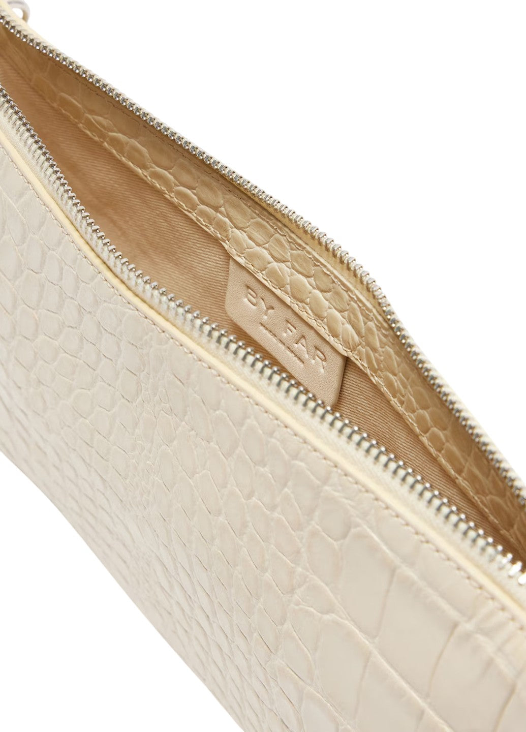 Плечова сумка від BY FAR дійсно відтіняє естетику 90-х, зберігаючи при цьому сучасний шарм. Її мінімалістичний дизайн і функціональність роблять її ідеальним вибором для тих, хто цінує якість і стиль. Тиснена шкіра крокодила надає сумці розкішний вигляд, а сріблясті металеві деталі додають елегантності. Сумка має одне внутрішнє відділення із застібкою на блискавці та короткий шкіряний ремінець. Такий аксесуар легко вписується в будь-який образ, створюючи неповторний і завершений вигляд.
