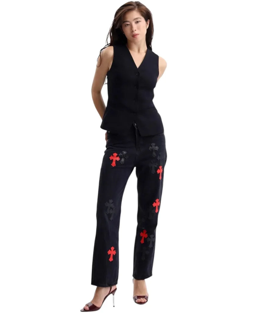 Chrome Hearts Jeans with Red and Tonal Cross Black CH128-BK