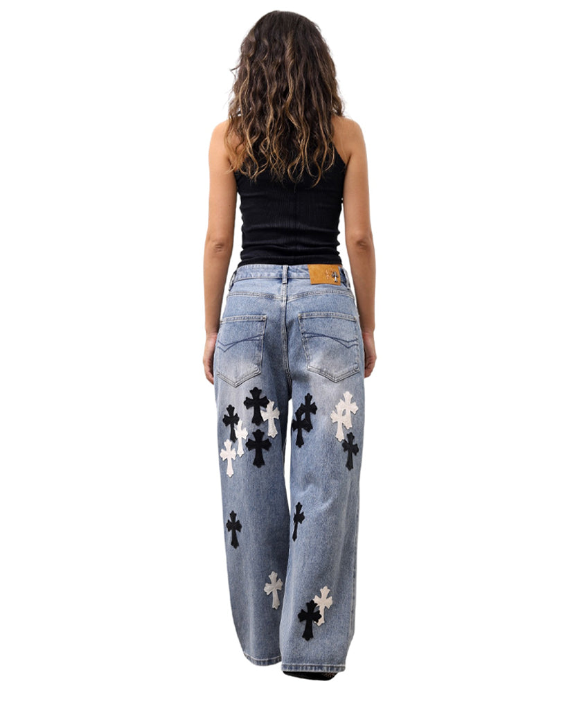 Щільний бавовняний денім у поєднанні з фірмовими шкіряними хрестами в чорно-білій палітрі створює впізнавану айдентику Chrome Hearts. Прямий крій і середня посадка додають моделі класичності, а срібні деталі та брендовані акценти надають завершеного вигляду. Вдалий вибір для тих, хто шукає баланс між розкішшю та брутальністю.