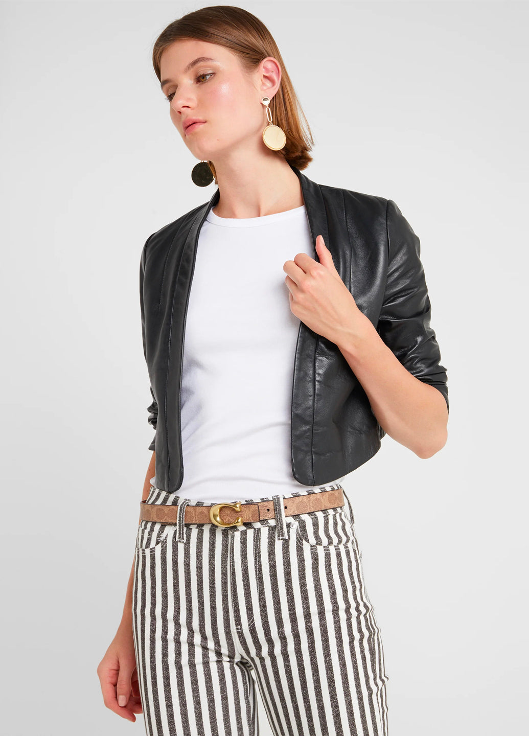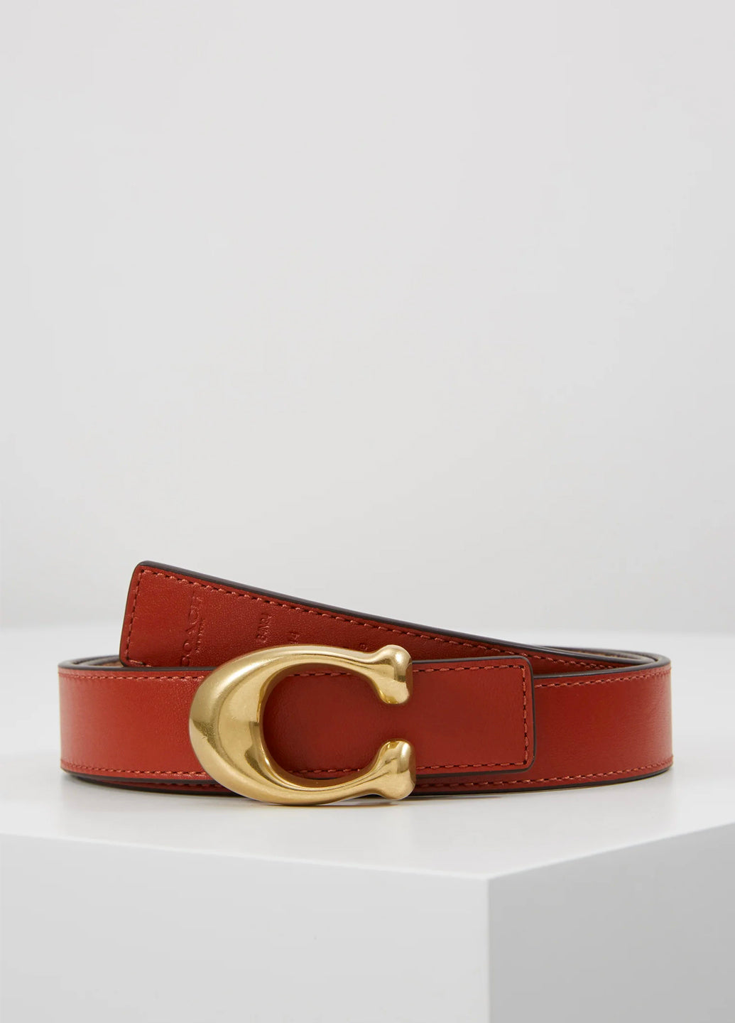 Фірмовий ремінь від Coach виготовлений з натуральної шкіри. Він має двосторонній дизайн із золотистою пряжкою у формі літери "С". Ширина - 25 мм.