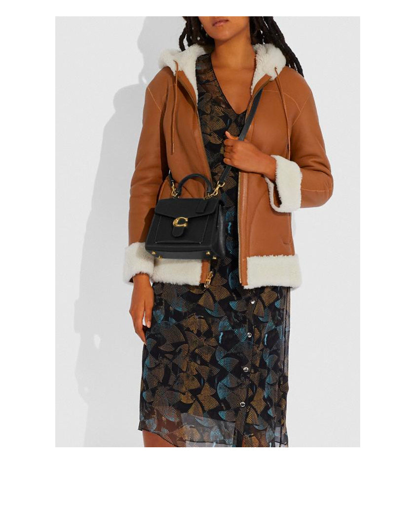 Натхненна архівним дизайном Coach 1970-х років, структурована модель Tabby виготовлена з поєднання вишуканої натуральної шкіри та полірованої зернистої шкіри. Ця мініатюрна новинка сімейства Tabby, оздоблена фірмовою фурнітурою, має елегантну нову форму, може носитися за витончену верхню ручку або знімний ремінець через плече.