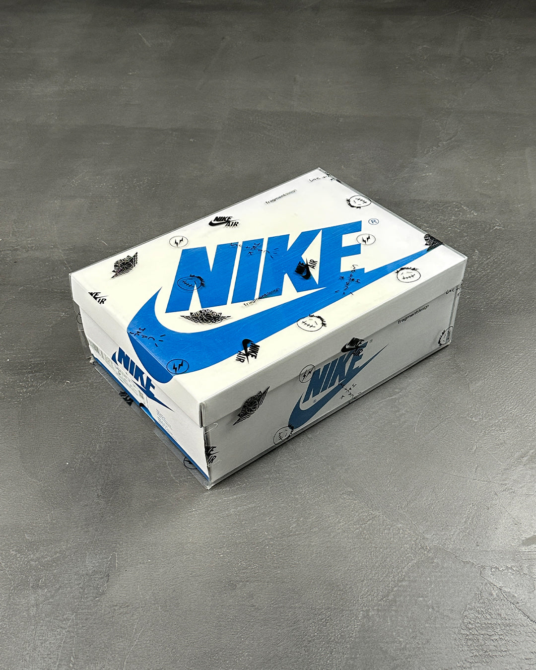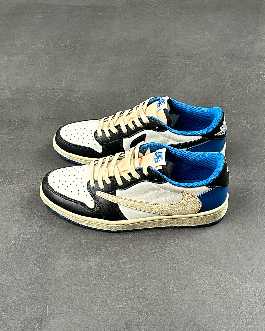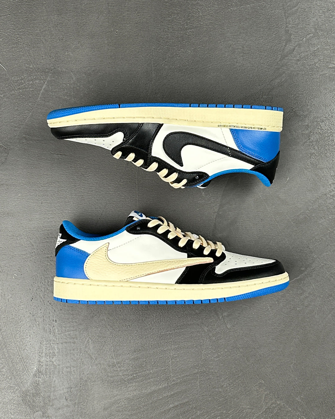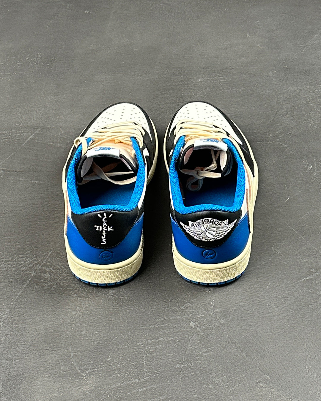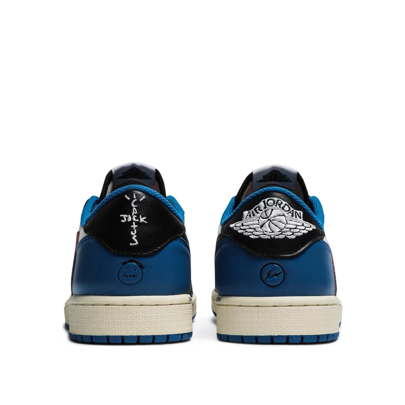 Fragment Design x Travis Scott x Air Jordan 1 Retro Low - це колаборація, що поєднує в собі фірмові деталі, які асоціюються як з La Flame, так і з впливовим іміджем Хіроші Фудзівари. Кольорова палітра нагадує про минулі спільні проекти Fragment, підкреслені білим шкіряним верхом з контрастними накладками чорного та королівського синього кольорів. Перевернутий та збільшений Swoosh Скотта прикрашає бічну бічну панель у білосніжному кольорі, тоді як стандартний чорний Swoosh пришитий на протилежному боці. Логотип Cactus Jack прикрашає п'ятку лівого кросівка, а безпосередньо під ним - логотип зі смайликом репера. На п'яті правого кросівка до класичного логотипу Jordan Wings приєднався фірмовий знак Фрагмента у вигляді блискавки.