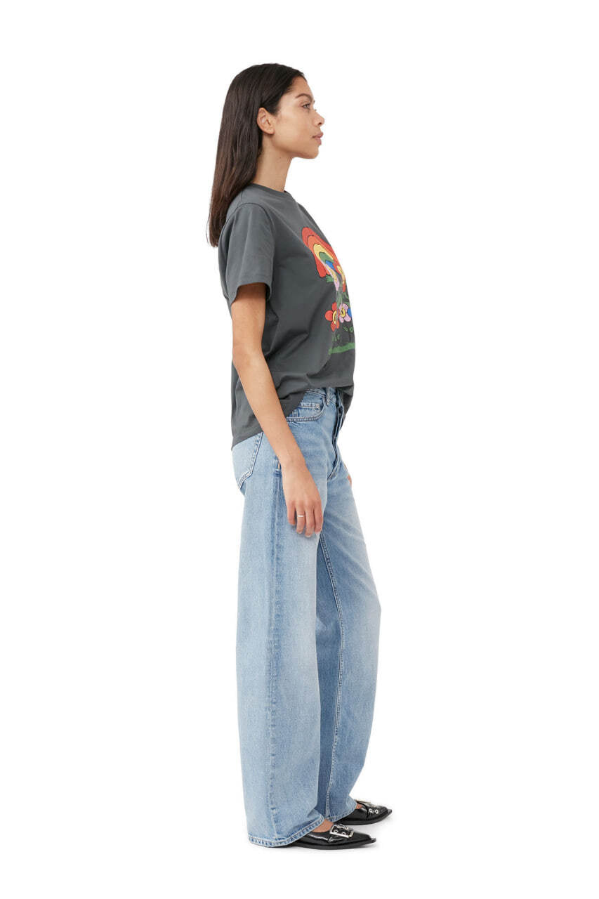 Ця футболка Rainbow вражає не лише своїм веселим графічним принтом у вигляді веселки, а й своєю якістю. Вона виготовлена з сертифікованої органічної бавовни, що означає, що для вирощування бавовни не використовувалися шкідливі хімічні речовини, а процес виробництва був екологічно безпечним. Крім того, футболка має вільний крій, що забезпечує комфорт під час носіння, а круглий виріз додає додаткового стилю. І, звичайно, не можна не згадати логотип GANNI, який підкреслює приналежність бренду.