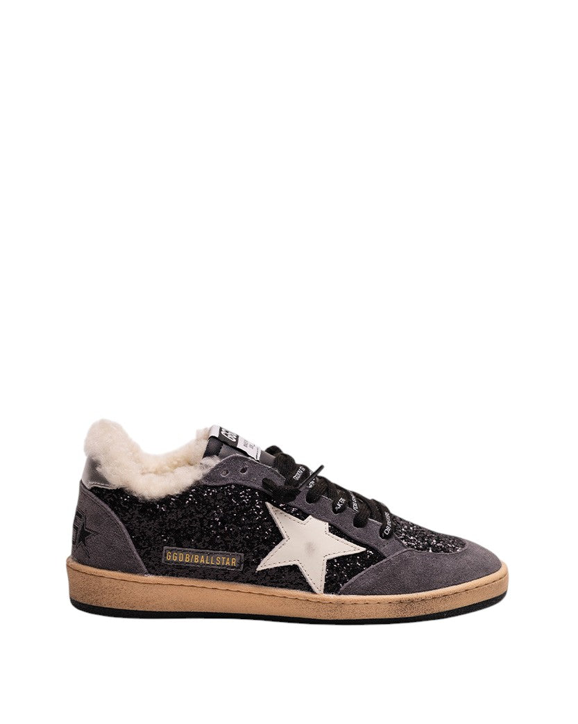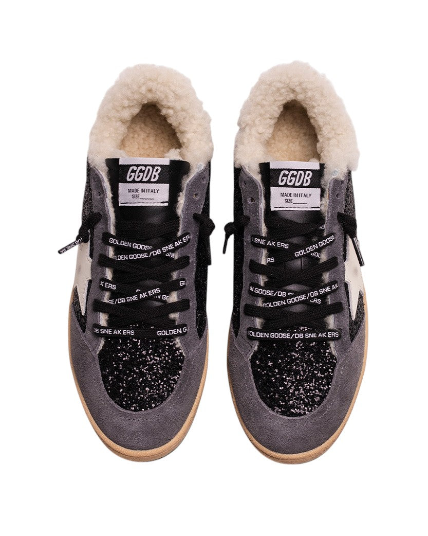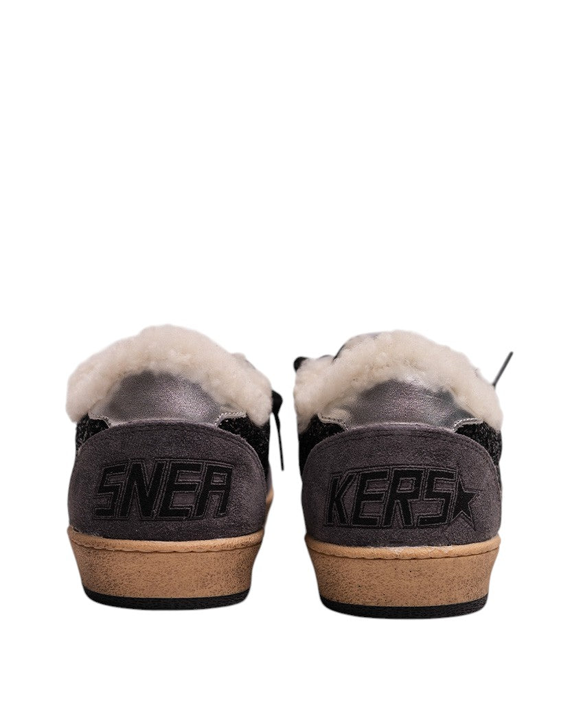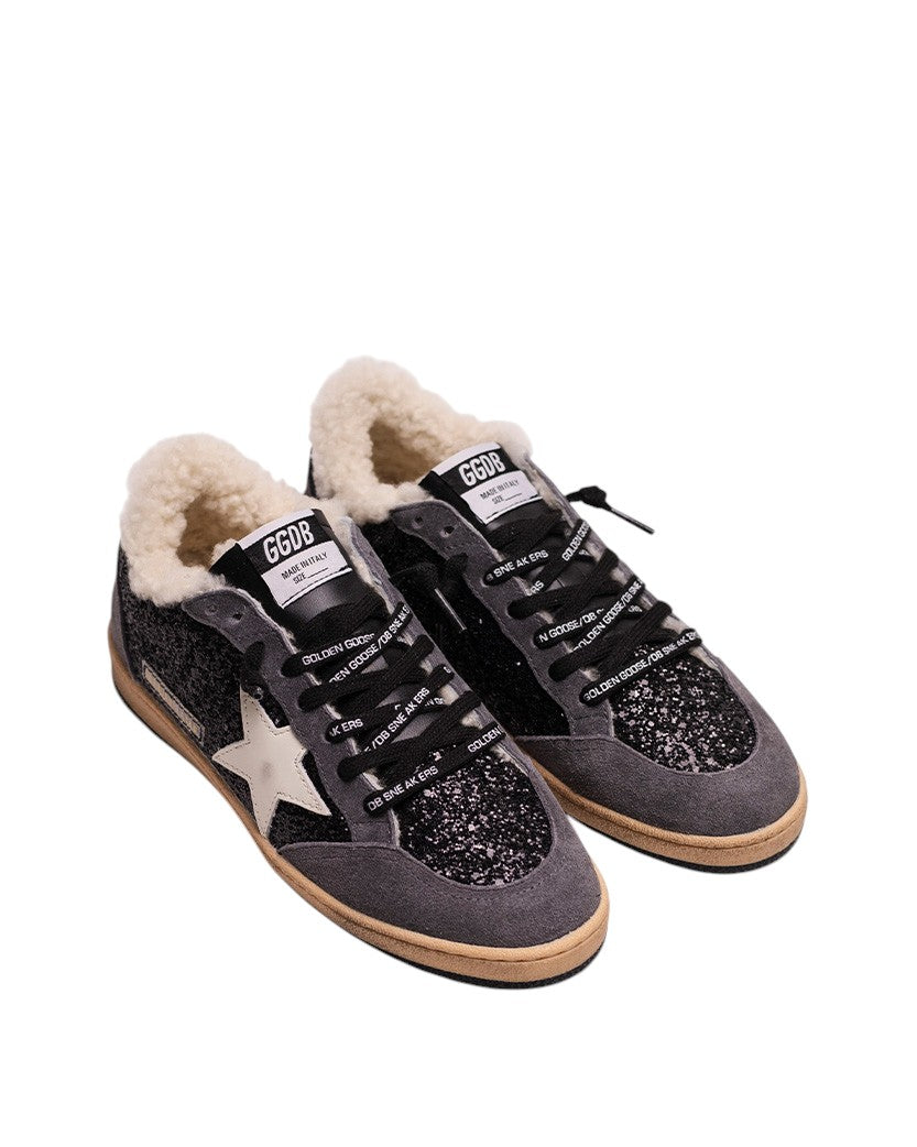 Ball Star у зимовому варіанті поєднують впізнаваний ретро-стиль 80-х із теплом та комфортом. Ця модель виконана з чорного глітерного текстилю та сірої замші, доповнена білою шкіряною зіркою й металевою срібною п’яткою. Усередині — м’яка хутряна підкладка, що забезпечує затишок у холодну пору року. Фірмові чорні шнурки з брендуванням і вінтажний ефект на підошві додають кросівкам характерного настрою Golden Goose.