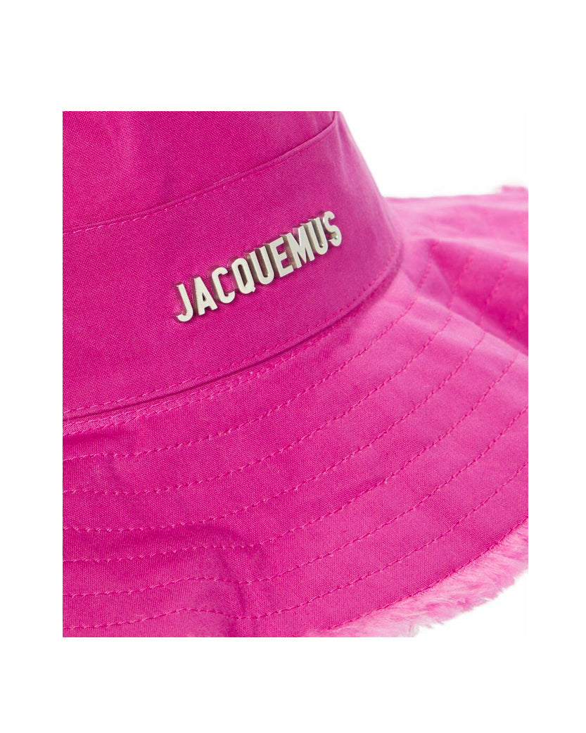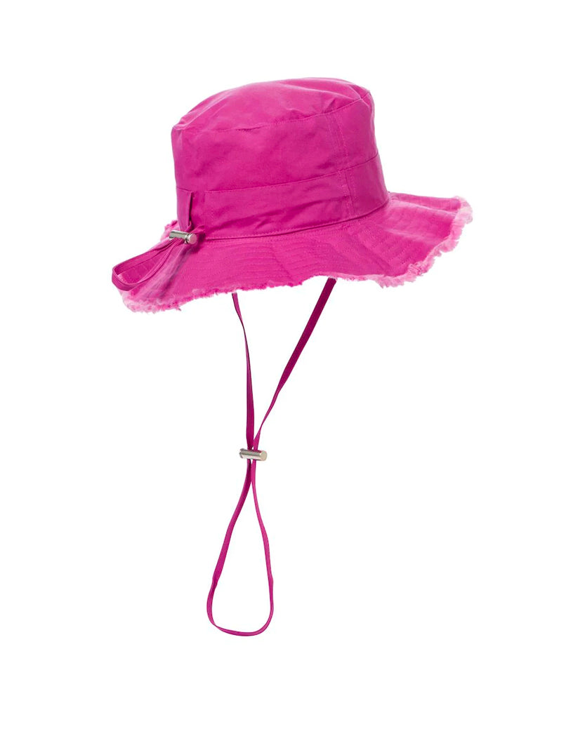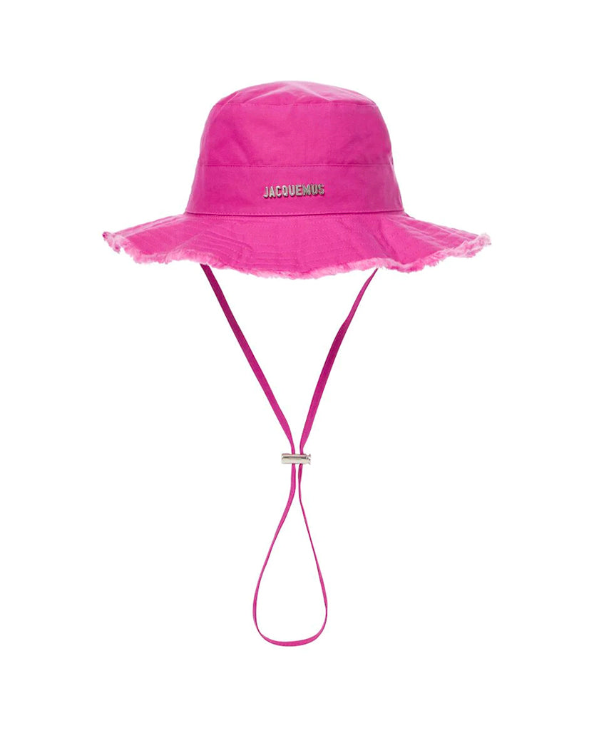Ми любимо французький бренд Jacquemus за нетривіальні аксесуари, як панама рожевого кольору. Модель доповнена фірмовим логотипом бренду.