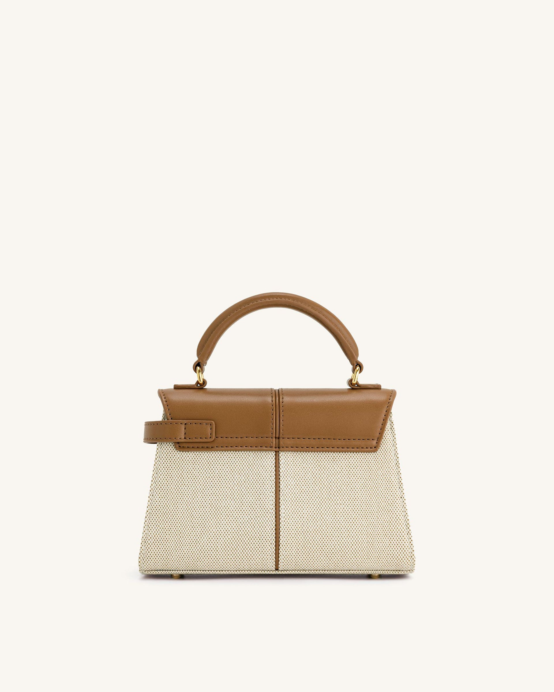 Ця елегантна сумка виготовлена з тканини з акцентними деталями з високоякісної веганської шкіри, що забезпечує стильний вигляд і екологічність. Компактні розміри роблять її ідеальним аксесуаром для повсякденного використання. Завдяки верхній ручці та знімному регульованому плечовому ременю її можна носити як через плече, так і в руці. Золотиста фурнітура додає вишуканості, а внутрішня прорізна кишеня зручна для зберігання дрібних речей.