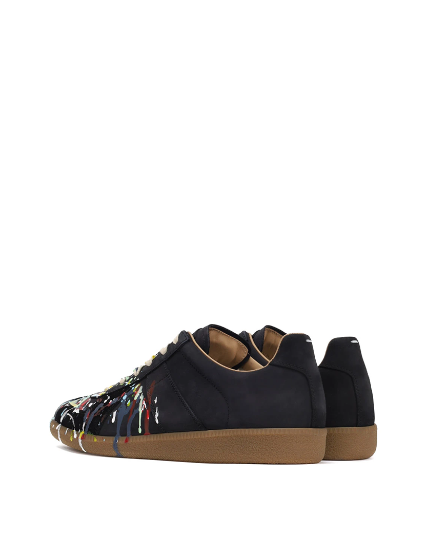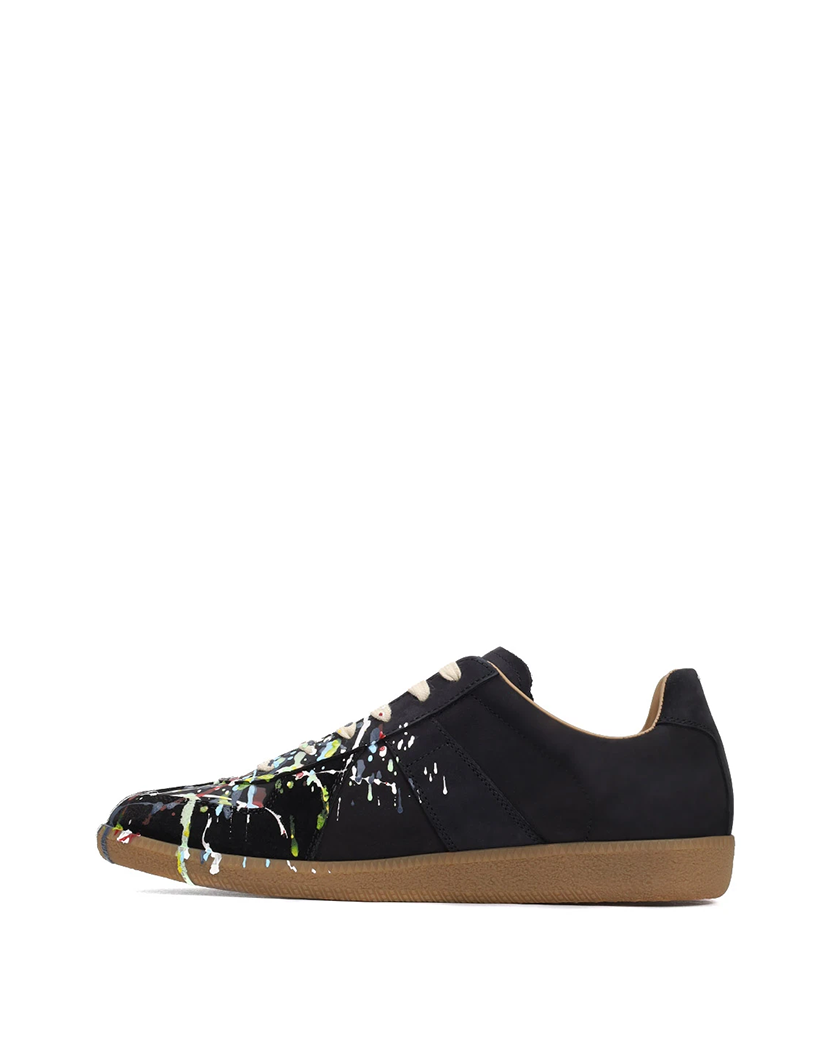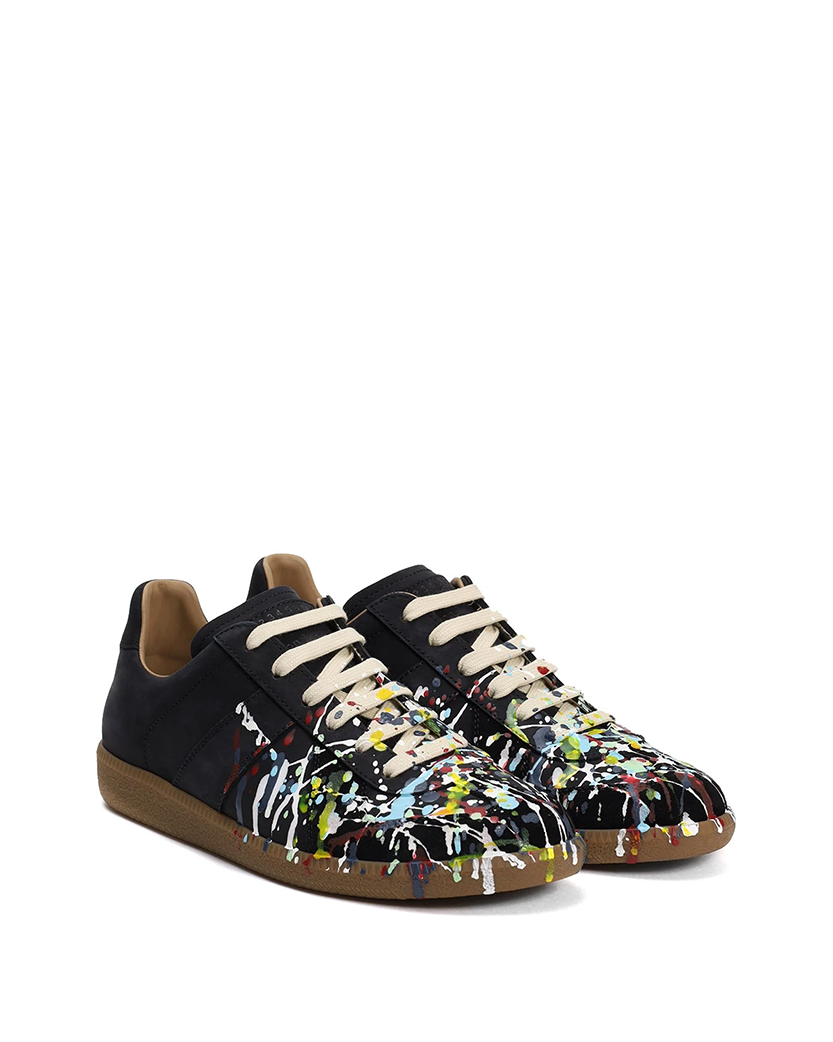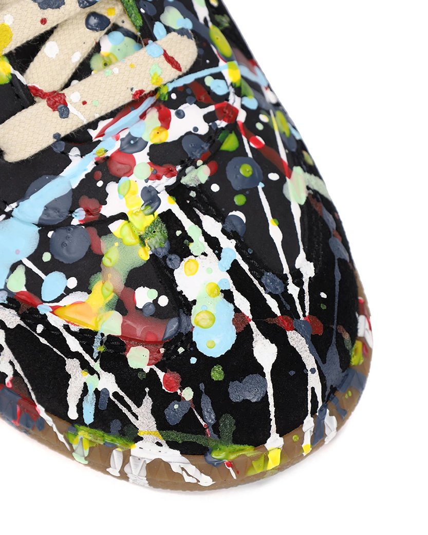 Maison Margiela Replica Sneakers Black/Paint — переосмислення культової моделі бренду в артистичному стилі. Ці кросівки з класичним силуетом австрійського тренувального взуття 70-х років виготовлені з комбінації шкіри та замші. Їхньою ключовою особливістю є хаотичні мазки фарби вручну, що створюють ефект арт-об’єкта й роблять кожну пару унікальною. Модель має гумову підошву, м’яку бавовняну підкладку та фірмову номерну нашивку на язичку. Це взуття поєднує у собі майстерність пошиття, художній жест і автентичний стиль Maison Margiela.