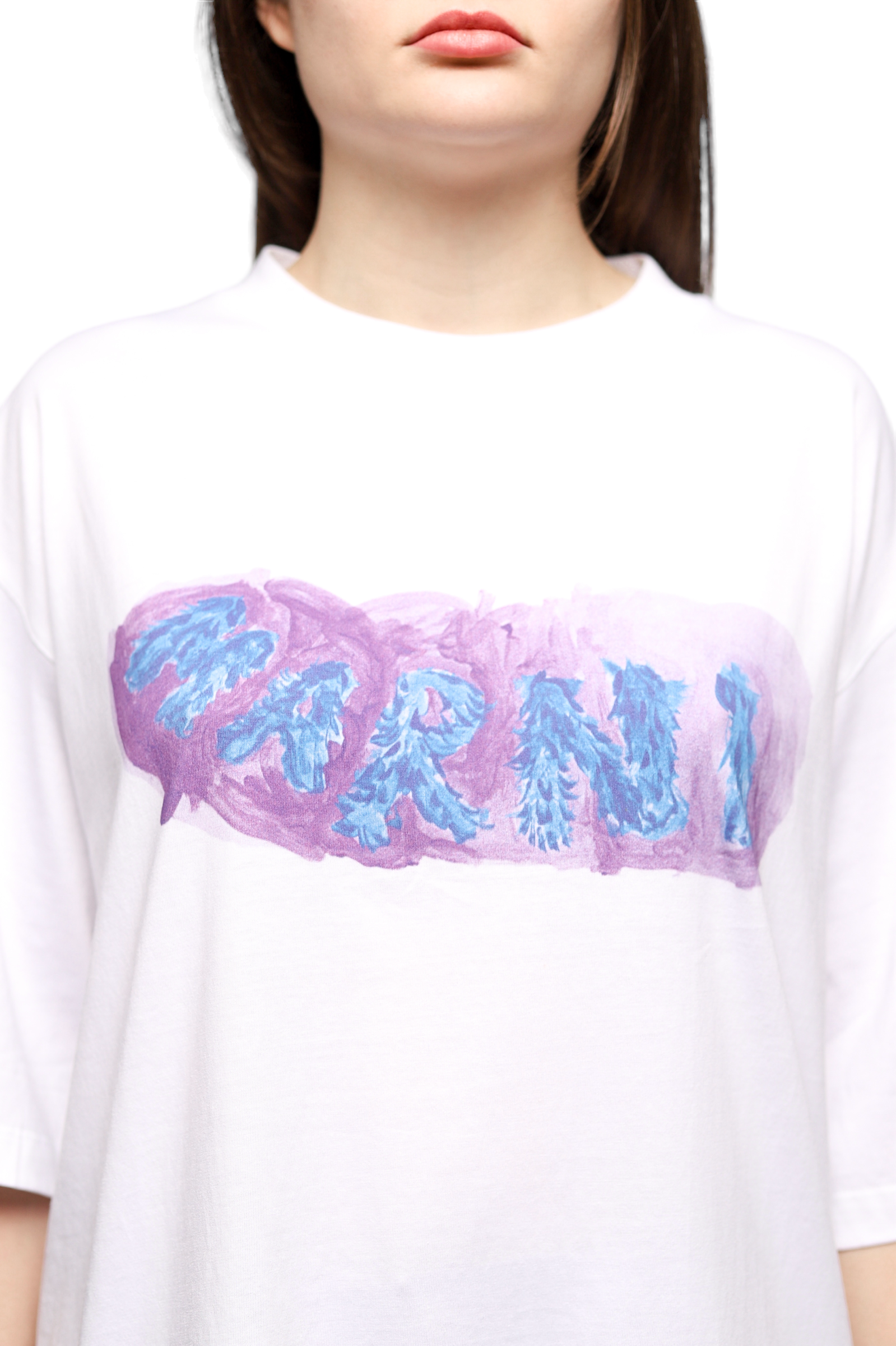 Футболка Marni Paint Effect у білому кольорі має незвичайний логотип з ефектом розмитої фарби, що надає їй оригінальний вигляд. Вона виготовлена з високоякісного матеріалу і має комфортну посадку. Ця футболка створена для тих, хто цінує стиль та якість.