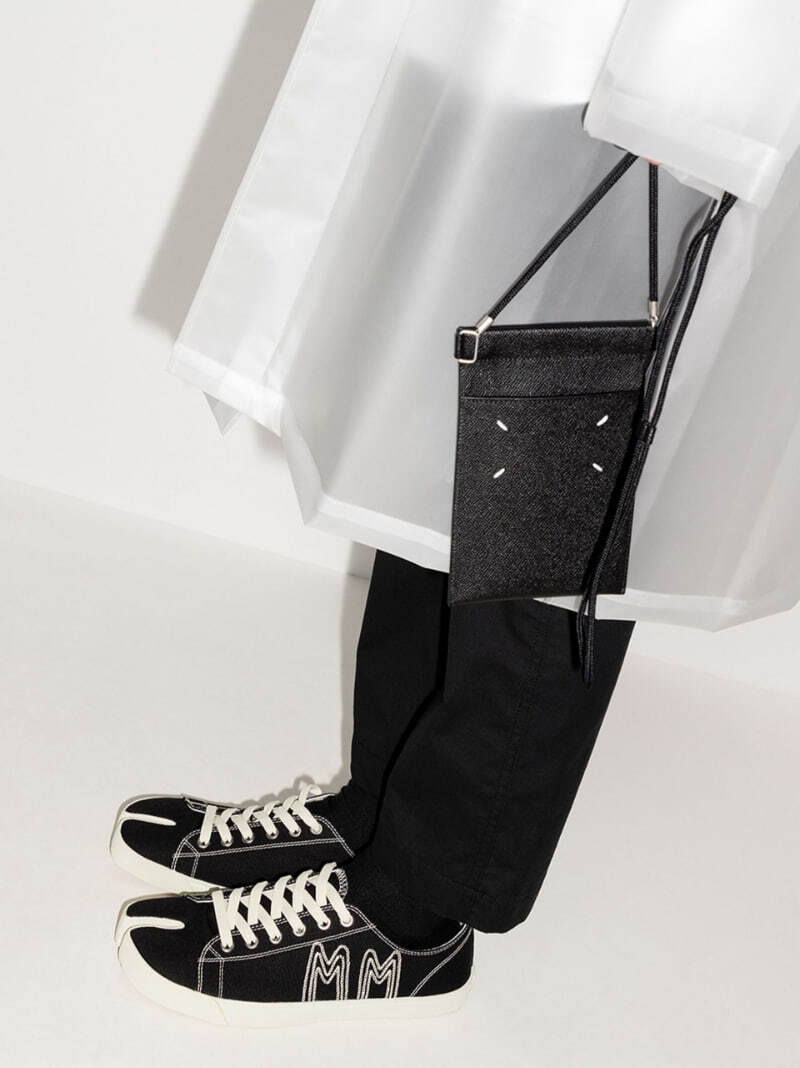 Кеди з бавовняного полотна чорного кольору з низьким верхом. Шнурівка білого кольору, люверси на внутрішній стороні, текстурована гумова підошва білого кольору з вибитим логотипом на п'яті, фурнітура сріблястого кольору, контрастна строчка і логотип білого кольору та знаковий для бренду роздвоєний носок.