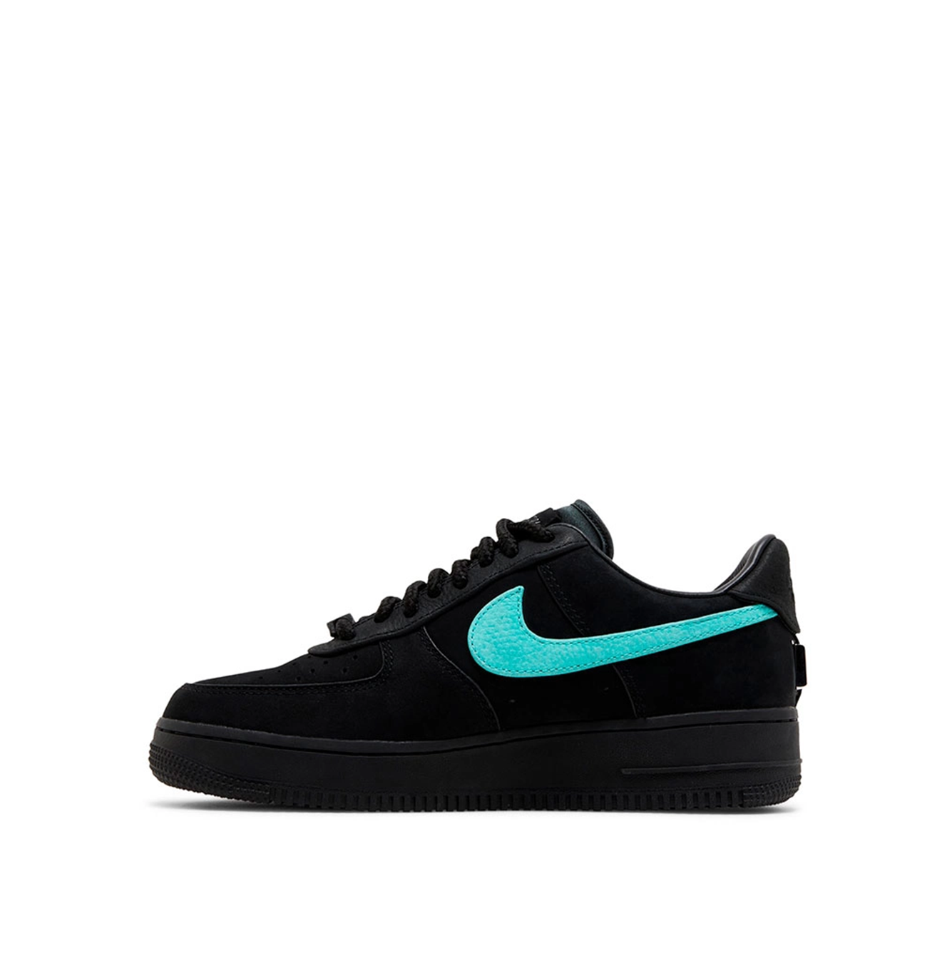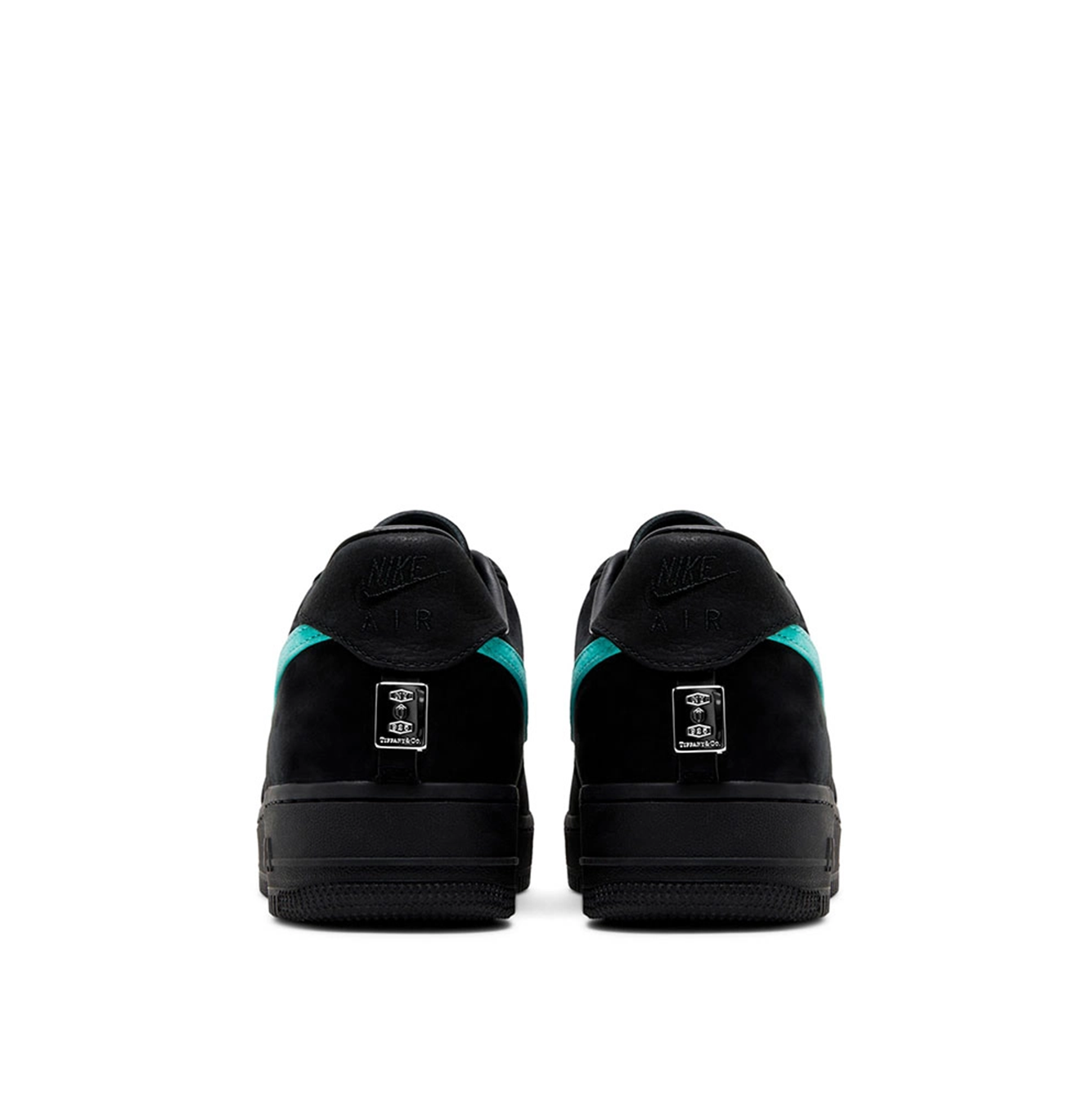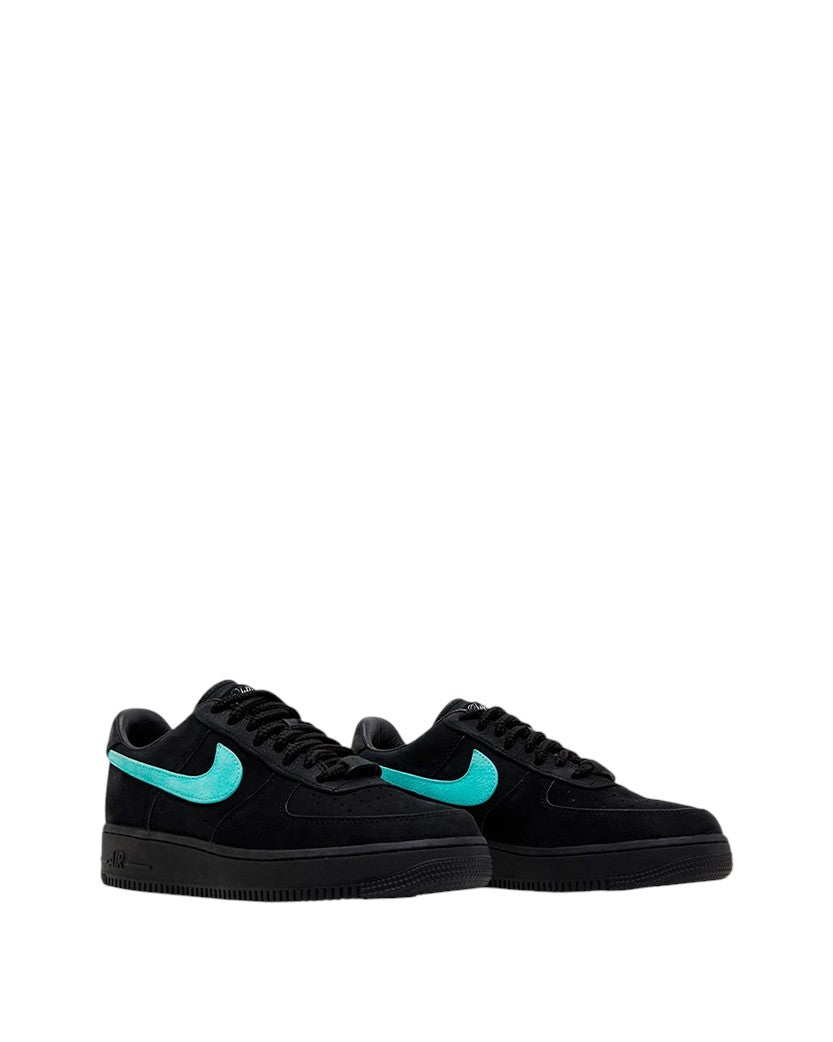 Nike Air Force 1 Low Tiffany & Co. 1837 - пара у чорному, кольорі морської хвилі і хрому виглядає досить знайомо, але також підкреслюється фірмовими кольорами ювелірного дизайнерського будинку. У той час як конструкція AF-1, здається, залишається вірною оригіналу, з верхом з чорного нубуку та зм'ятого шкіряного логотипу Swoosh, справжнє нововведення полягає в хромованих аплікаціях на п'ятці та вибитих ярликах на язичку. Шнурки для кросівок — це не класичні спортивні шнурки, а товсті шнурки, які зазвичай використовуються на шнурках для сумок і ручках сумок Tiffany And Co.