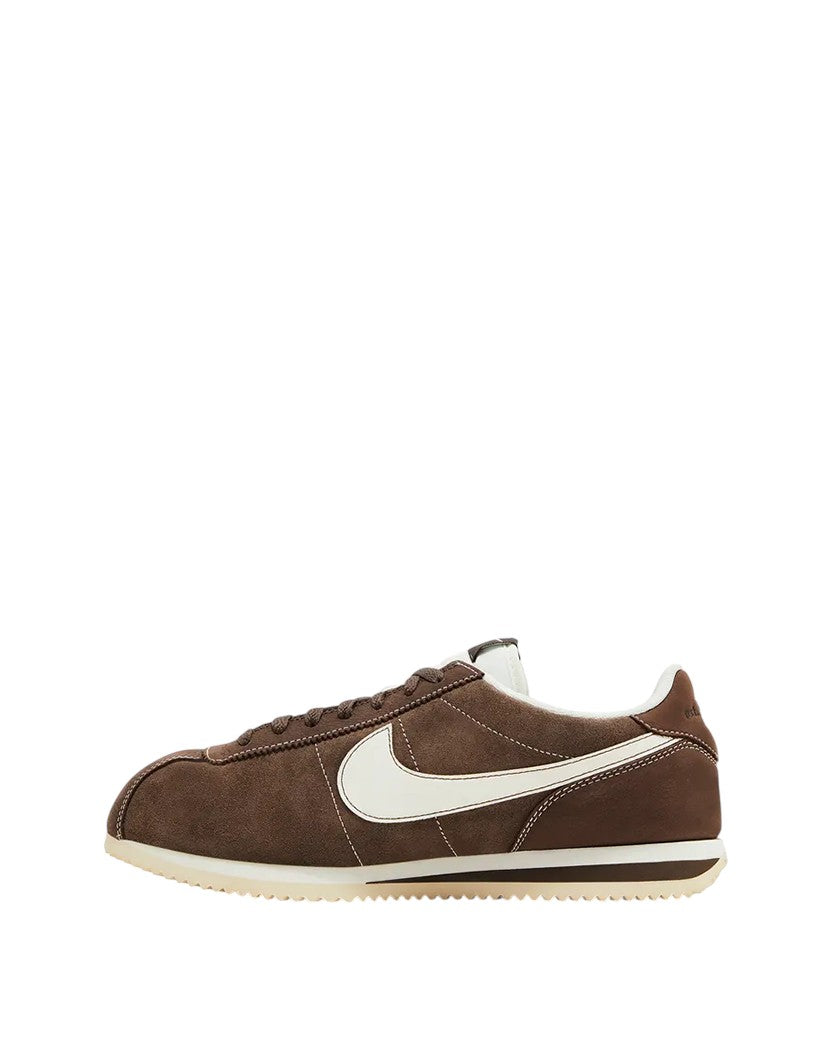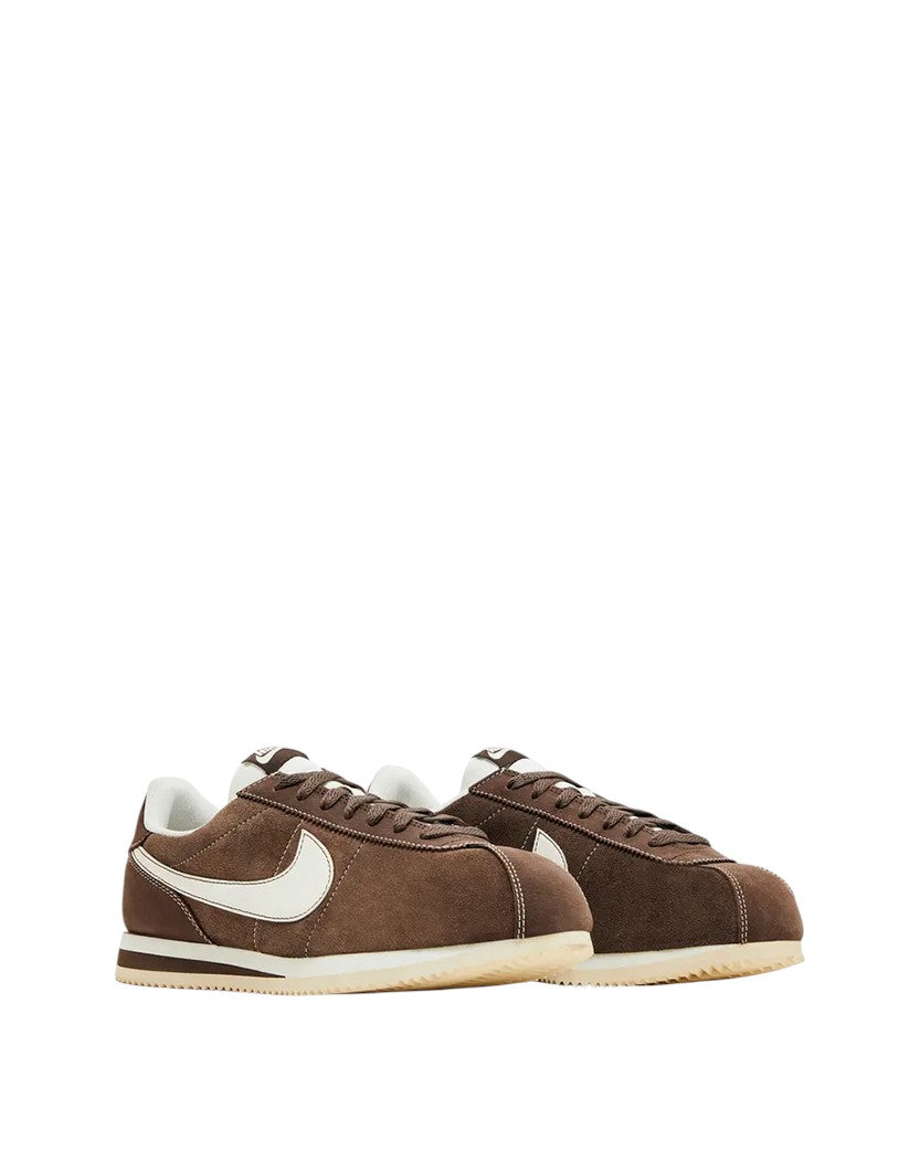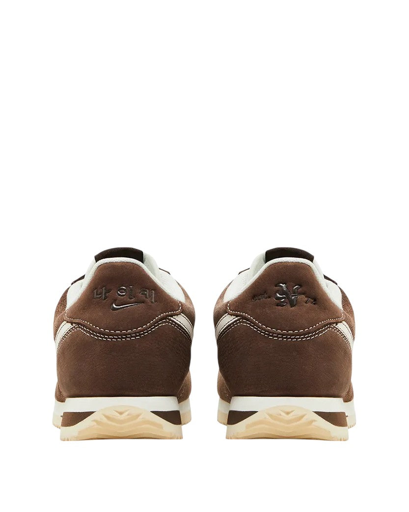 Ця версія Cortez має коричневу замшеву основу з накладками з нубуку, які підсилюють носок, зубчастий край і п’яту. Білі замшеві Swooshes прикрашають бокові панелі, а логотип Nike на п’яті виконаний ієрогліфами хангиль. Додаткові деталі, присвячені святу, можна побачити на носку та ярлику. Завершує дизайн біло-коричнева підошва з EVA-вставкою та фірмовим візерунком ялинки, що додає класичного стилю та забезпечує комфорт.