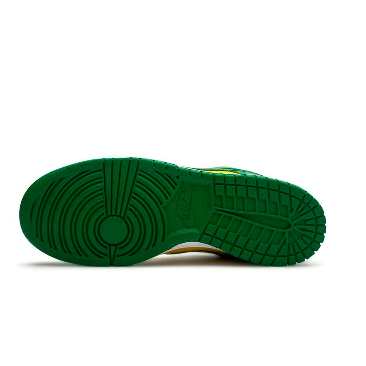 Кросівки Nike Dunk Low Brazil повторюють зовнішній вигляд класичної моделі Dunk 'Brazil' 2001 року, вирізняючись простою двоколірною гамою, що поєднує жовту шкіряну основу з контрастними зеленими накладками. Брендинг Nike прикрашає п'яткову накладку та пришитий тканий ярлик на злегка м'якому нейлоновому язичку. Низькопрофільний силует встановлений на міцній білій пінопластовій проміжній підошві, укріпленій під ногами зеленою гумовою підошвою.