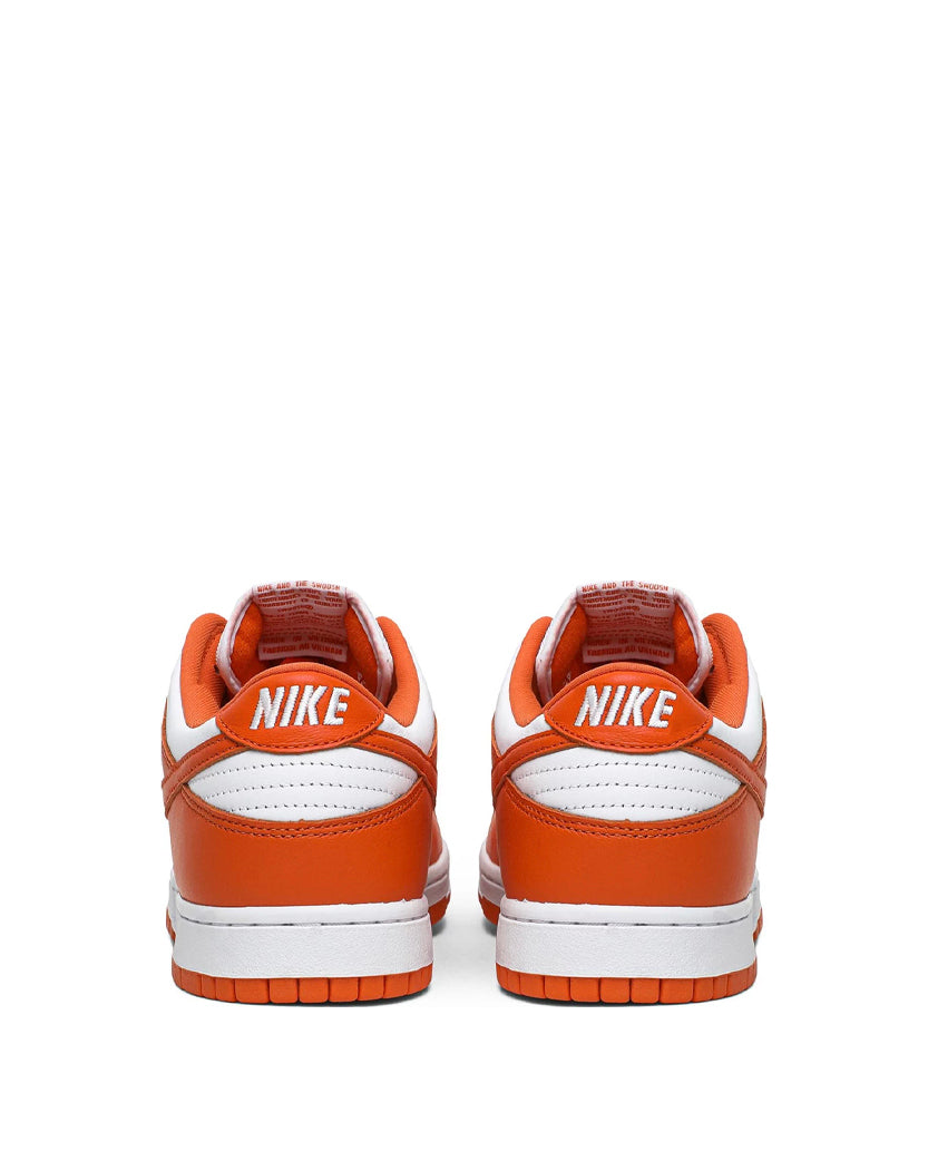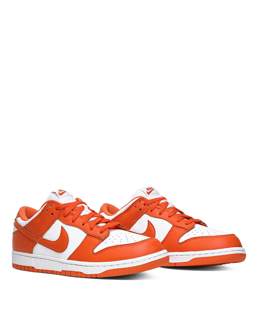 Nike Dunk Low Syracuse святкує 35-річчя силуету з класичним забарвленням із серії Nike 'Be True to Your School' 1985 року. Двоколірні високі кросівки Dunk, які спочатку представляли баскетбольну команду Університету Сиракуз, переосмислені як універсальні низькі кросівки. Верх із натуральної шкіри поєднує в собі чітку білу основу та накладки оранжевого кольору, а на язичку з повітропроникної сітки розміщено тканий логотип Nike.