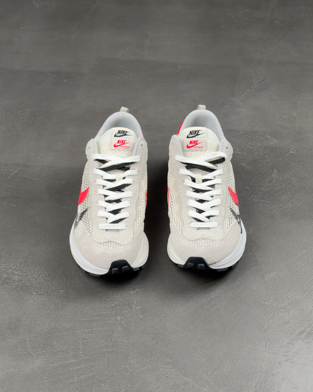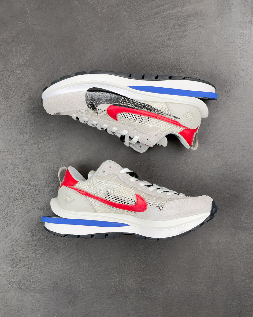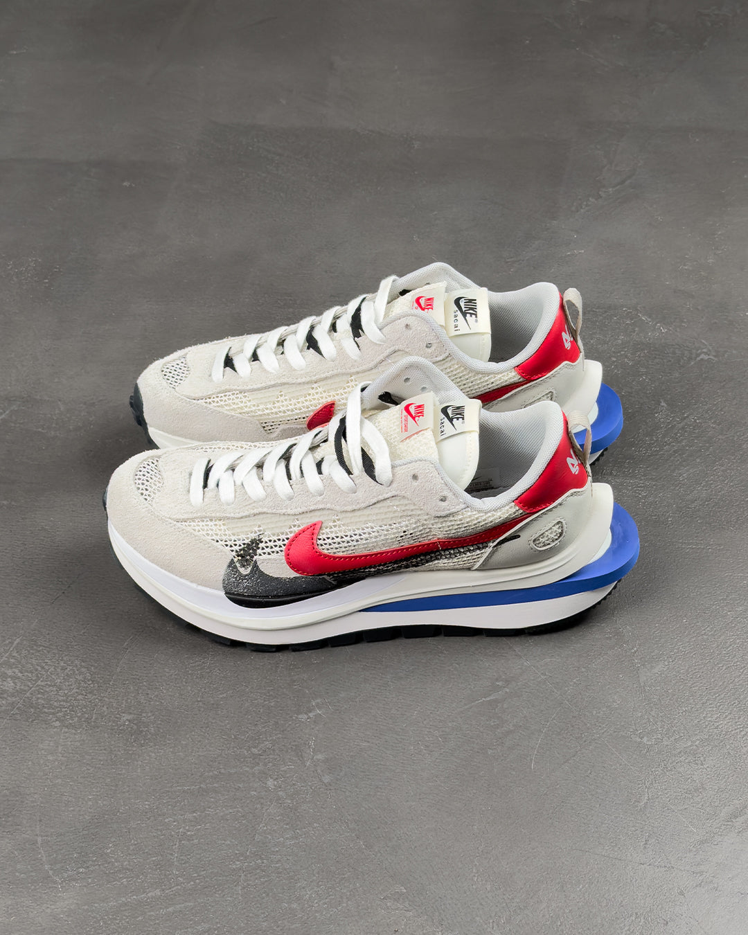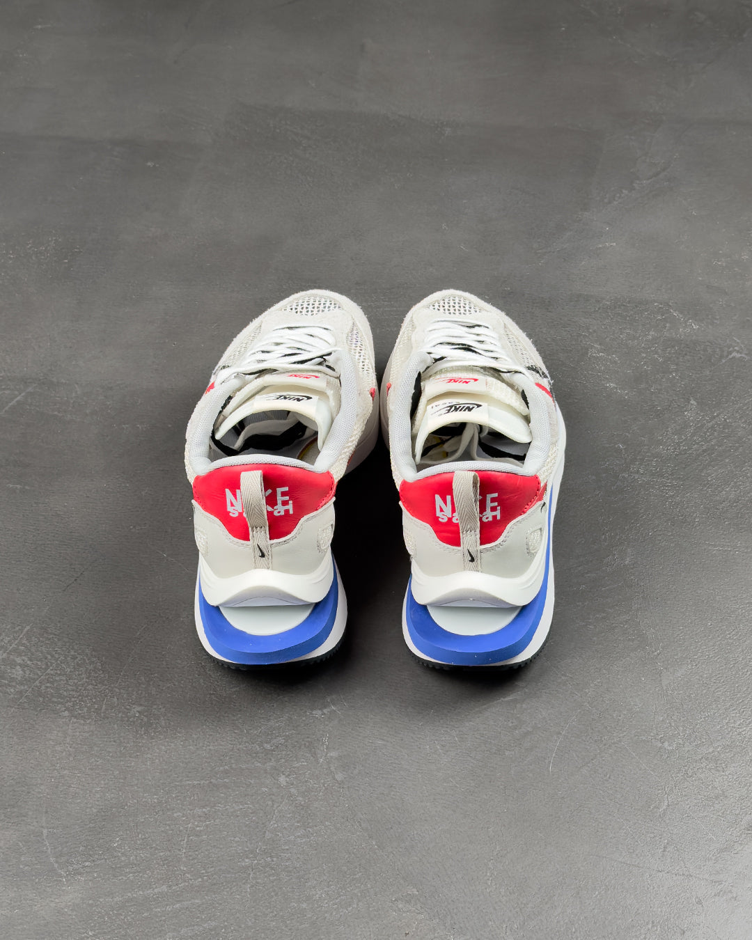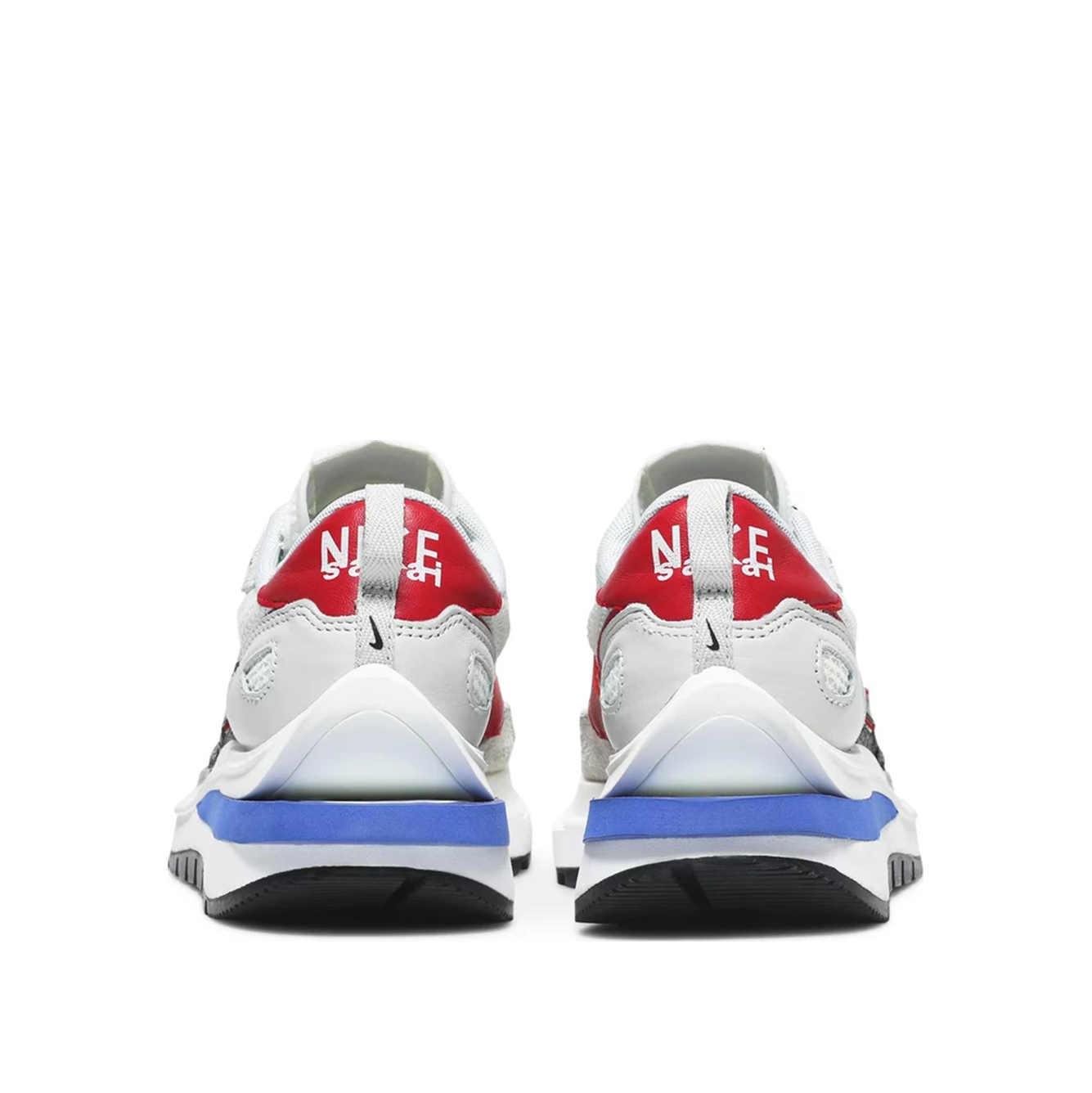 Створені у партнерстві з прогресивним японським модним брендом, кросівки Nike Vaporwaffle Sacai Sport Fuchsia Game Royal повторюють багато дизайнерських прийомів, представлених у колаборації брендів LDV Waffle 2019 року. До них відносяться подвоєні язички, подвоєні Swooshes і складена проміжна підошва, оновлена тут роздвоєною конструкцією на п'яті. Зверху відкрита біла сітка доповнена замшевими накладками в тон і червоною шкіряною п'яткою з подвійним брендуванням Nike і Sacai.