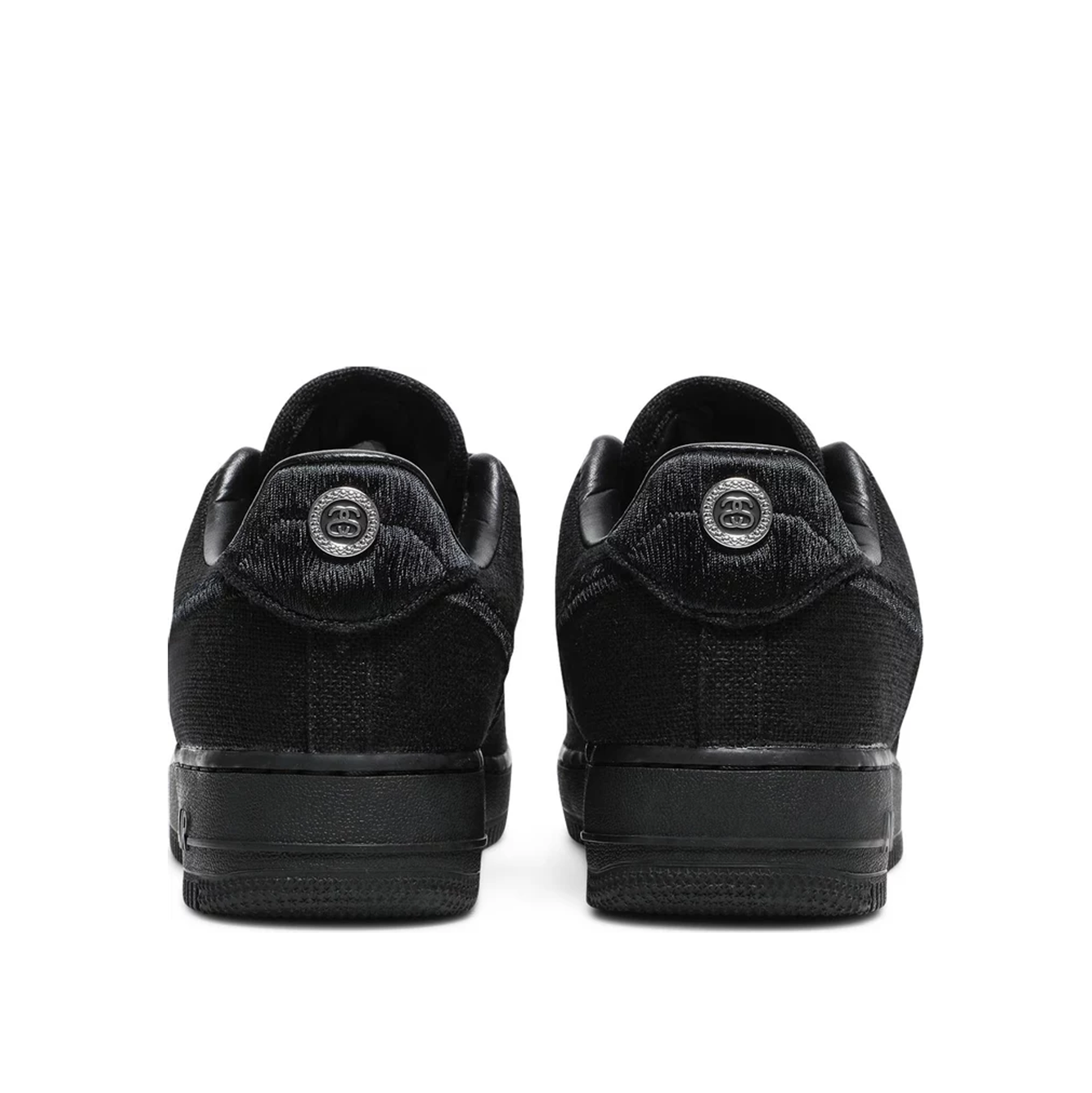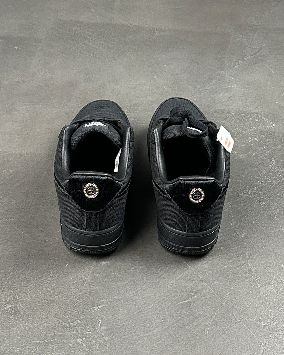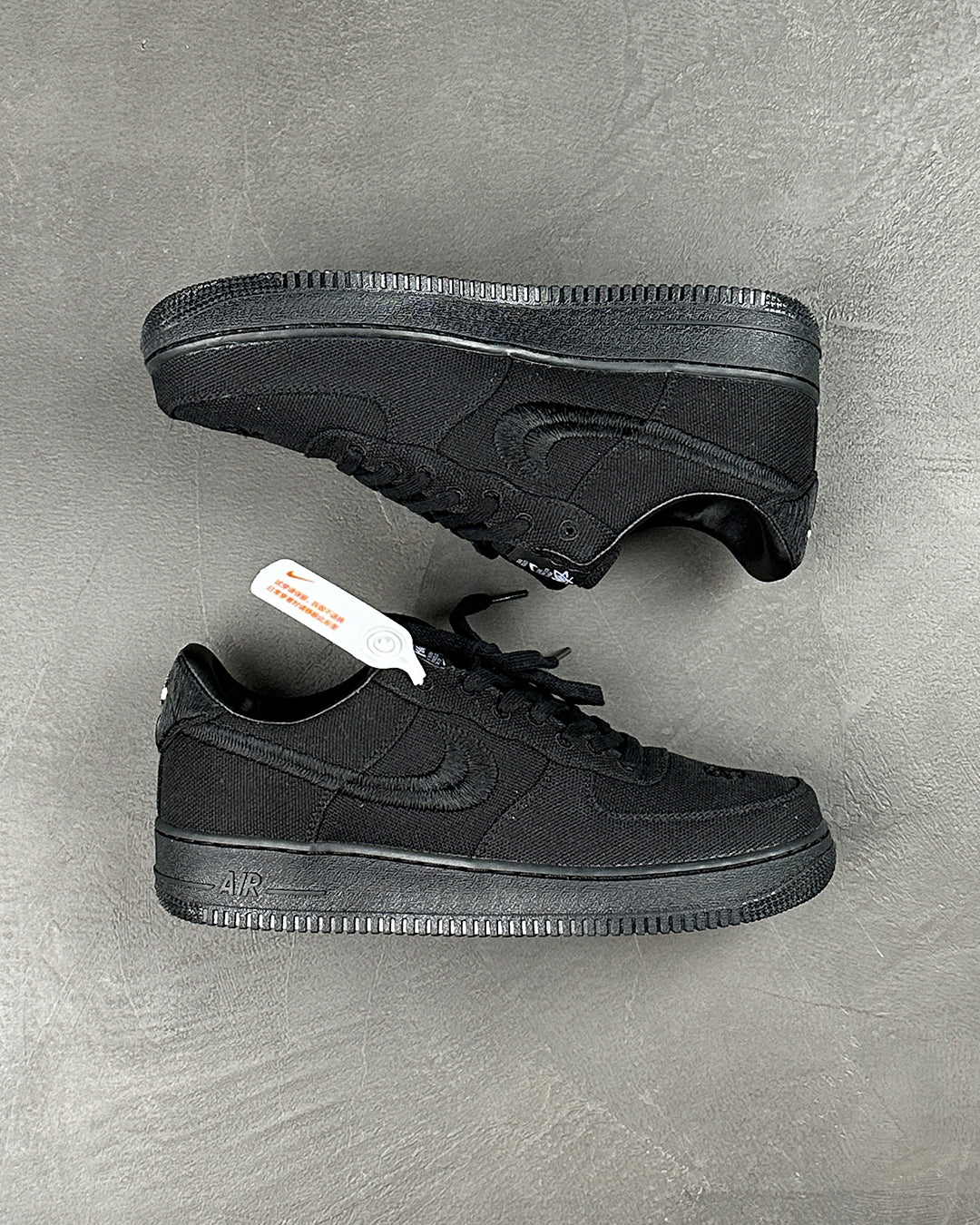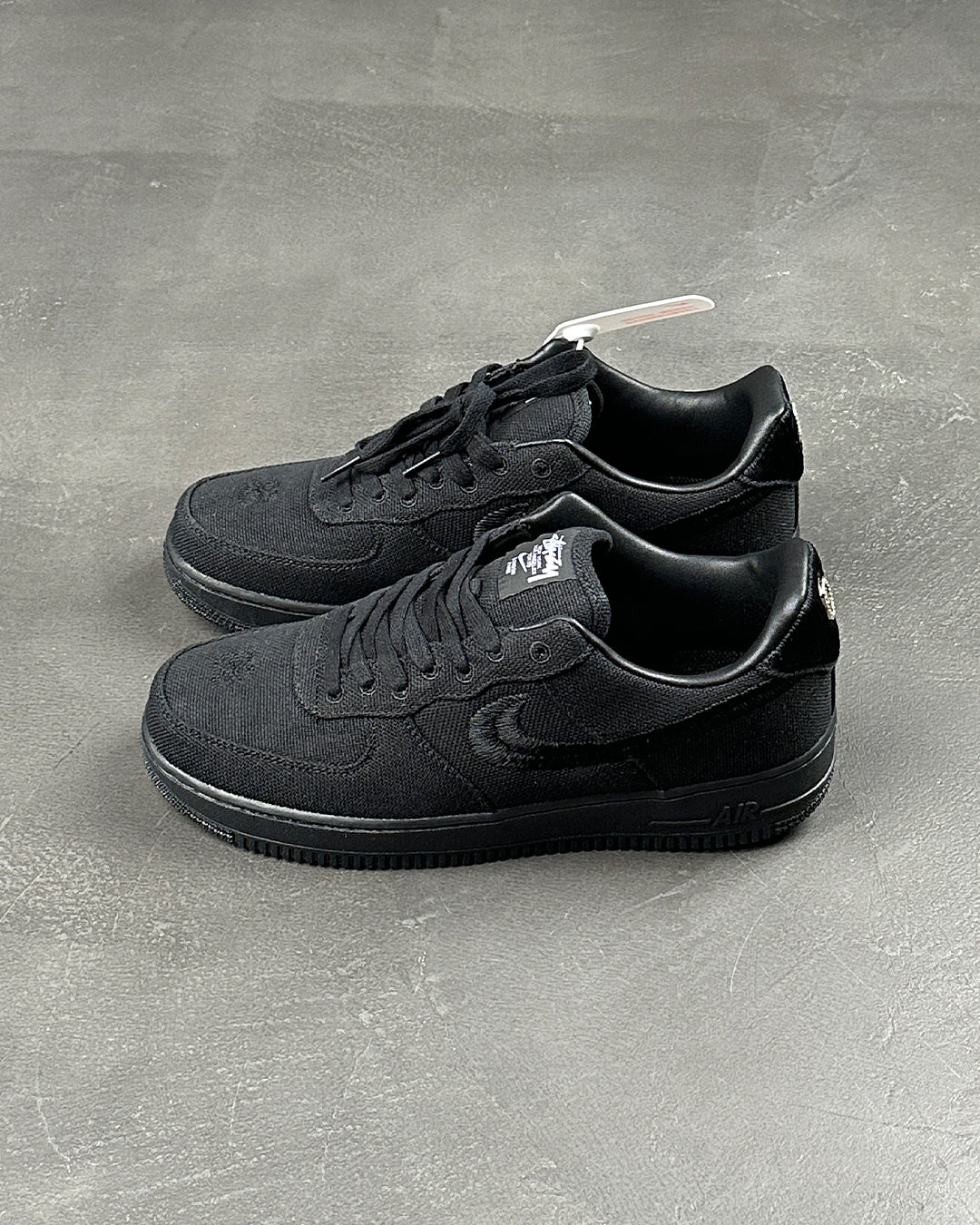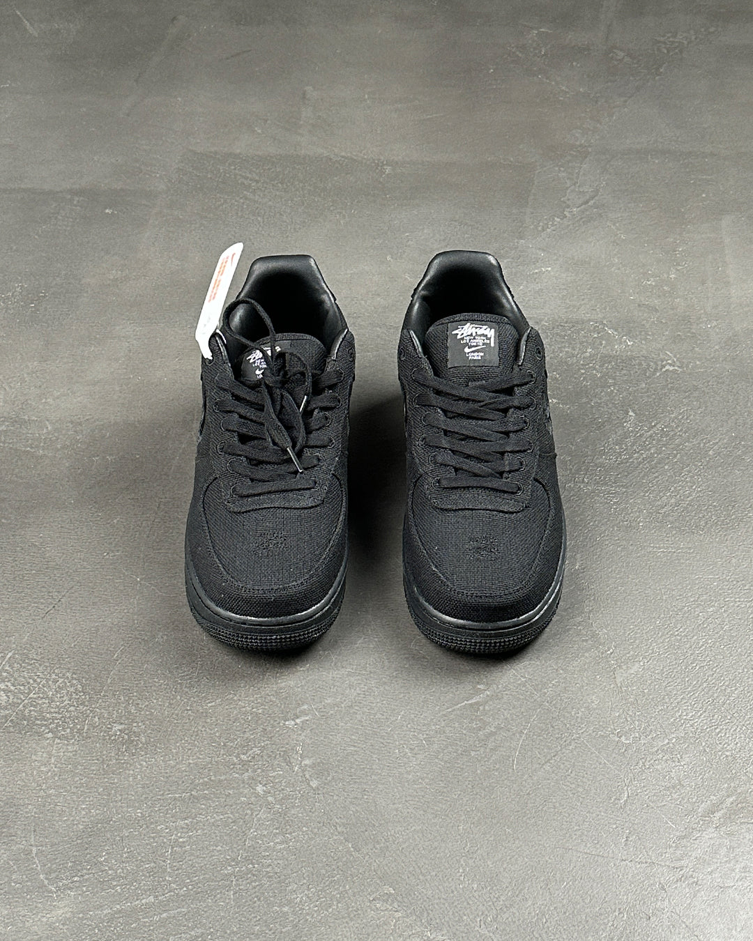 Розроблені у співпраці з південнокаліфорнійським брендом вуличного одягу Nike x Stussy Air Force 1 Low Black використовують дихаючу конопляну конструкцію замість традиційної шкіряної. Однотонна обробка кросівок доповнена вишитим логотипом Swoosh та подвійною літерою S, вишитою на верхній частині носка. Літери, що переплітаються, повторюються на металевій емблемі, прикріпленій до переплетеної п'ятки, а на бирці на язичку зображена іконографія Stussy's World Tour.