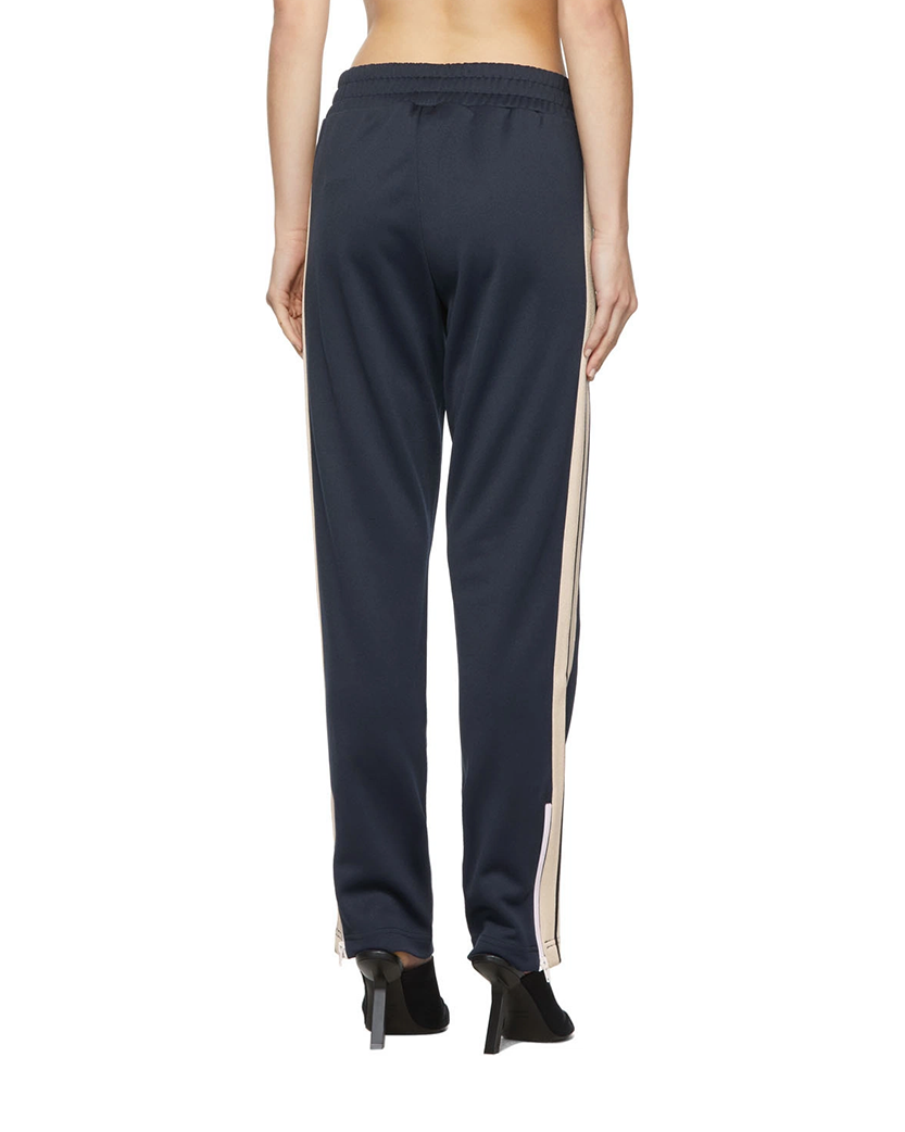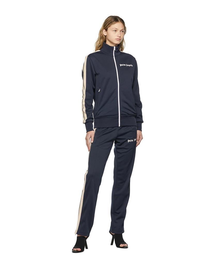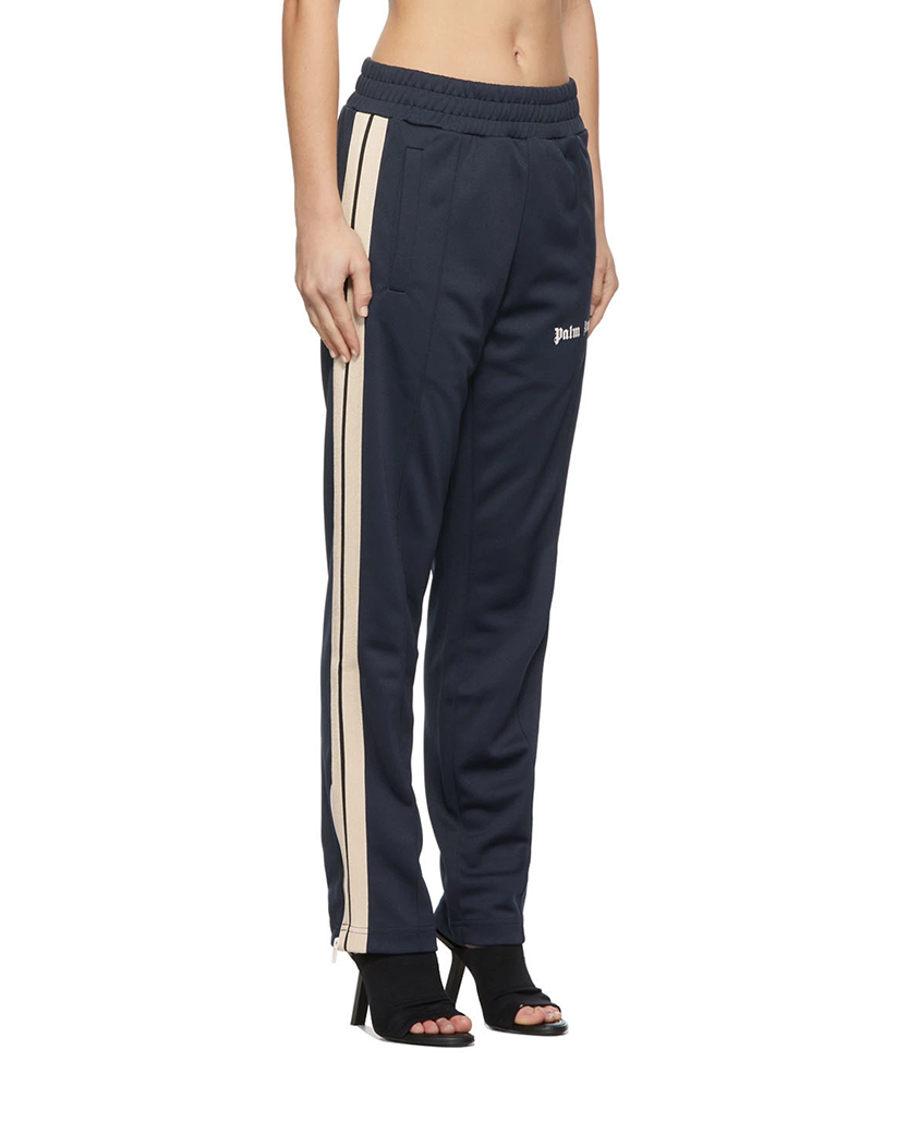 Palm Angels Track Pants — це спортивні штани з поліестеру, що поєднують комфорт і вуличну естетику бренду. Модель має прямий крій і середню посадку на талії, доповнену еластичним поясом для зручної фіксації. Шов спереду на штанинах надає структурності силуету, а застібки-блискавки на манжетах дозволяють регулювати ширину низу. Уздовж зовнішніх швів проходить чорно-біла трикотажна смуга, що підкреслює спортивний характер виробу. На передній частині штанини розташовано білий логотип Palm Angels.