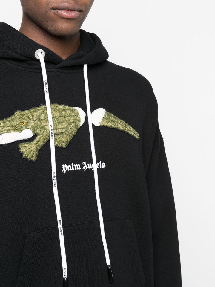 Худі чорного кольору Palm Angels Croco Hoodie з принтом крокодила та логотипом спереду. Це худі виготовлене з 100% бавовни, має капюшон на шнурку, кишеню кенгуру, ребристі манжети і поділ. Підкресліть свою індивідуальність з цим унікальним худі від Palm Angels.