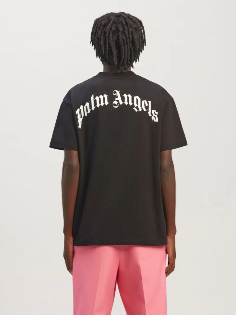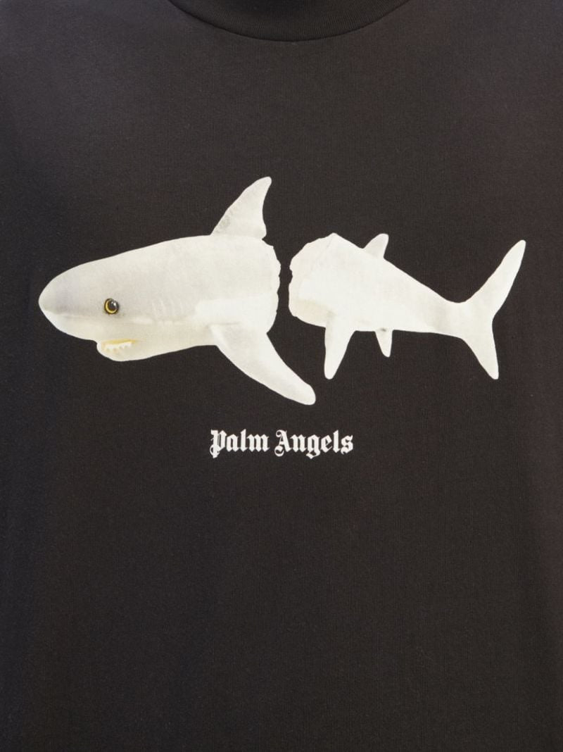 Чорна футболка з короткими рукавами від Palm Angels - ваш ідеальний вибір для стильного та комфортного вигляду. Спереду розташоване зображення акули, що надає вашому образу виразності та оригінальності. Логотип «Palm Angels», надрукований білим кольором на спині та спереду під принтом, додає стилю. Футболка виготовлена з 100% бавовни, що забезпечить вам комфорт у будь-який час дня.