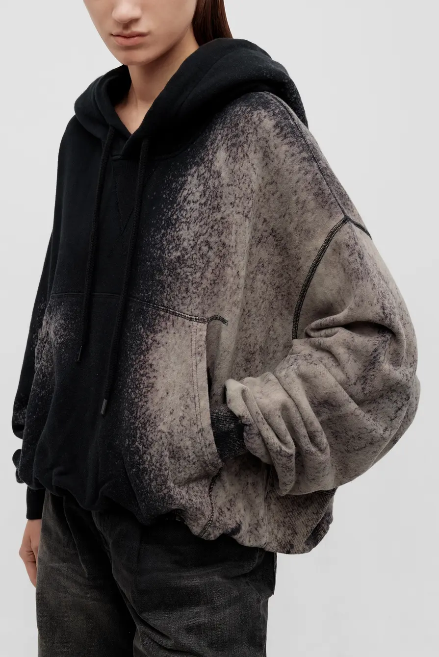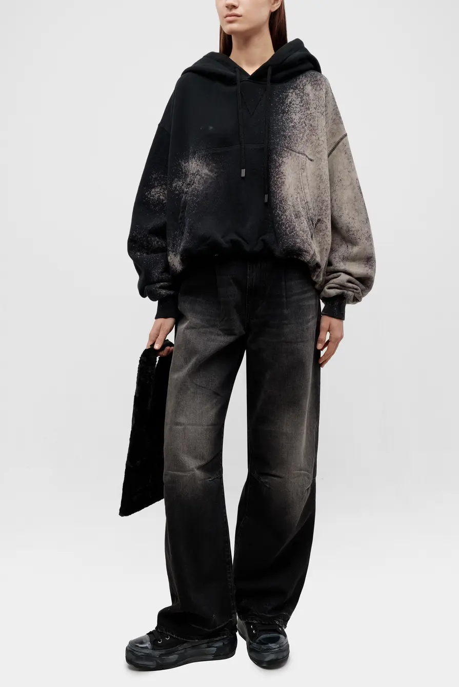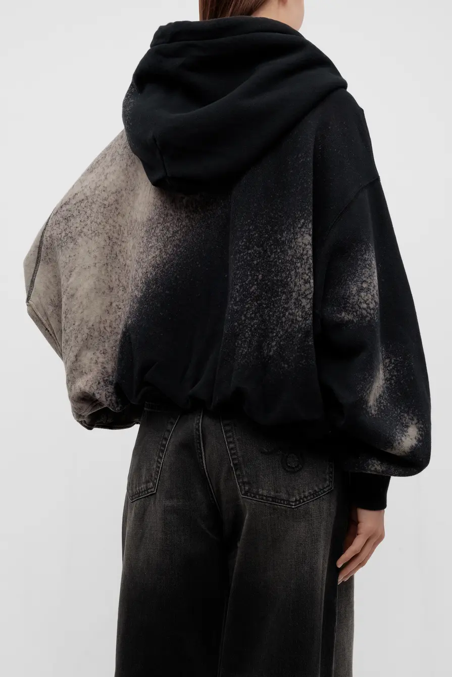 Чорне худі з вибіленим ефектом, зшите з м'якого бавовняного футера, має стильний оверсайз крій, що забезпечує комфорт і сучасний вигляд. Модель оснащена еластичним подолом для кращої посадки, довгими рукавами з манжетами, що дозволяють підтримувати тепло, та об'ємним капюшоном зі шнурком. Великою перевагою є зручна кишеня-кенгуру, що додає практичності та стилю. Худі ідеально підходить для повсякденних образів, поєднуючи комфорт з модним акцентом.