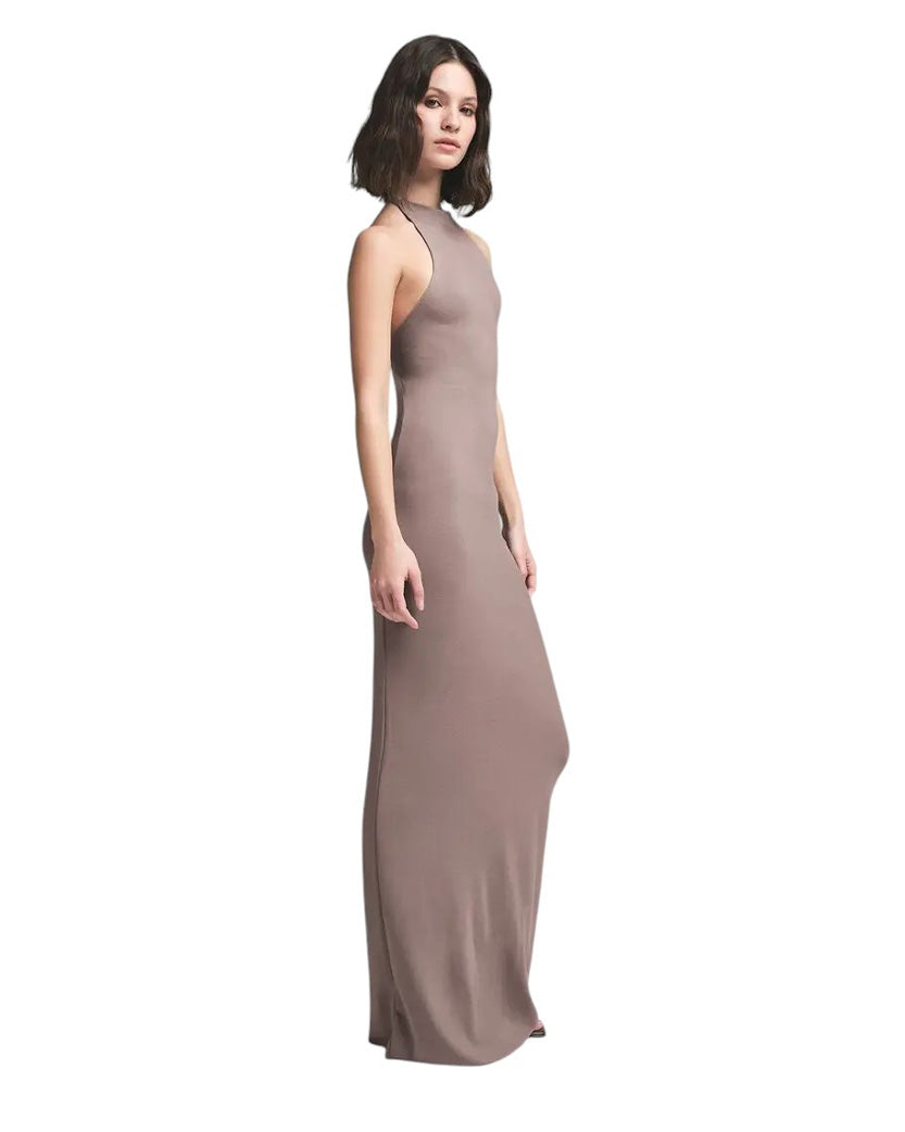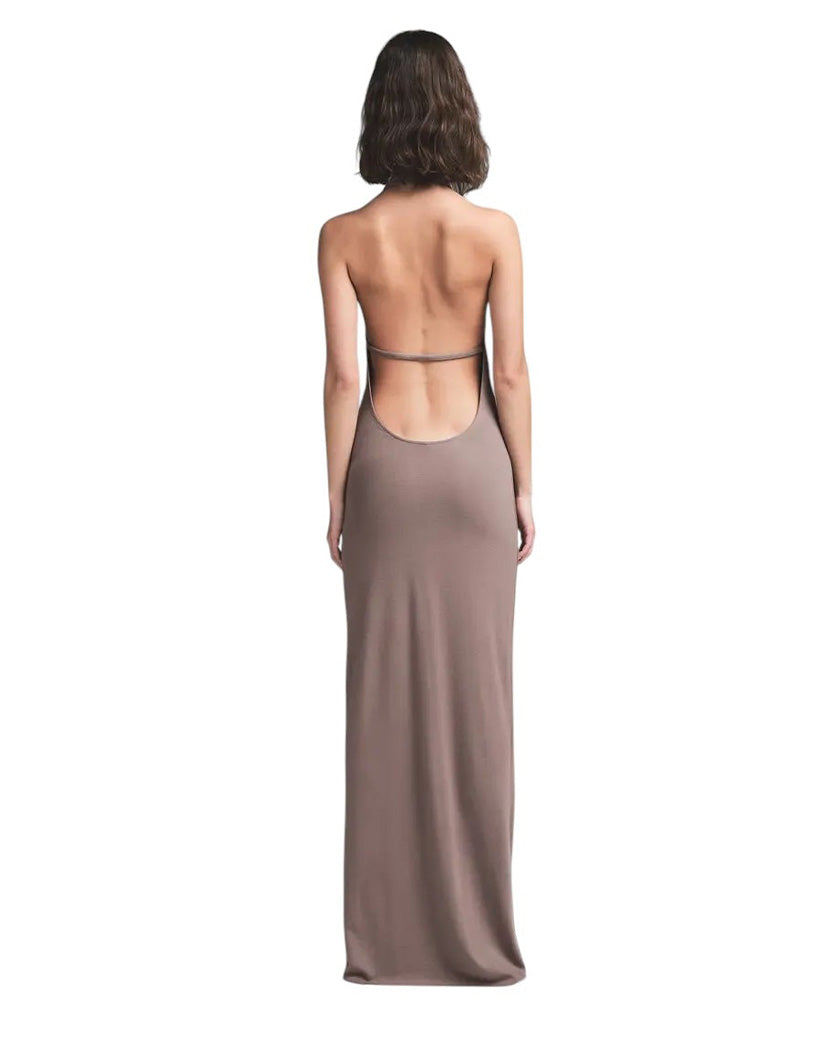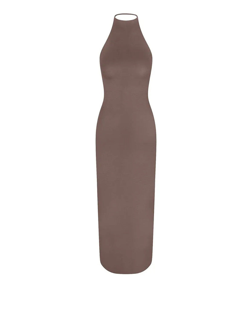 Сукня Skims Cloud Halter Long Dress — облягаюча максі-модель з неймовірно м’якої тканини «cloud fabric», із витонченою відкритою спинкою і тонкими бретелями. Лаконічний дизайн робить модель універсальною: її можна носити як для вечірніх виходів, так і для розслаблених денних образів.