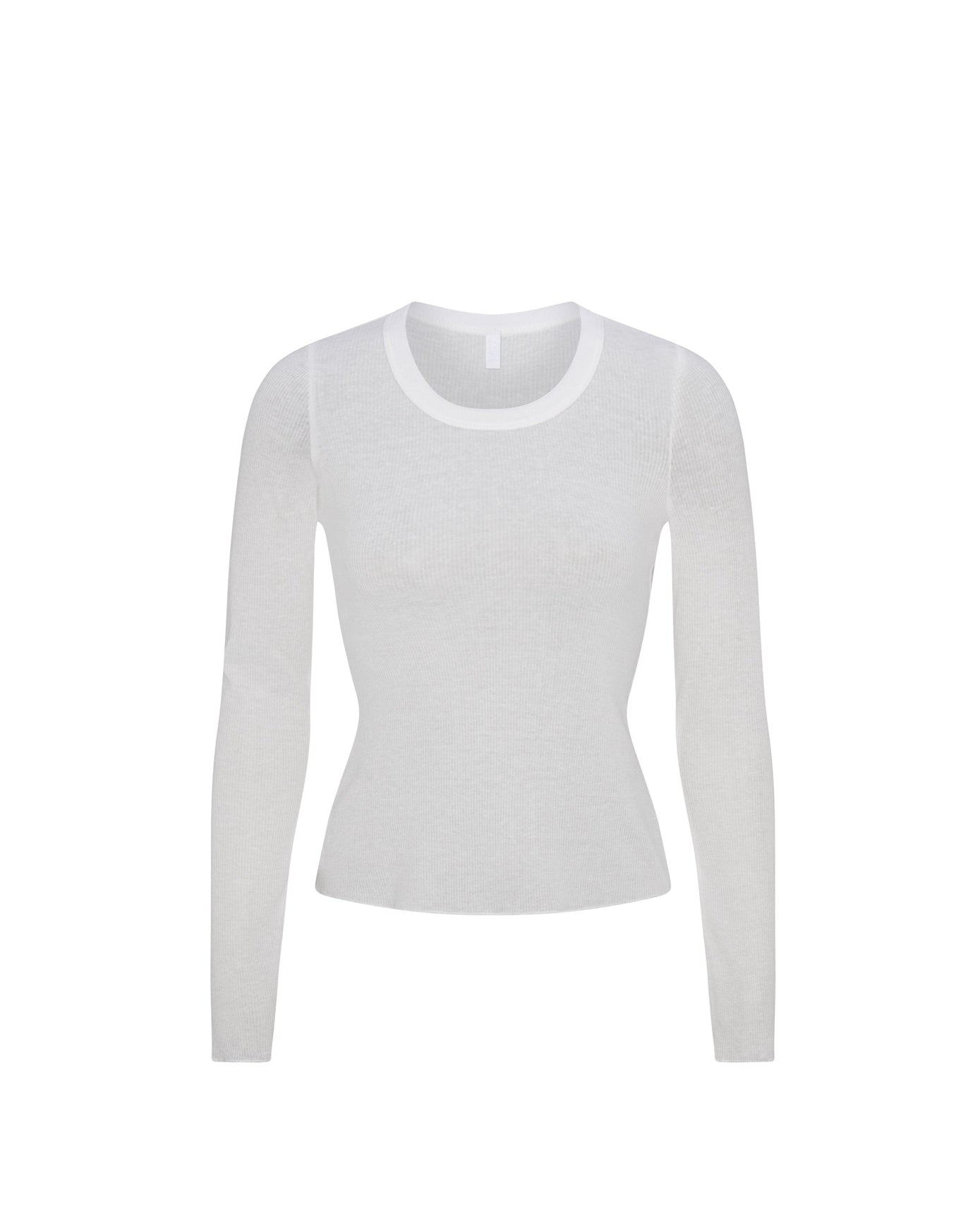 Skims Long Sleeve Crew Neck Top — легкий та комфортний лонгслів із м’якої, напівпрозорої ребристої тканини, що ніжно прилягає до тіла. Модель має широку круглу горловину, приталену посадку та акцентну контрастну строчку. Ідеальний для багатошарових образів або як самостійна база — універсальна річ на кожен день.