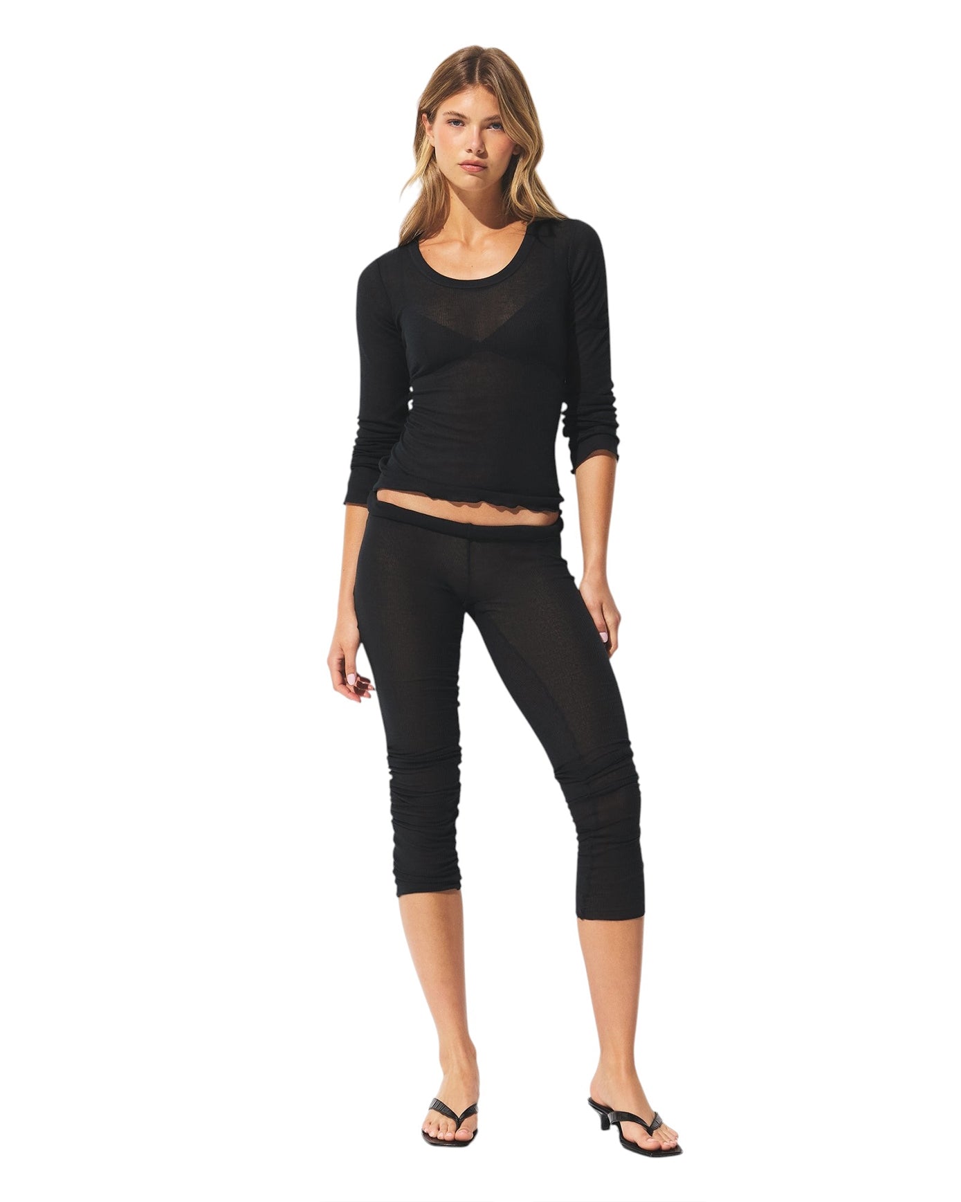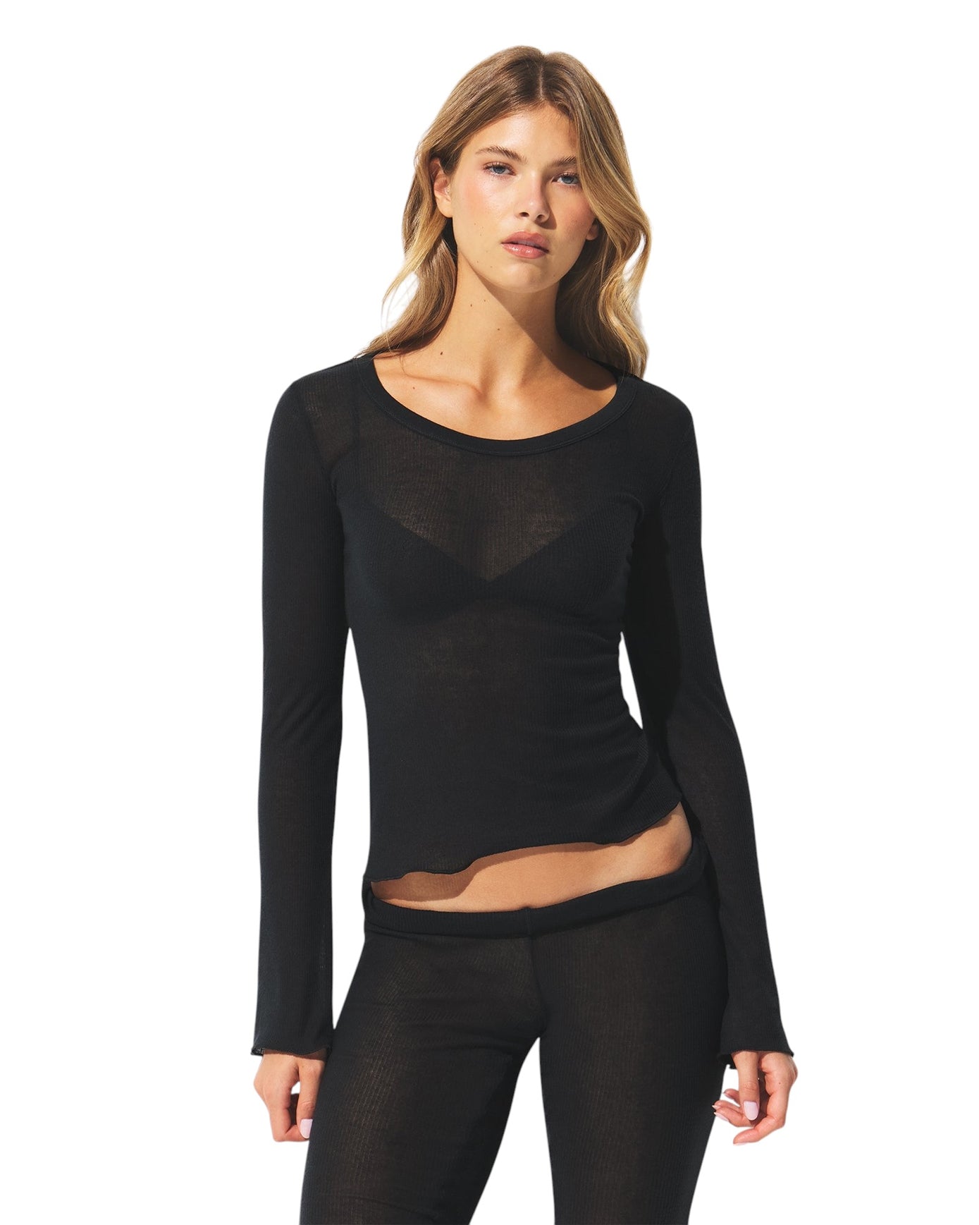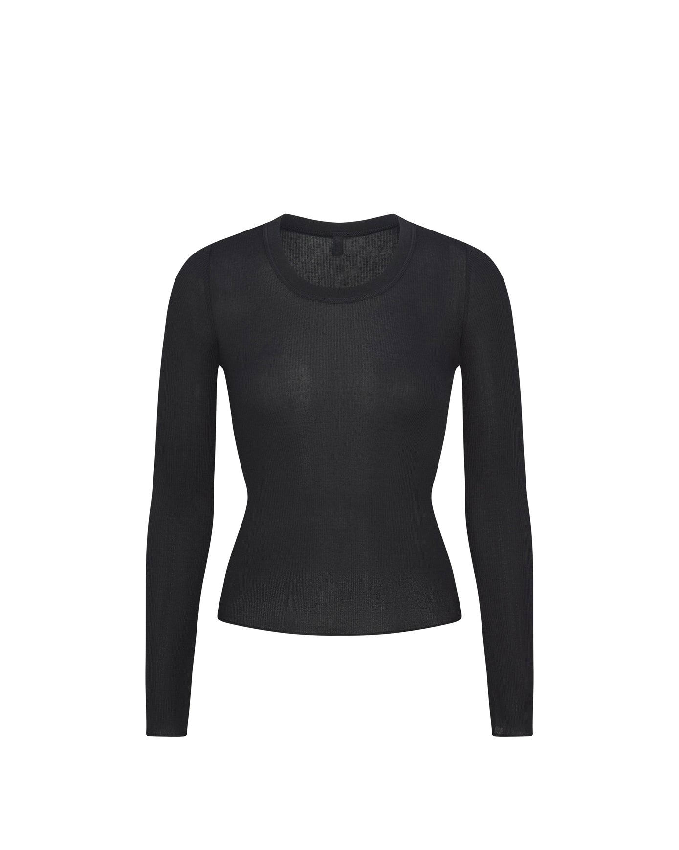 Skims Long Sleeve Crew Neck Top — легкий та комфортний лонгслів із м’якої, напівпрозорої ребристої тканини, що ніжно прилягає до тіла. Модель має широку круглу горловину, приталену посадку та акцентну контрастну строчку. Ідеальний для багатошарових образів або як самостійна база — універсальна річ на кожен день.