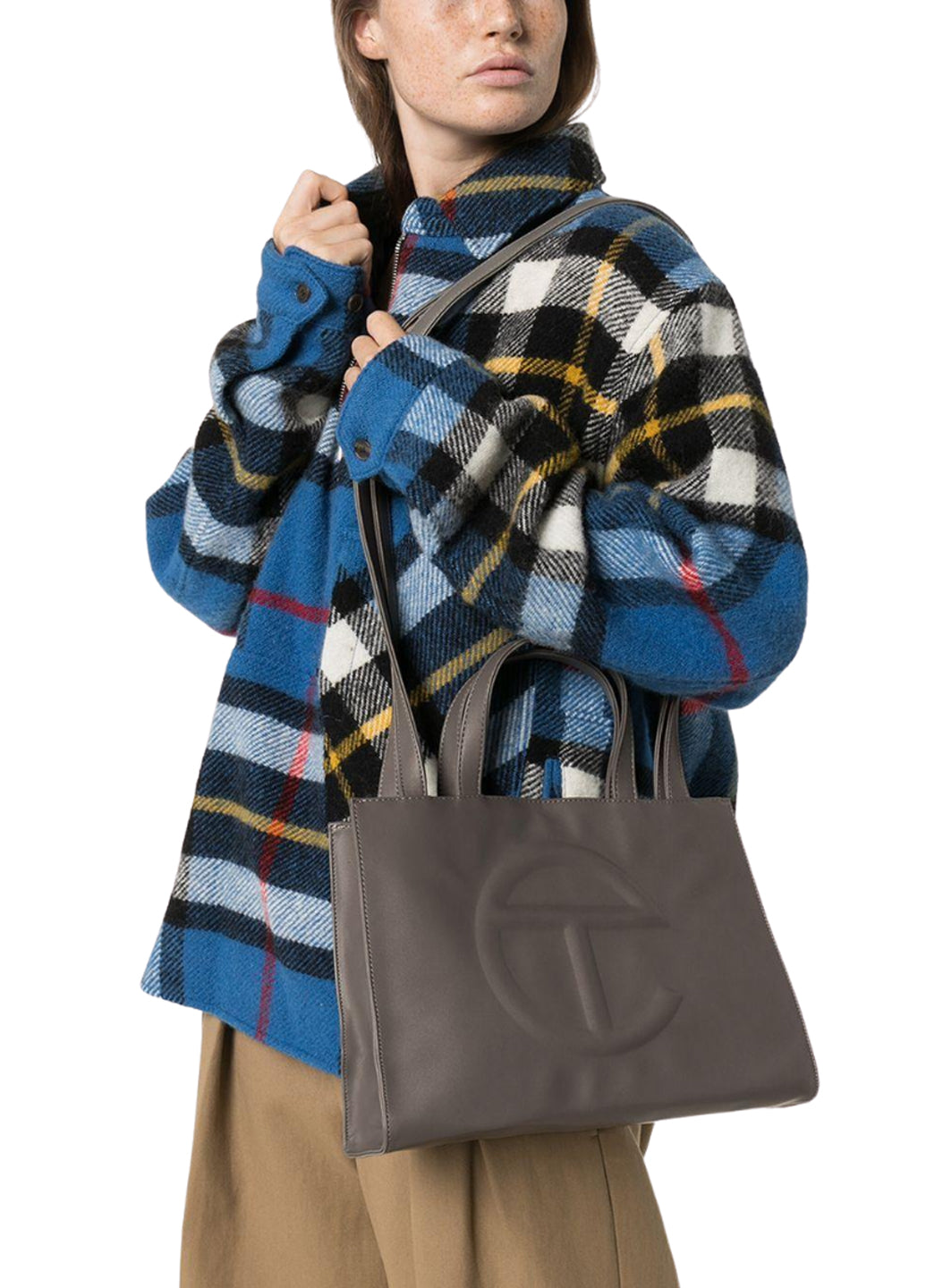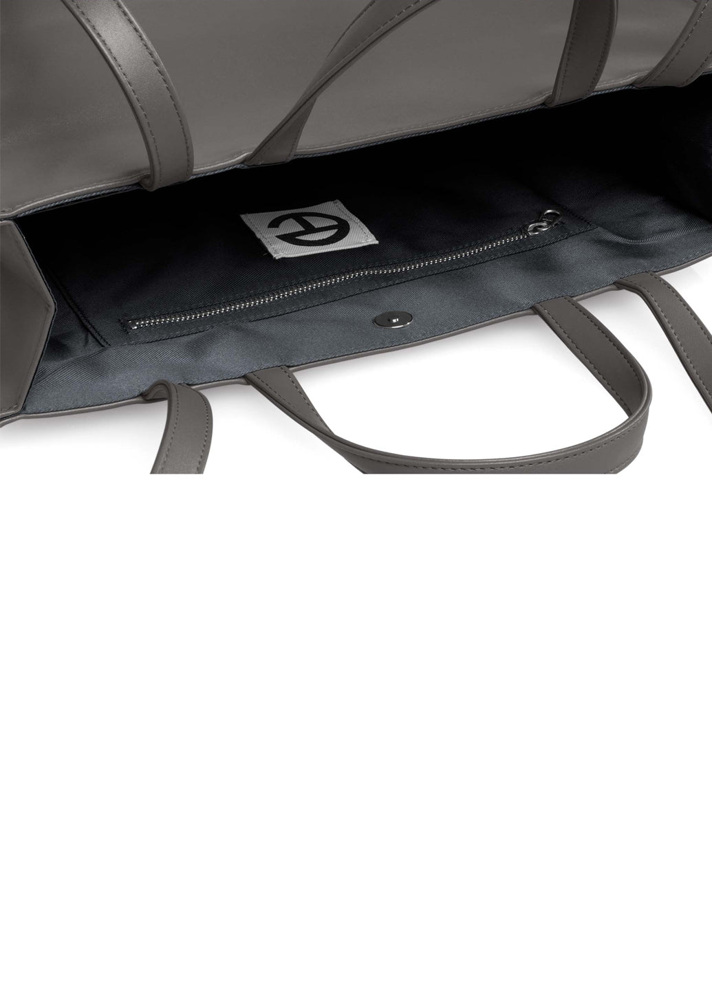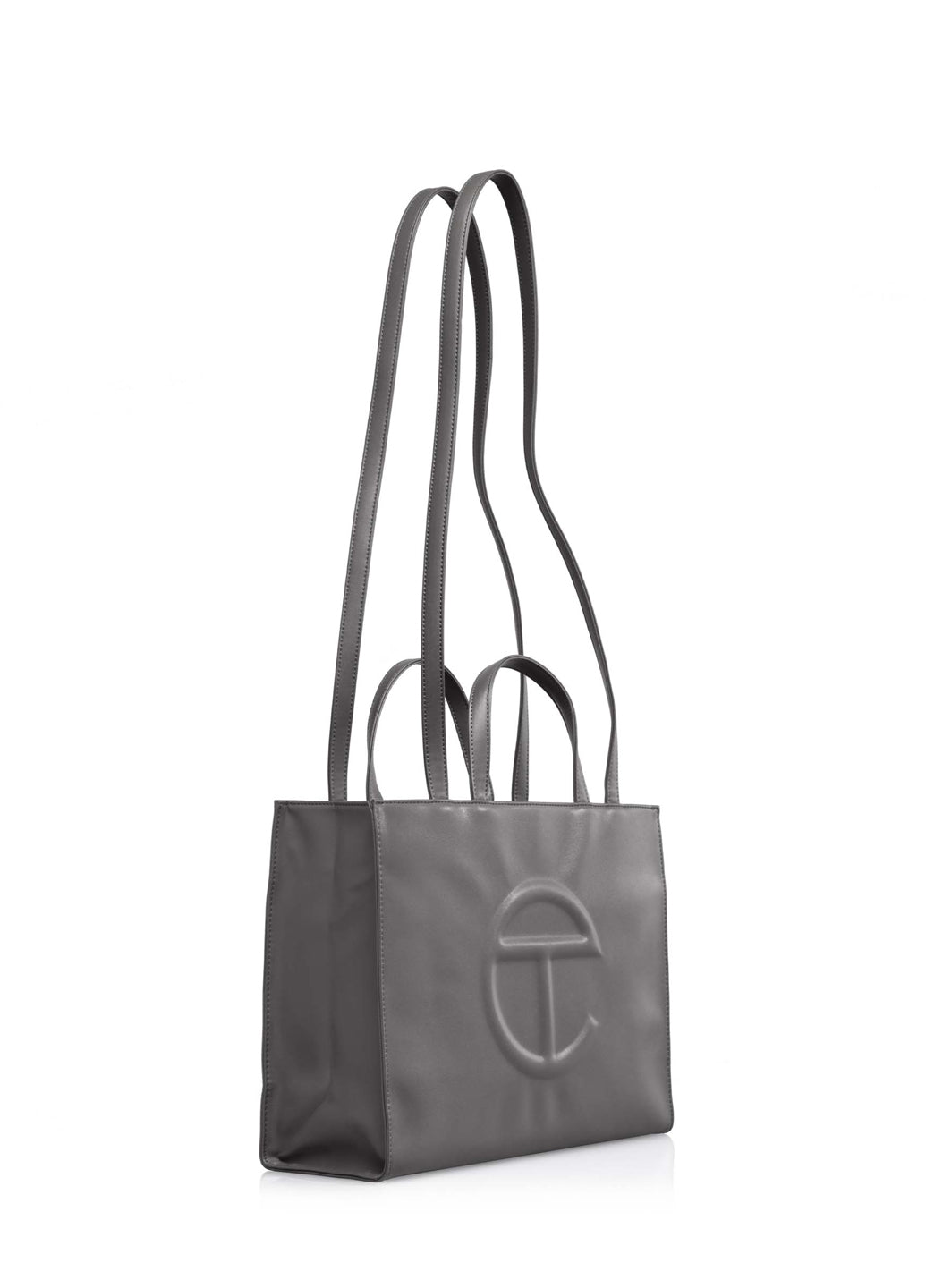 Культова сумка для покупок - практична сумка на кожен день. Вона має подвійні ремінці (ручки та ремінці через плече), тиснений логотип і магнітну застібку. Виготовлена зі штучної шкіри з підкладкою з твілу, сумка поставляється в мішечку зі шнурком з 100% бавовни із трафаретним логотипом.