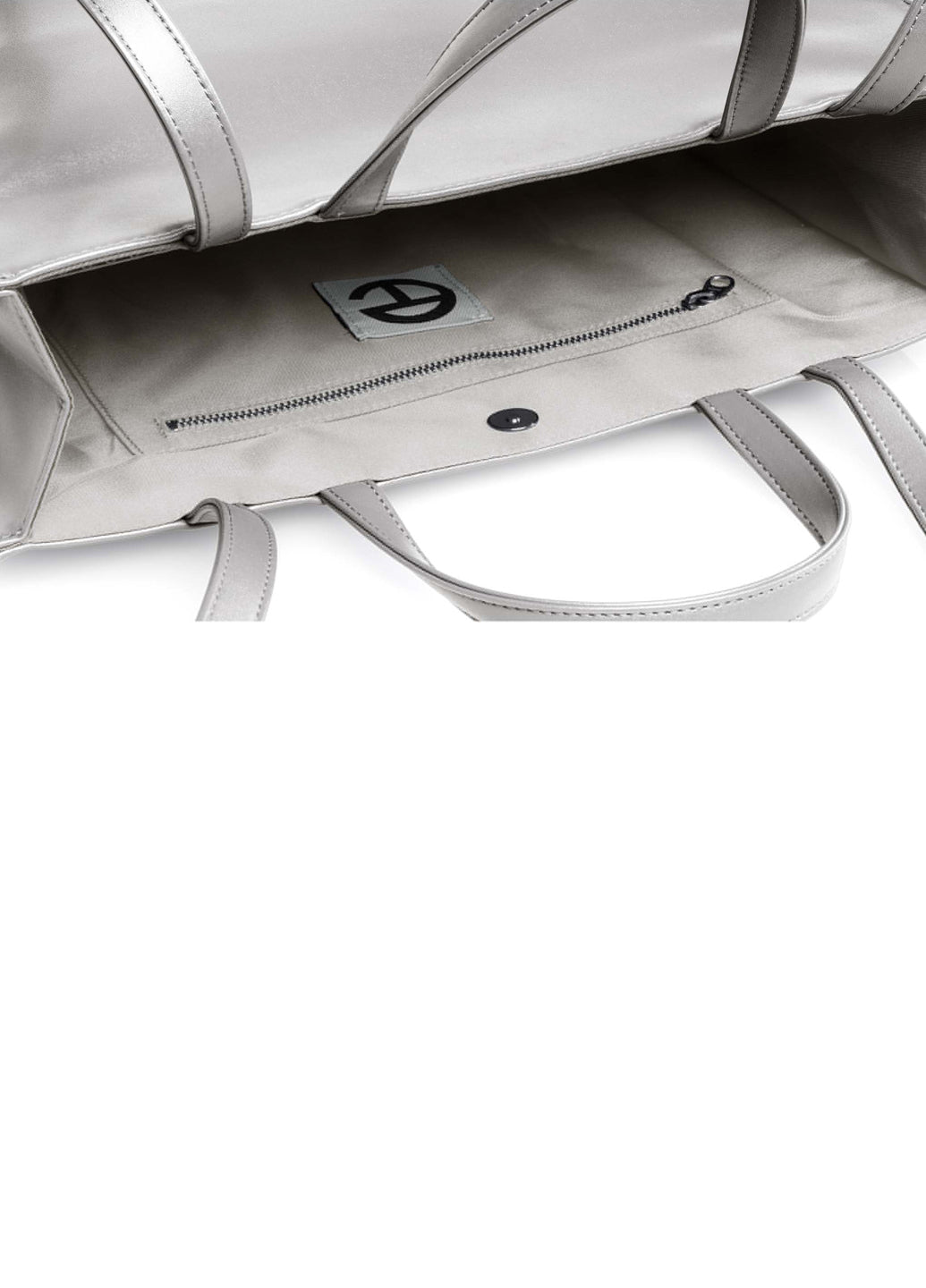 Культова сумка для покупок - практична сумка на кожен день. Вона має подвійні ремінці (ручки та ремінці через плече), тиснений логотип і магнітну застібку. Виготовлена зі штучної шкіри з підкладкою з твілу, сумка поставляється в мішечку зі шнурком з 100% бавовни із трафаретним логотипом.