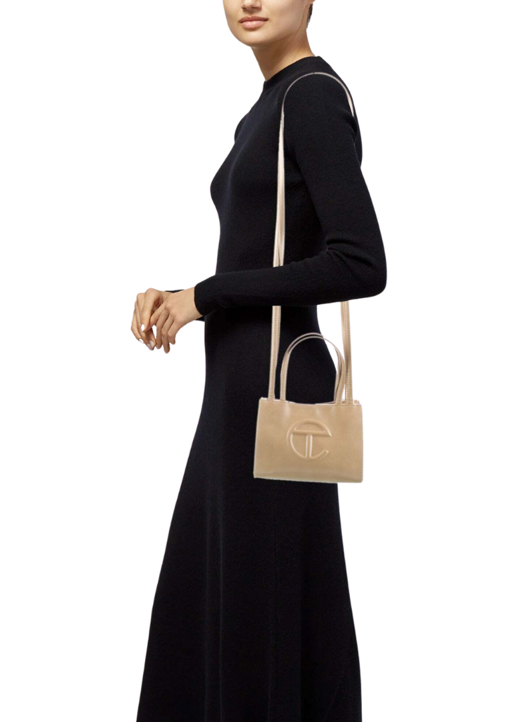 Культова сумка для покупок - практична сумка на кожен день. Вона має подвійні ремінці (ручки та ремінці через плече), тиснений логотип і магнітну застібку. Виготовлена зі штучної шкіри з підкладкою з твілу, сумка поставляється в мішечку зі шнурком з 100% бавовни із трафаретним логотипом.