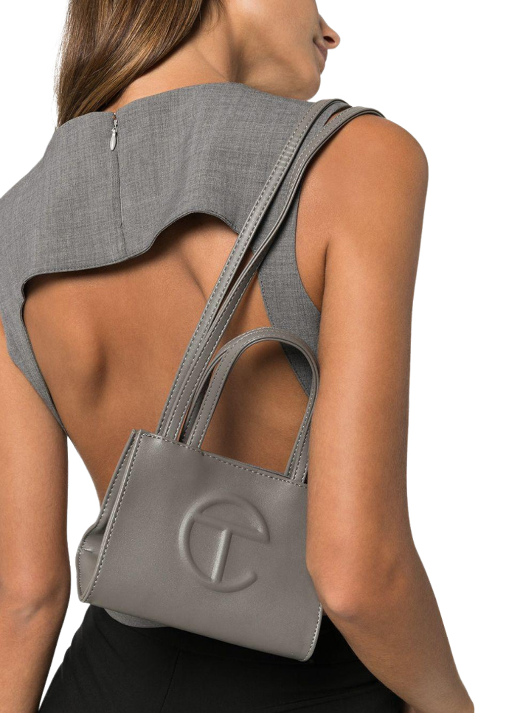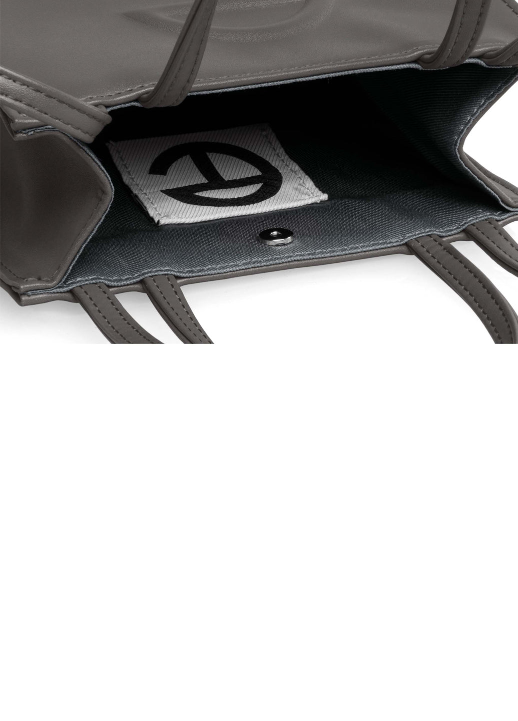 Культова сумка для покупок - практична сумка на кожен день. Вона має подвійні ремінці (ручки та ремінці через плече), тиснений логотип і магнітну застібку. Виготовлена зі штучної шкіри з підкладкою з твілу, сумка поставляється в мішечку зі шнурком з 100% бавовни із трафаретним логотипом.