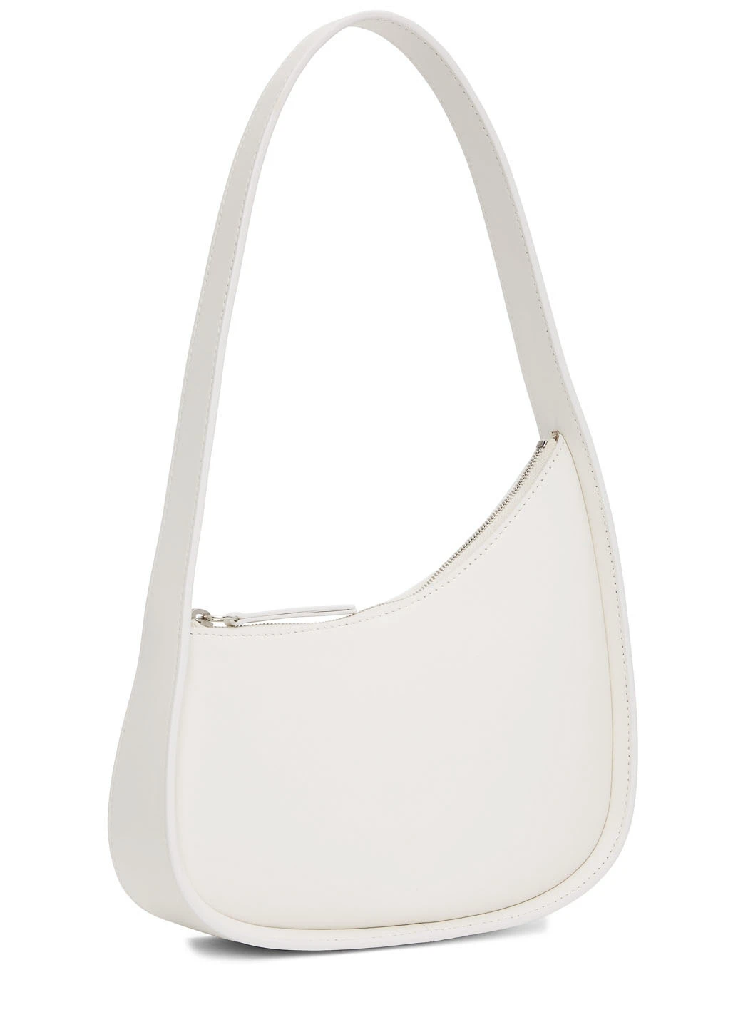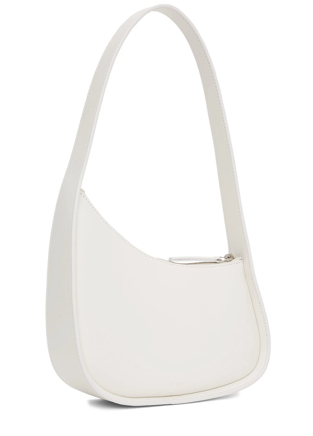 Ергономічна, напівжорстка сумка з гладкої натуральної шкіри з плоским плечовим ременем і вигнутою застібкою-блискавкою.
