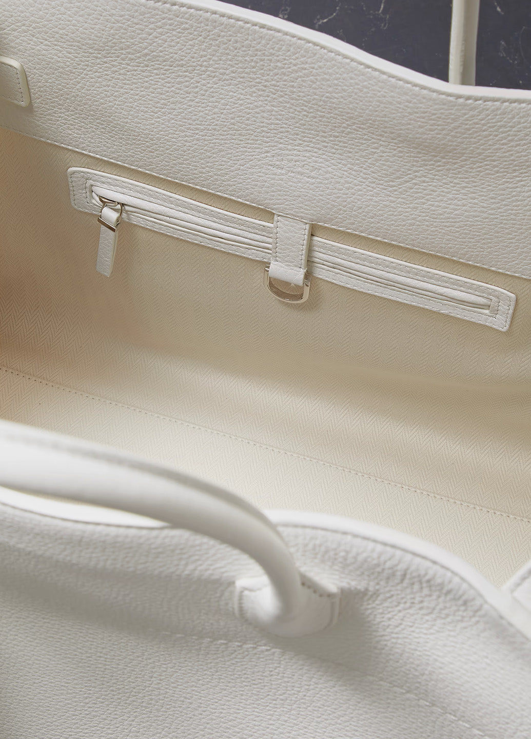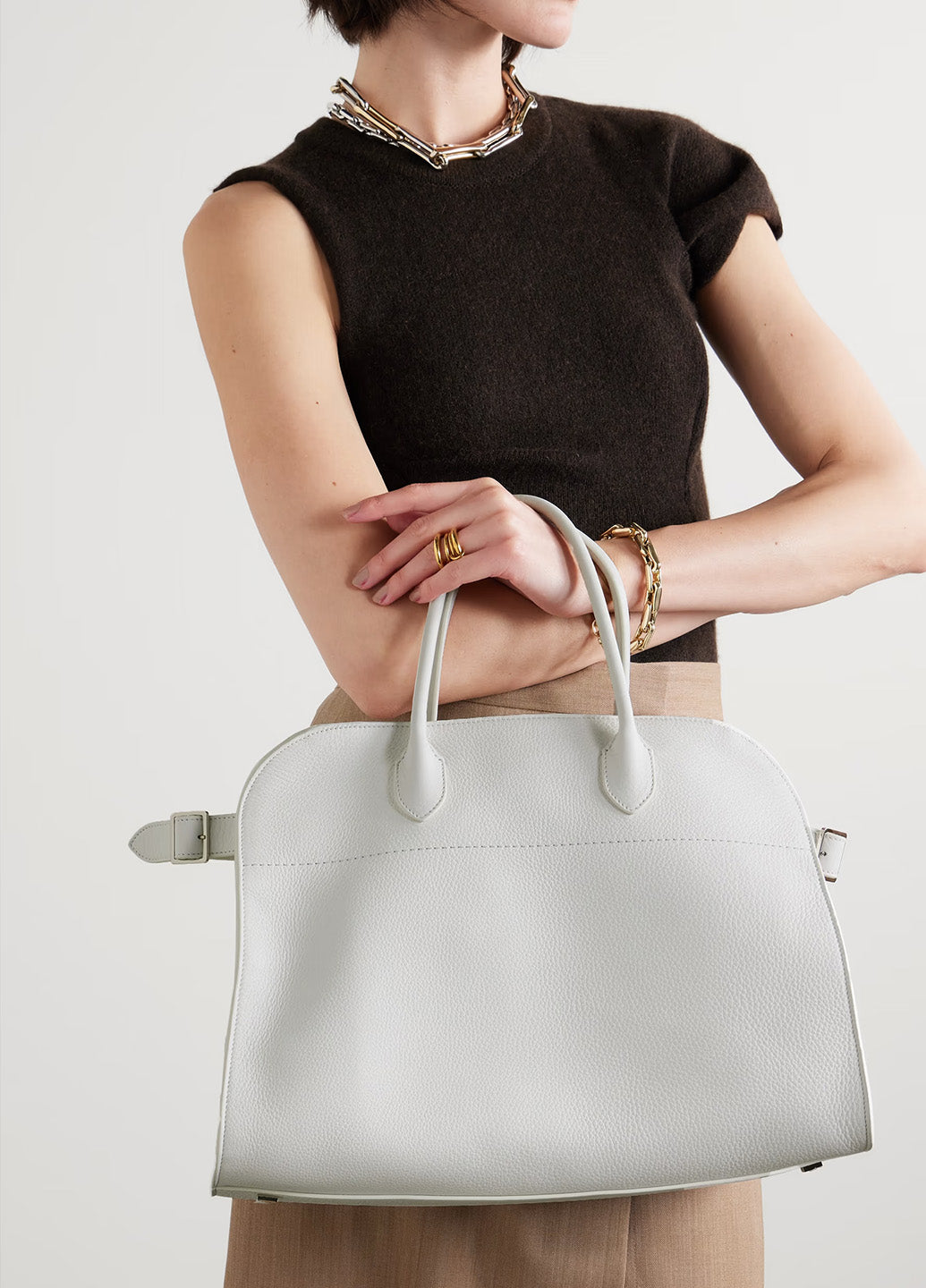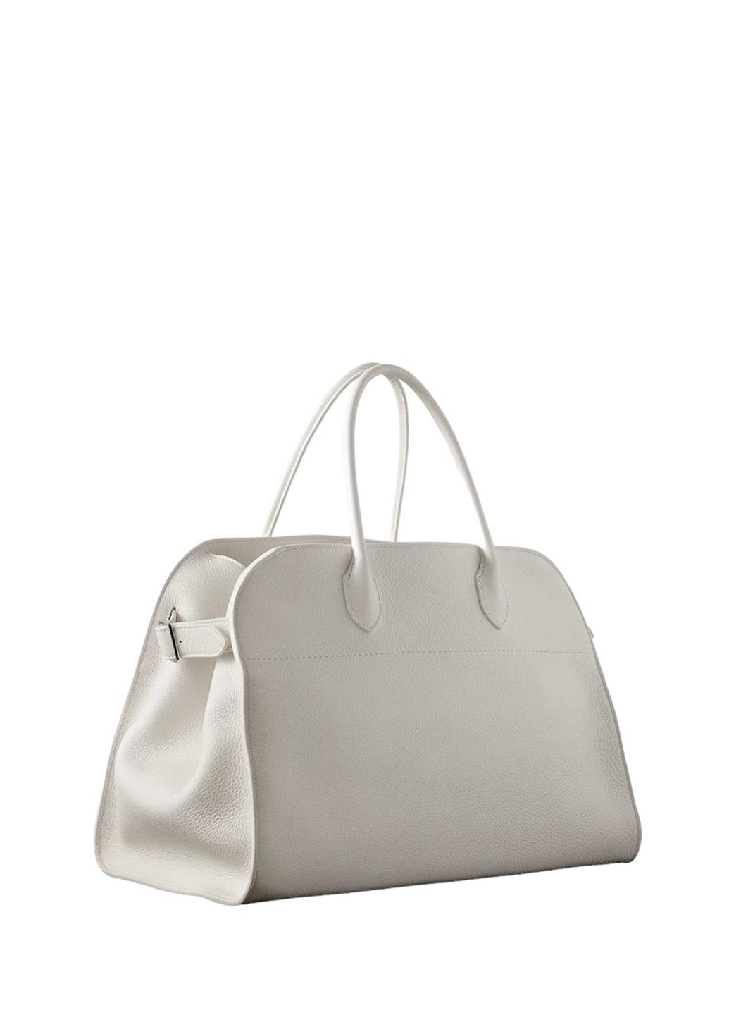 Сумка Margaux від The Row — це м’яка структурована модель з верхньою ручкою, виготовлена з натуральної зернистої шкіри. Вона має ремінні бічні панелі та внутрішню замкову застібку.
