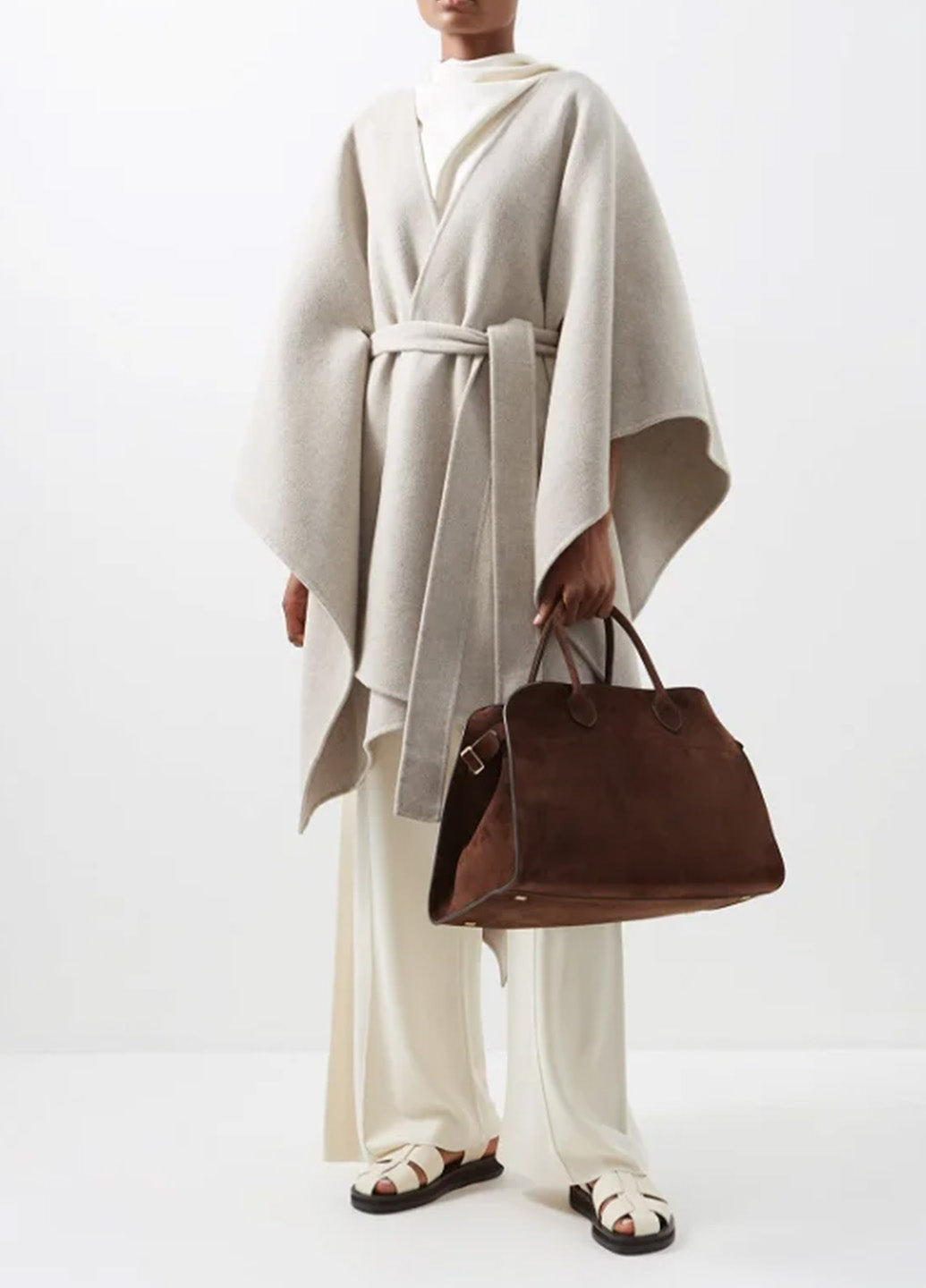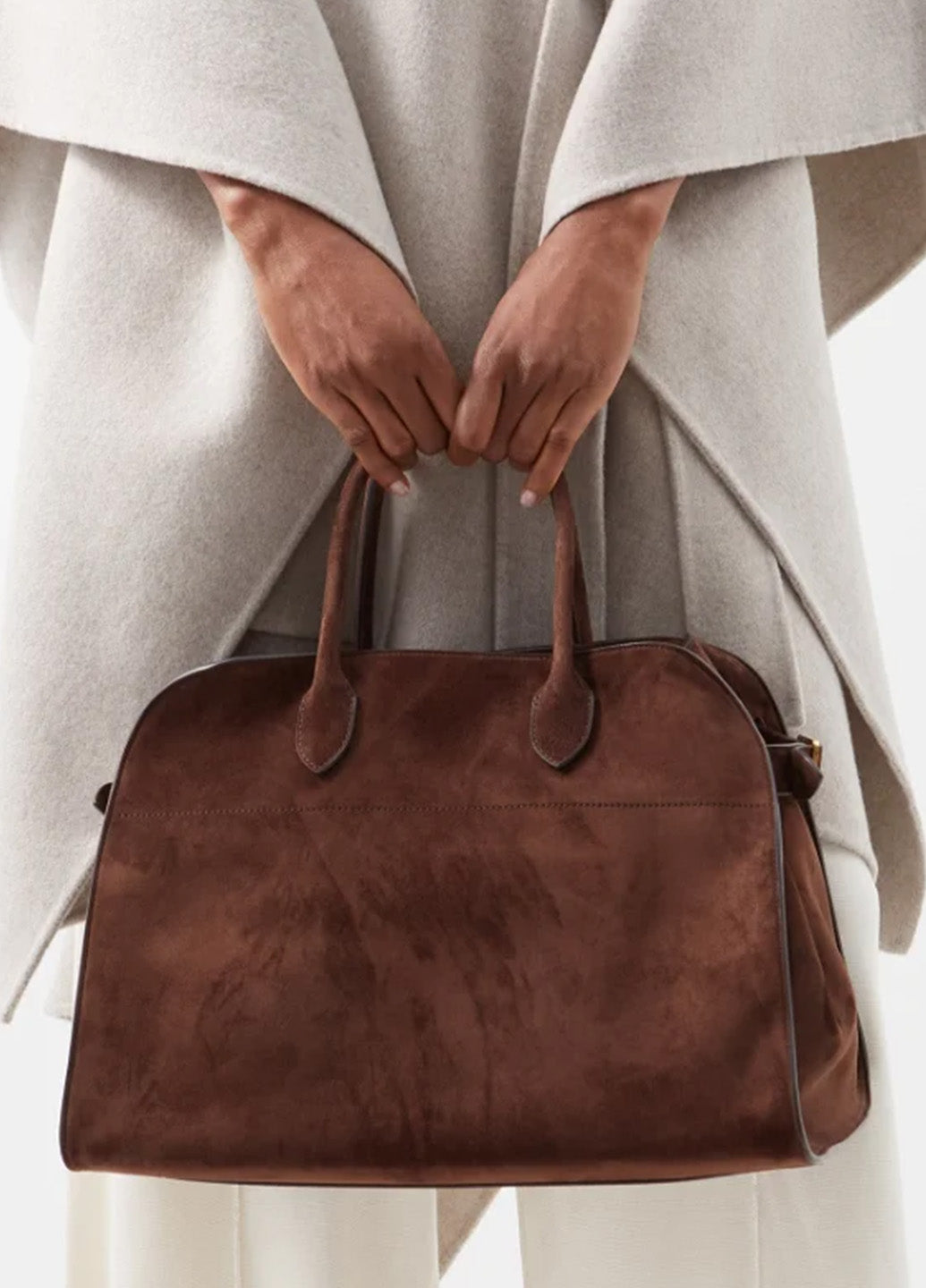Сумка Margaux 15 від The Row втілює мінімалістичний стиль бренду. Виготовлена в Італії з м’якої замші зі шкіряними деталями, вона має просторий внутрішній відсік із тонкою кишенею для карток або ключів. Її можна носити за верхні ручки або знімний плечовий ремінь для носіння через плече.